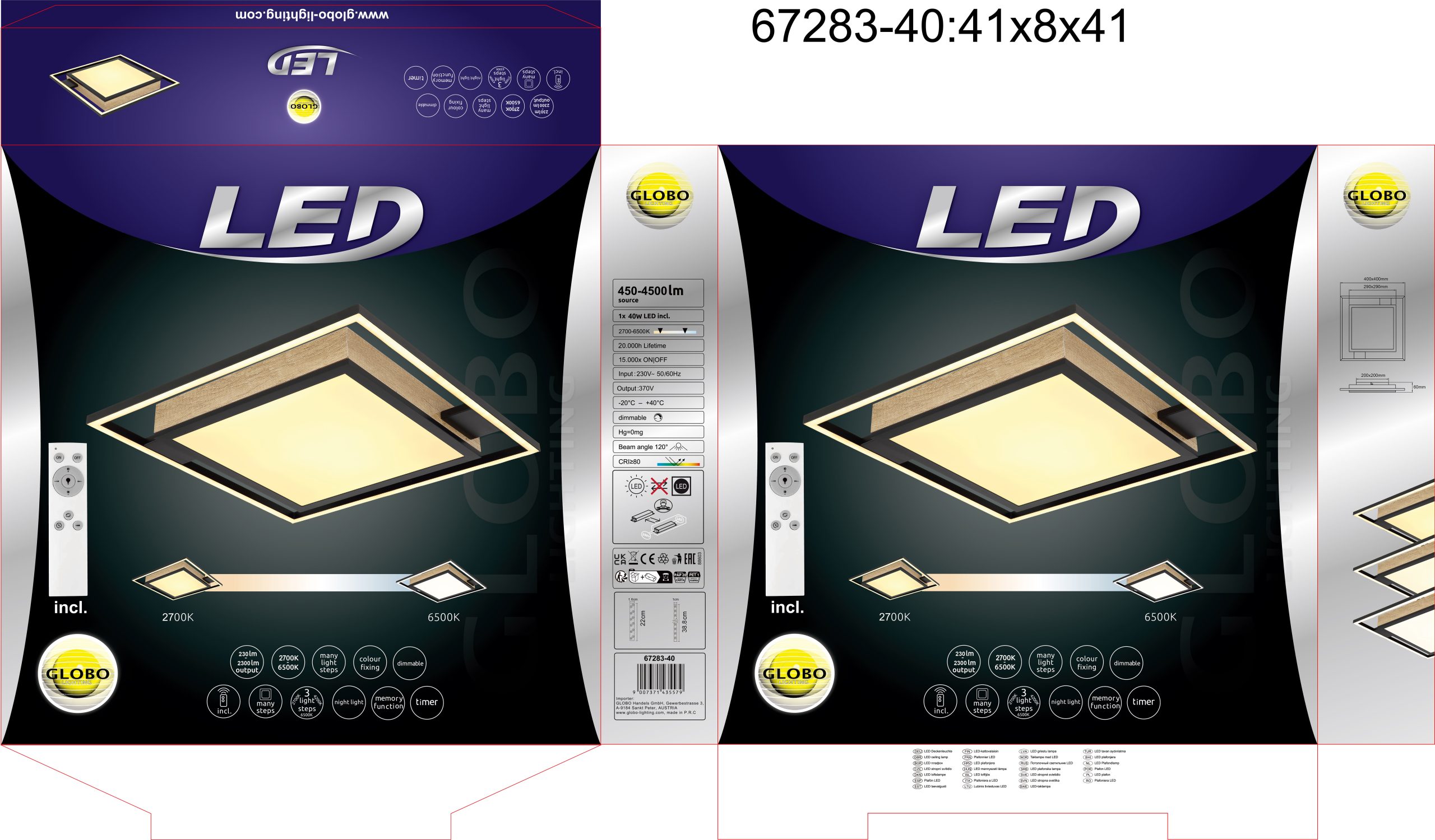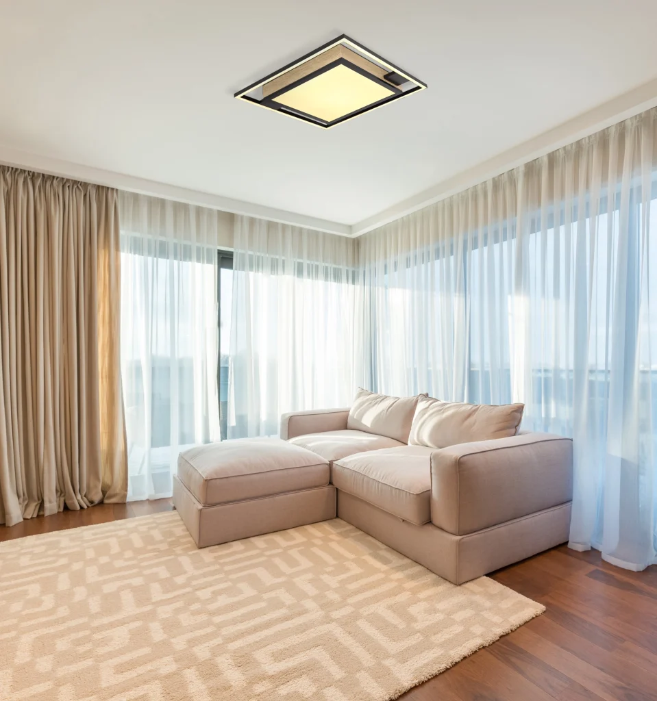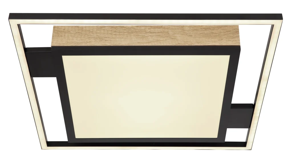 Plafonska lampa serije JORRY napravljena je od crnog mat metala i tamnog MDF-a u izgledu drveta, a abažur je napravljen od opal akrilnog stakla. Može se prigušiti i ima različite nivoe koji se mogu kontrolisati pomoću zidnog prekidača. Pored toga, moguće je fiksirati boju svetlosti, postoji funkcija memorije, noćno svetlo i tajmer. Uključen je daljinski upravljač, kao i dve AAA baterije. Dimenzije su 400x400x60 mm, a lampa sadrži LED diodu od 40 W sa intenzitetom svetlosti od 450-4500 lm izvora i izlazom od 230-2300 lm. Temperatura boje se može podesiti između 2700-6500K.