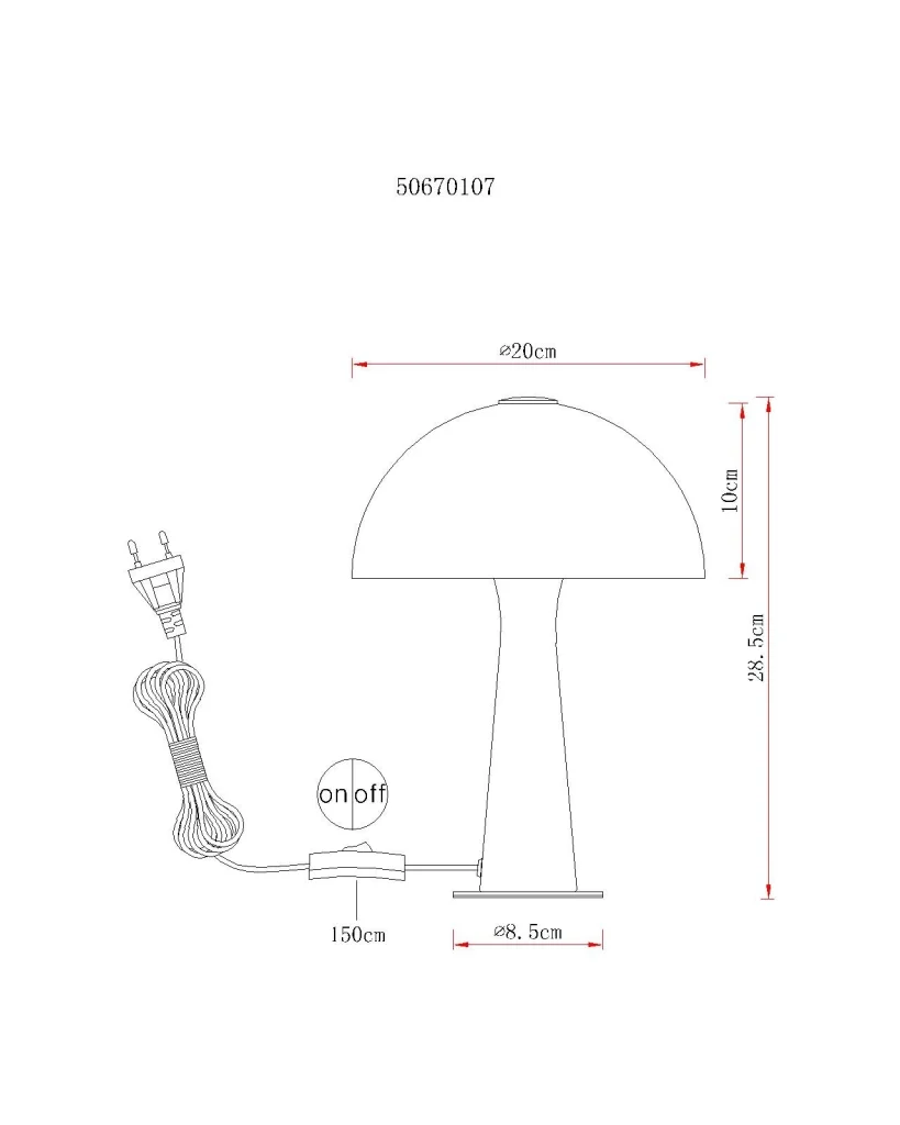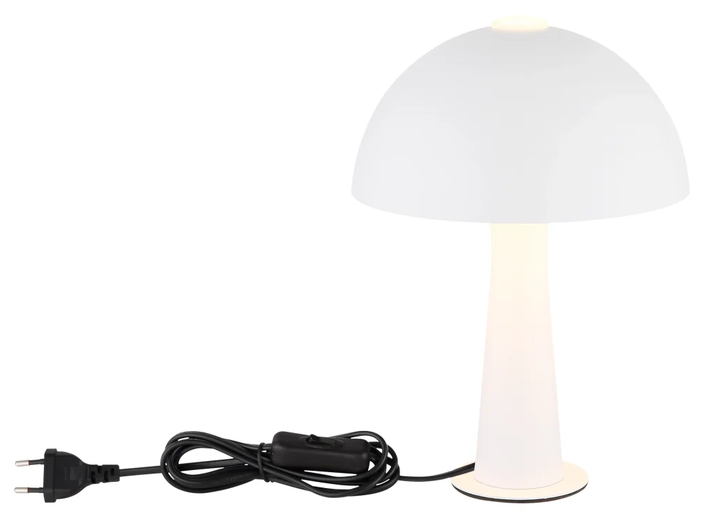 Stona lampa JULIA oduševljava svojim bezvremenskim oblikom pečurke i čistim, modernim izgledom. Okruglo telo od mat belog metala harmonično se stapa sa odgovarajućim metalnim abažurom, dajući lampi elegantan i smiren izgled. Zahvaljujući jednostavnom dizajnu, JULIA se bez napora uklapa u širok spektar stilova enterijera – od modernog i skandinavskog do minimalističkog. Sa prečnikom od 200 mm, stona lampa deluje kompaktno, ali prisutno i idealna je za noćne stočiće, komode, police ili stolove. Praktični prekidač na kablu omogućava praktično rukovanje i lako uključivanje i isključivanje. Zahvaljujući grlu E14, možete pojedinačno odabrati izvor svetlosti i podesiti osvetljenost i boju svetlosti prema vašim ličnim željama. Bilo da je u pitanju toplo ambijentalno svetlo za prijatne večeri ili suptilno akcentno osvetljenje u dnevnoj sobi, JULIA nudi fleksibilan dizajn osvetljenja sa stilskim karakterom.