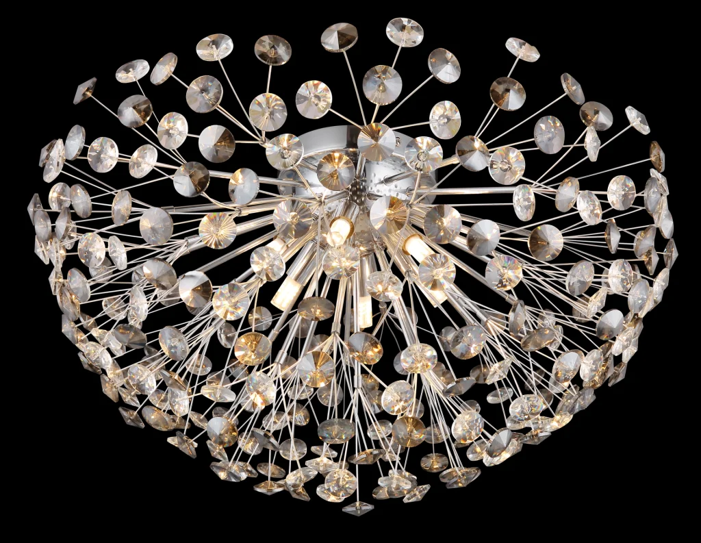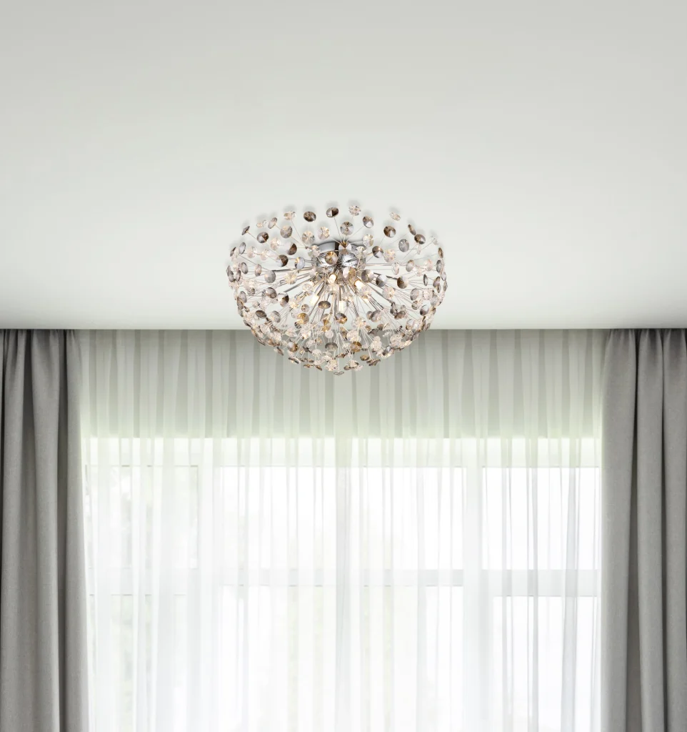 Plafonska lampa „KATRINA“ kombinuje klasičan dizajn sa modernom elegancijom. Njen okrugli, hemisferični abažur napravljen od dimljenih i providnih K9 kristala ne samo da nudi impresivno prelamanje svetlosti, već i stilski eksterijer. Telo od hromiranog metala ističe visokokvalitetnu izradu i daje lampi plemeniti sjaj. Opremljena sa 6XG9 LED sijalica, plafonska lampa emituje toplo belo svetlo sa temperaturom boje od 3000K i proizvodi snaga od 350 lumena. Ova kombinacija kvaliteta svetlosti i dizajna čini je idealnom za upotrebu u dnevnim sobama, hodnicima ili spavaćim sobama, gde ne služi samo kao izvor svetlosti, već deluje i kao dekorativni element. „KATRINA“ je savršen izbor za one koji cene klasičnu estetiku sa modernom tehnologijom i visokokvalitetnim materijalima.