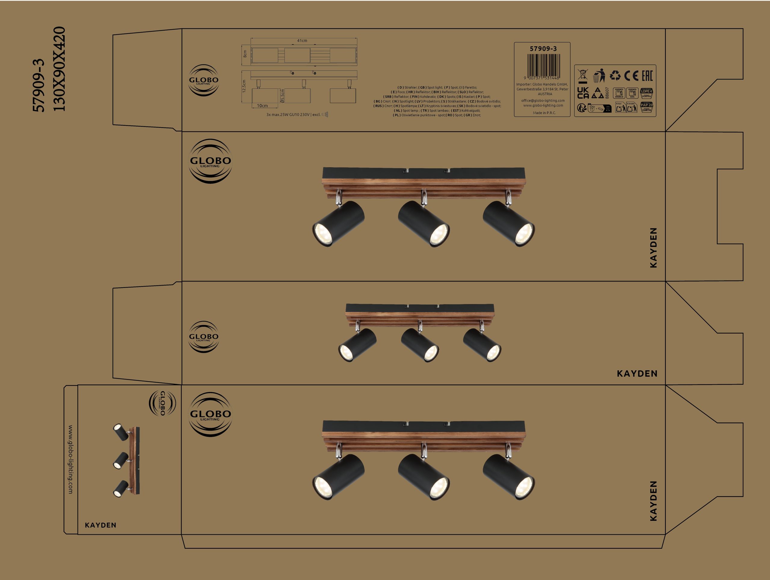 Zidna lampa KAYDEN je stilski komad nameštaja koji kombinuje moderan dizajn sa prirodnim akcentima. Pravougaona metalna zidna tabla u mat crnoj boji upotpunjena je elegantnom drvenom aplikacijom od tamnosmeđeg drveta, što lampi daje topao i bezvremenski izgled. Cilindrični reflektori, takođe napravljeni od mat metala, mogu se fleksibilno podesiti i omogućavaju usmeravanje svetlosti posebno za pojedinačne svetlosne efekte. Sa dužinom od 410 mm, širinom od 80 mm i visinom od 125 mm, lampa se savršeno uklapa na zidove u hodnicima, dnevnim sobama ili radnim prostorima. Reflektor KAYDEN se isporučuje bez sijalice i opremljen je GU10 grlima tako da možete izabrati pravu sijalicu prema vašim potrebama. Sa svojim modernim i funkcionalnim dizajnom, zidna lampa KAYDEN je vrhunac svakog doma.