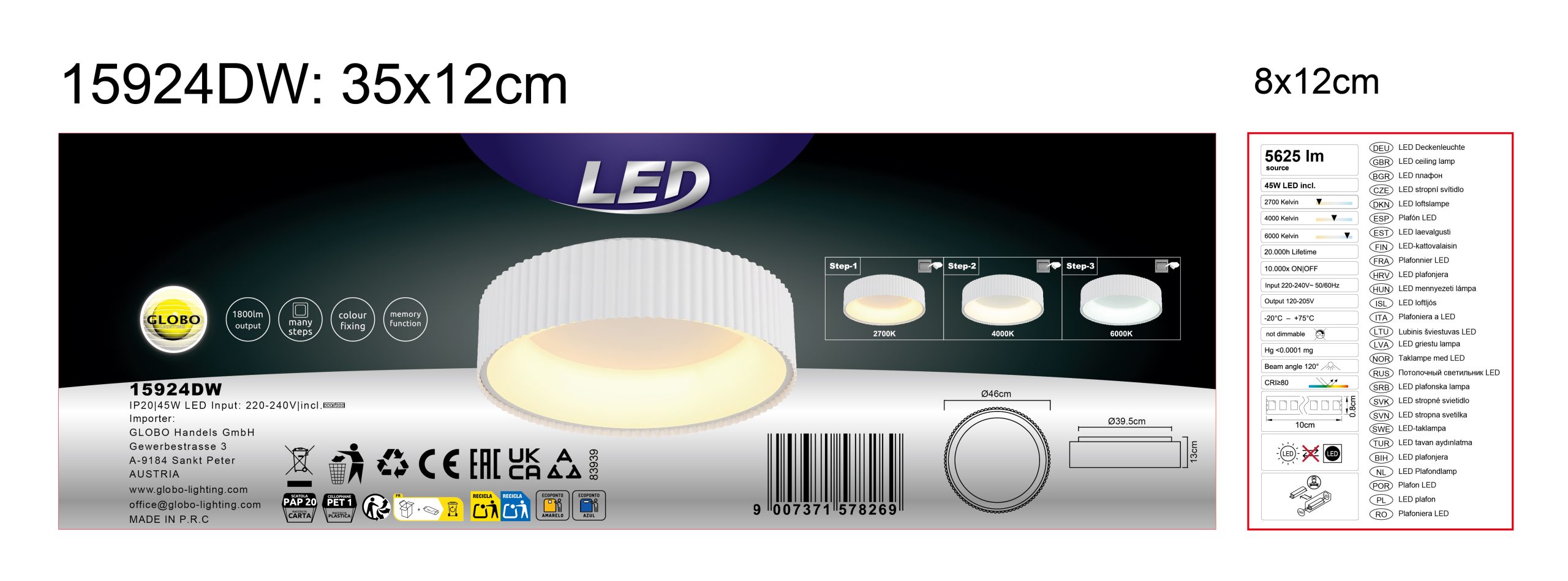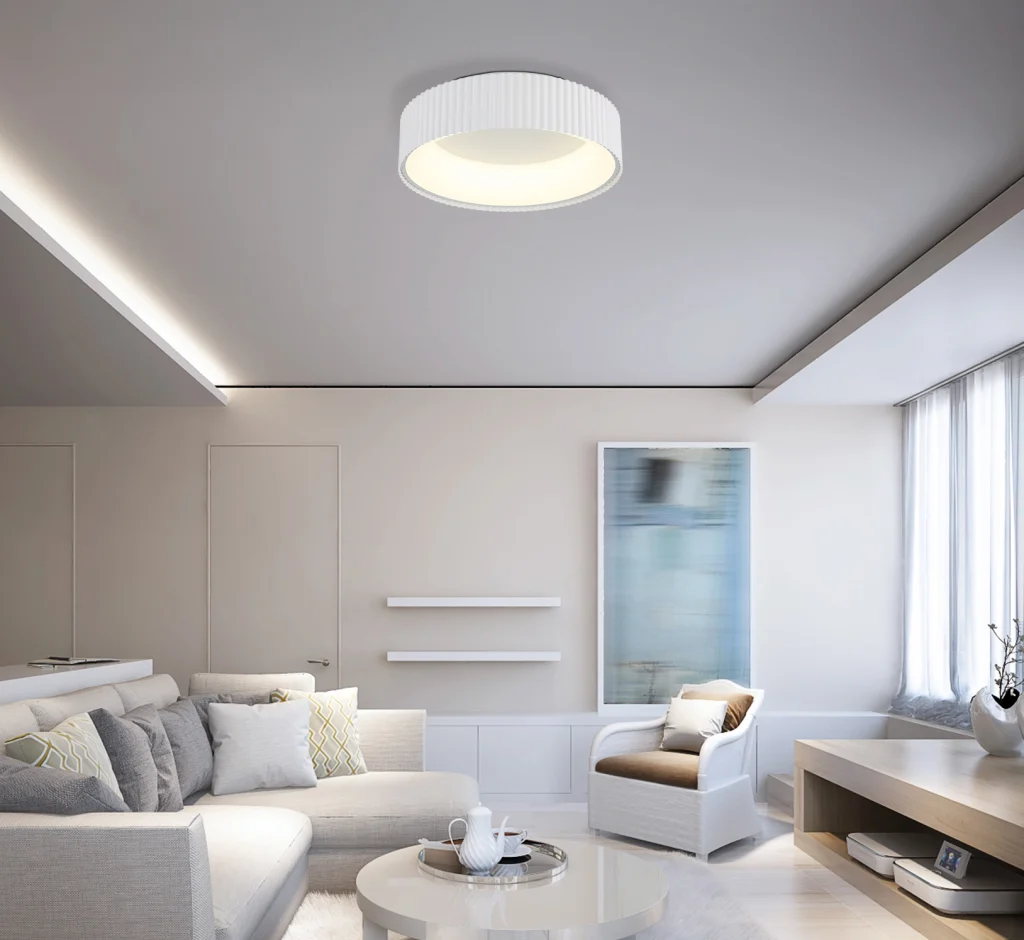 Okrugla plafonska lampa KEMP impresionira svojim elegantnim dizajnom, koji je posebno stilski zahvaljujući talasastom metalnom prstenu u mat beloj boji. Telo i abažur su napravljeni od mat belog metala i savršeno se usklađuju sa opal akrilom, koji obezbeđuje ravnomernu raspodelu svetlosti bez odsjaja. Sa svetlosnim izlazom od 1800 lumena, lampa nudi svetlo i prijatno osvetljenje koje je idealno za dnevne i radne prostore. Temperatura boje se može podesiti od toplo bele (2700 K) do hladno bele (6000 K) i može se pojedinačno fiksirati, što vam omogućava da kreirate raspoloženje osvetljenja tačno onako kako želite. Praktična funkcija memorije pamti poslednje izabrano podešavanje, dodatno povećavajući jednostavnost korišćenja. Uključujući modernu, energetski efikasnu LED tehnologiju, plafonska lampa KEMP kombinuje moderan dizajn sa visokom funkcionalnošću i stvara prijatnu atmosferu u svakoj prostoriji.