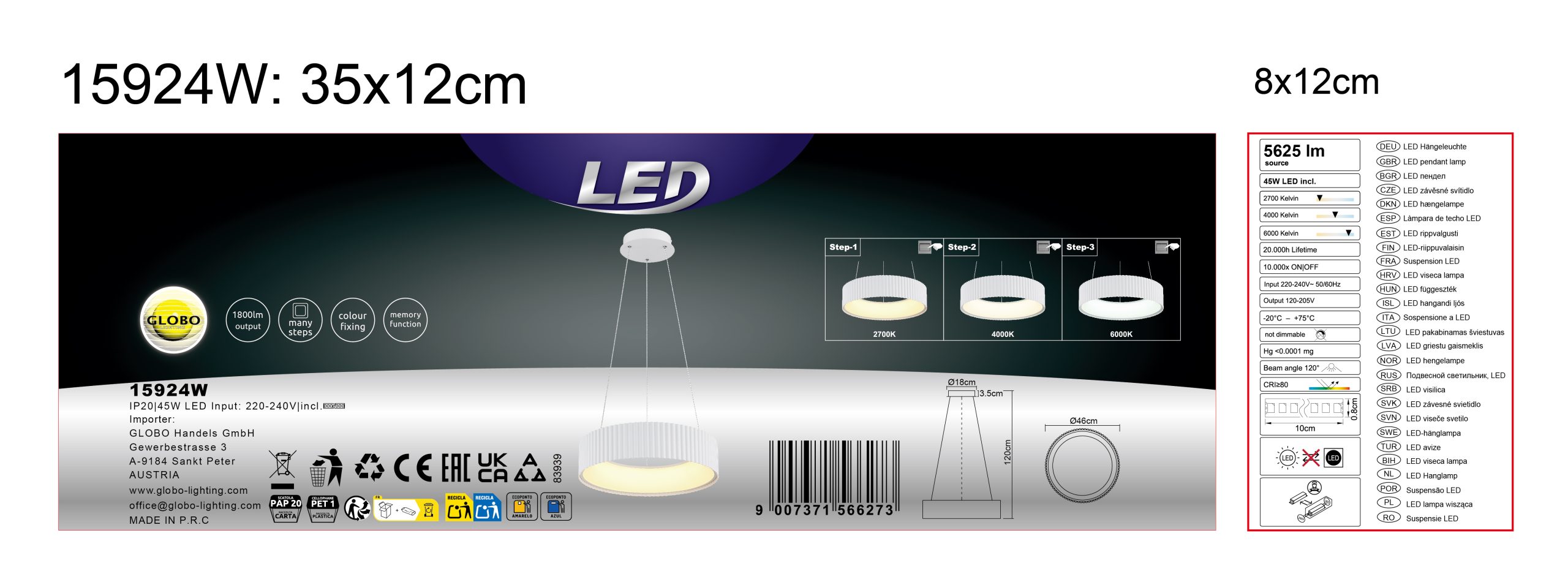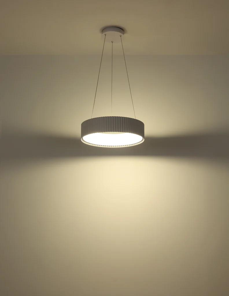 Okrugla viseća lampa KEMP impresionira svojim modernim dizajnom sa elegantnim, talasastim metalnim prstenom u mat beloj boji. Telo i abažur od mat belog metala savršeno se usklađuju sa opalnim akrilnim abažurom, koji obezbeđuje meku raspodelu svetlosti bez odsjaja. Sa svetlosnim izlazom od 1800 lumena, svetlo nudi svetlo i prijatno osvetljenje, što ga čini idealnim za životne i radne prostore. Temperatura boje se može individualno podesiti i fiksirati od toplo bele (2700 K) do hladno bele (6000 K), što vam omogućava da prilagodite raspoloženje osvetljenja svom ukusu u bilo kom trenutku. Praktična funkcija memorije čuva poslednje izabrano podešavanje, dodatno povećavajući jednostavnost korišćenja. Zahvaljujući energetski efikasnoj LED tehnologiji, viseća lampa KEMP kombinuje moderan dizajn sa visokom funkcionalnošću i stvara stilsku atmosferu u svakoj prostoriji. Idealna je za one koji žele savršeno da kombinuju svetlost i dizajn.