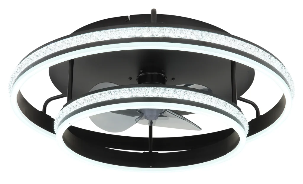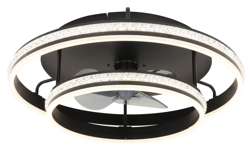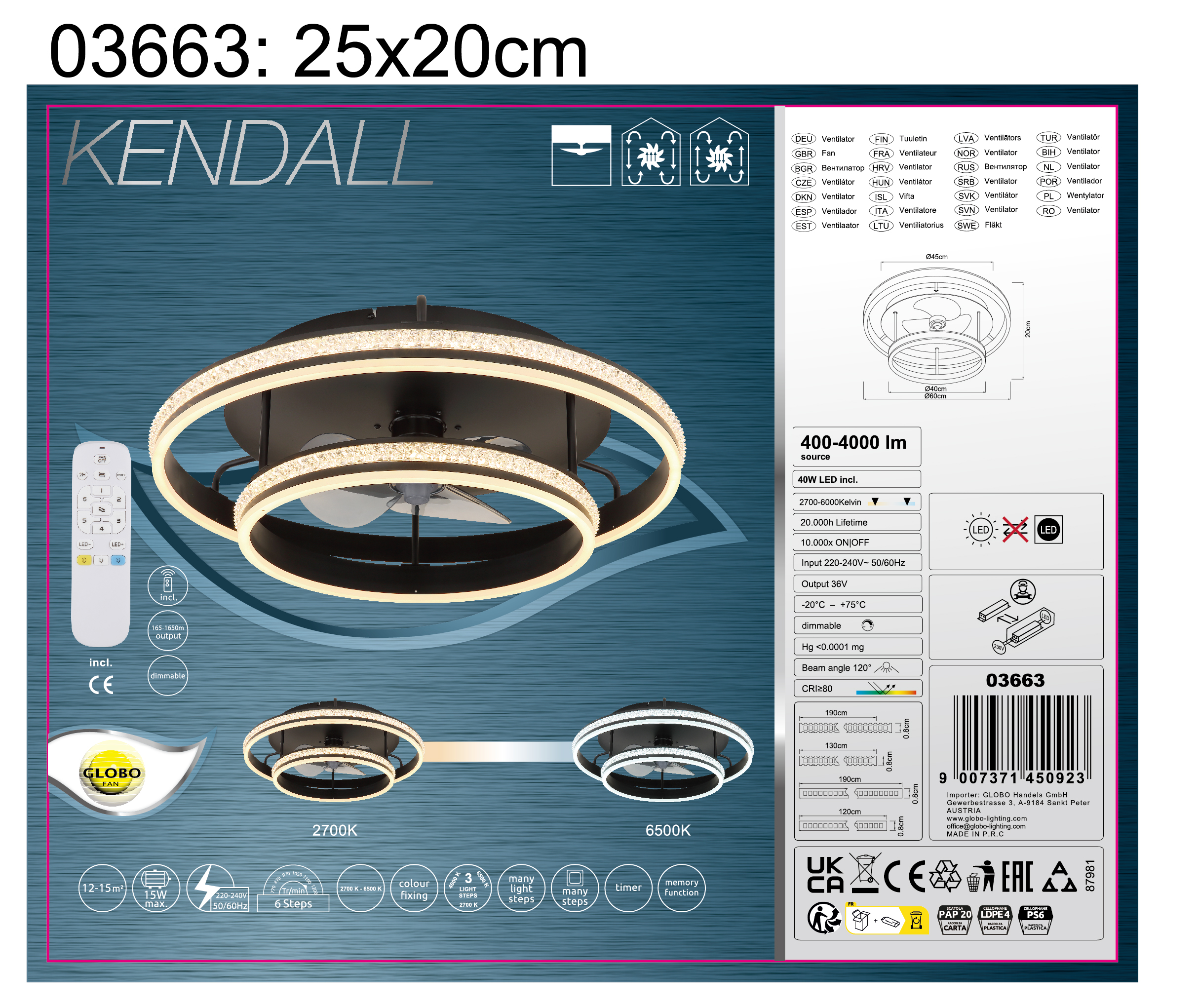 Ventilator KENDALL je luksuzan i sofisticiran plafonski ventilator koji će vašim sobama pružiti impresivno osvetljenje. Sa svojim okruglim kućištem od crnog lakiranog metala i dva prstena dekorativnih kristala jedan na drugom, elegantno grupisanih oko tri krila, daće vašoj sobi ekstravagantan i glamurozan izgled. Ventilator KENDALL dolazi sa daljinskim upravljačem koji vam omogućava da kontrolišete i regulišete osvetljenje. Takođe se može prigušiti i nudi razna podešavanja boja, uključujući fiksne boje i funkciju memorije. Može se koristiti i kao noćno svetlo pri smanjenoj osvetljenosti. Sa svojom izlaznom snagom od 2000 lumena i opsegom temperature boje (CCT) od 3000K do 6000K, nudi razne opcije osvetljenja.