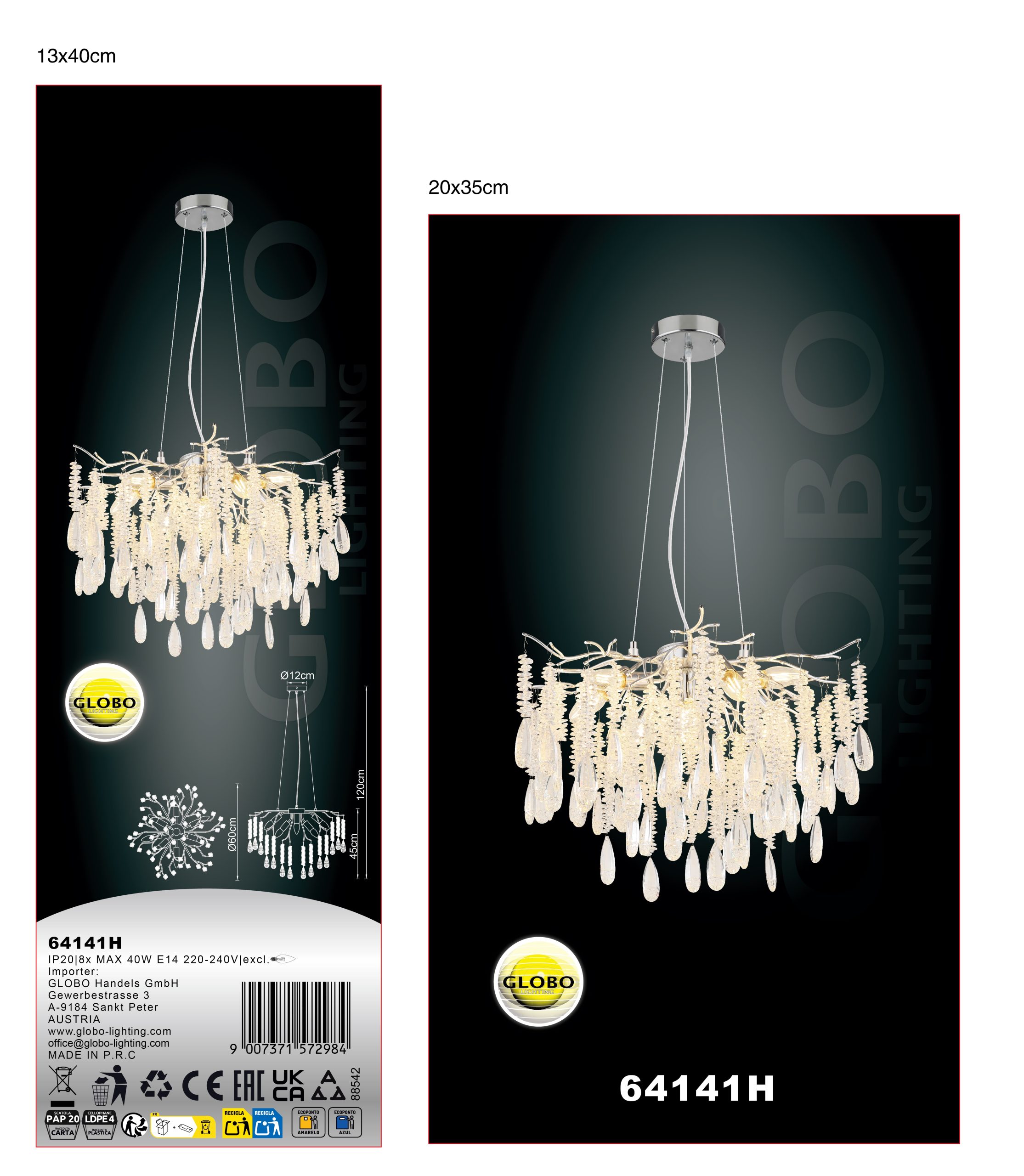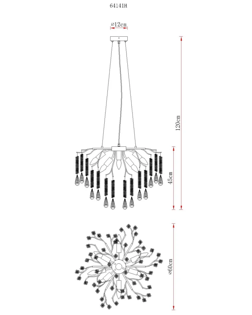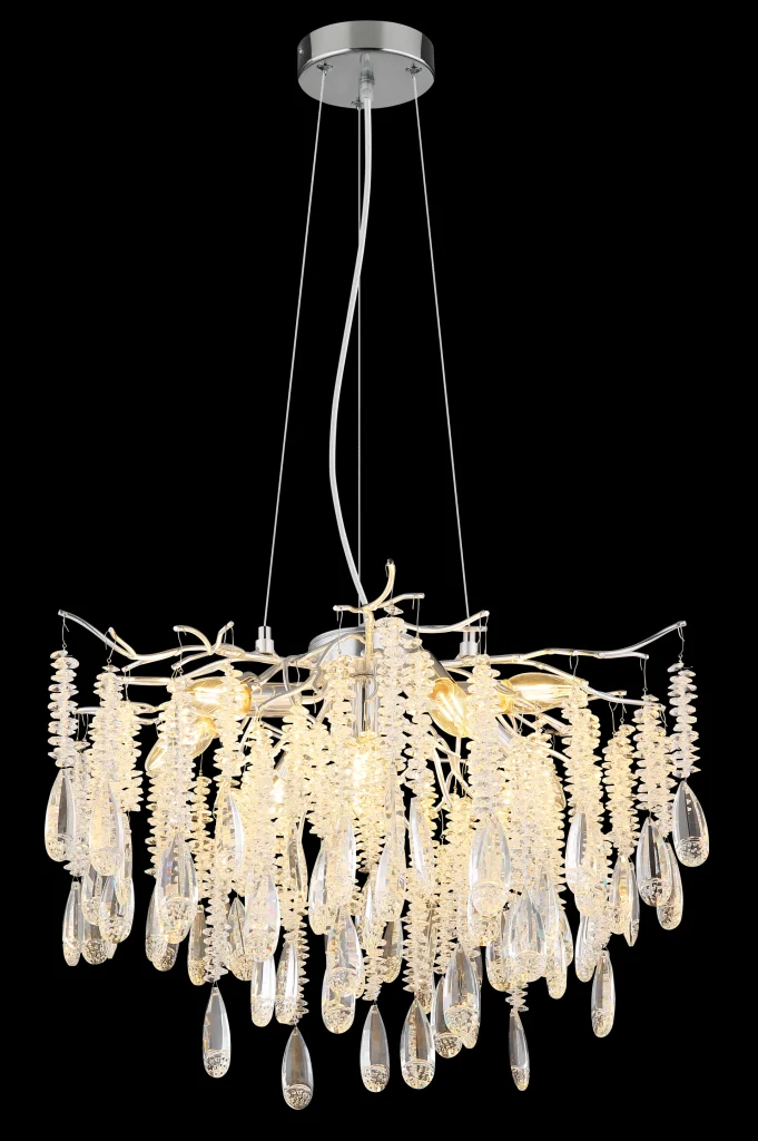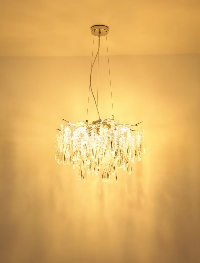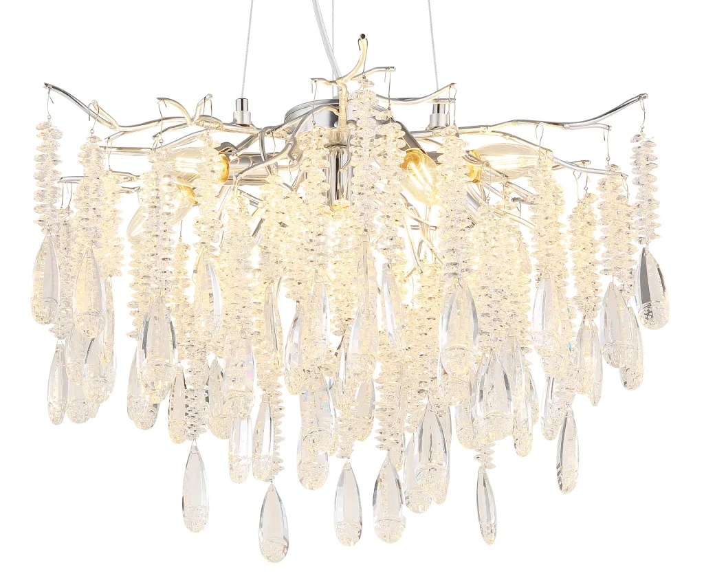 Okrugli luster KINGA impresionira svojim modernim dizajnom i visokokvalitetnim materijalima. Mat srebrni metalni okvir formira delikatnu strukturu koja elegantno podržava okrugli abažur. Ukrašen je providnim staklenim kristalima koji prelepo prelamaju svetlost, stvarajući blistav, elegantan ambijent. Sa prečnikom od 600 mm, KINGA je idealan za velike dnevne sobe, trpezarije ili ulazne hodnike koje ističe stilsko osvetljenje. Za rasvetu je potrebna sijalica E14 (nije uključena), što vam omogućava da fleksibilno izaberete savršen izvor svetlosti. KINGA kombinuje savremeni dizajn sa klasičnim kristalnim stilom i pruža harmoničnu raspodelu svetlosti koja elegantno osvetljava svaku prostoriju. Bilo da je centralni deo sobe ili suptilni akcenat – ovaj luster unosi luksuz i sjaj u vaš dom. Savršen za one koji cene estetsko osvetljenje sa čistim linijama.