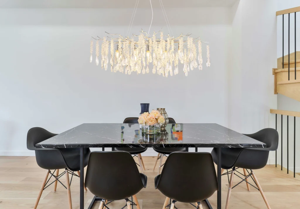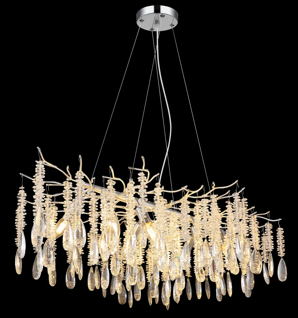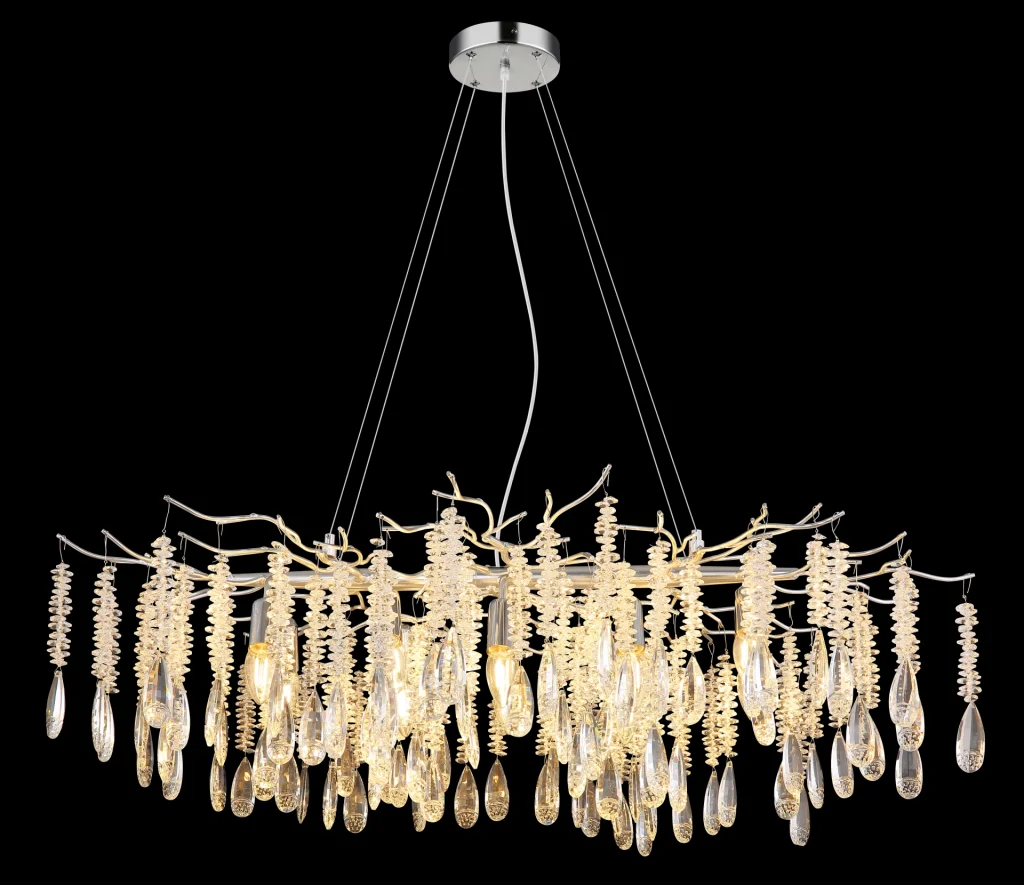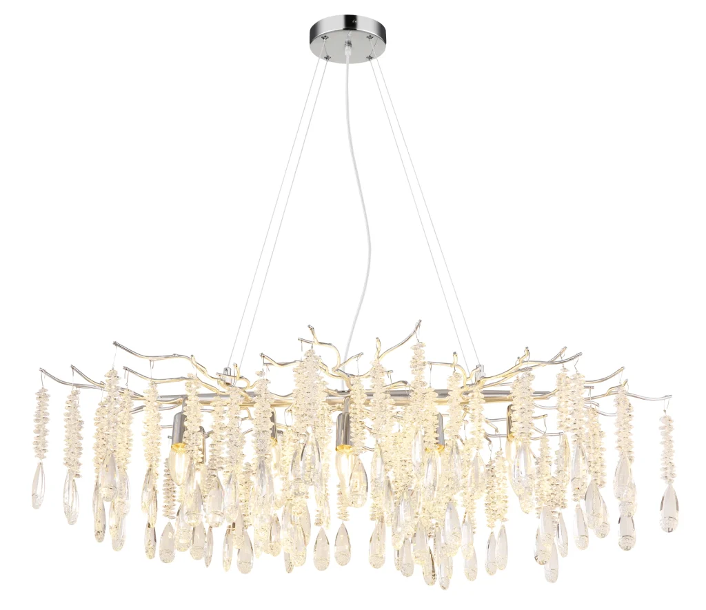Ovalni luster KINGA impresionira svojim modernim dizajnom i visokokvalitetnim materijalima. Mat srebrni metalni okvir formira delikatnu strukturu koja elegantno podržava ovalni abažur. Ukrašen je providnim staklenim kristalima koji prelepo prelamaju svetlost, stvarajući blistav, elegantan ambijent. Sa dužinom od 1000 mm i širinom od 600 mm, KINGA je idealna za prostrane dnevne sobe, reprezentativne ulazne prostore ili elegantne trpezarije. Lampa zahteva grlo E14 (nije uključena), što vam omogućava fleksibilan izbor izvora svetlosti. KINGA kombinuje savremeni dizajn sa klasičnim kristalnim stilom i obezbeđuje harmoničnu raspodelu svetlosti koja stilski osvetljava svaku prostoriju. Bilo da je impresivan centralni ukras ili suptilni dragulj – ovaj luster unosi luksuz i sjaj u vaš dom. Savršen za ljubitelje estetskog osvetljenja sa čistim linijama i prefinjenom elegancijom.