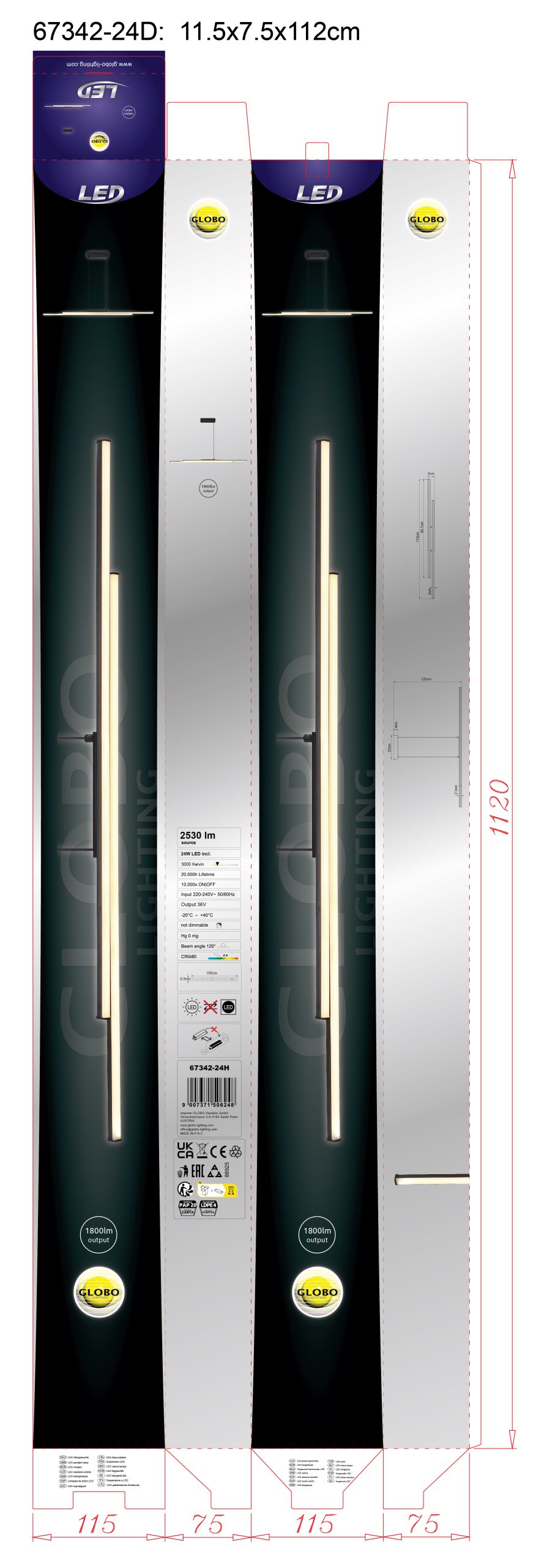 Kombinujući moderan dizajn sa odličnom funkcionalnošću, viseća lampa KIRINA je stilski dodatak svakom enterijeru. Svetiljku karakterišu dva izdužena, heksagonalna profila koji obezbeđuju preciznu i ciljanu distribuciju svetlosti. Mat crno metalno kućište i crno-opalan plastični abažur stvaraju elegantnu i savremenu estetiku. Sa svojim dimenzijama od 1100 mm dužine i 60 mm širine, viseća lampa KIRINA se besprekorno uklapa u dugačke trpezarijske stolove ili velike kuhinjske prostore. Moćna LED tehnologija pruža jačinu svetlosti od 1800 lumena i prijatnu temperaturu boje od 3000 K, stvarajući toplu i privlačnu atmosferu. Elegantan, moderan dizajn i visokokvalitetna izrada čine KIRINA idealnim izborom za stilsko i funkcionalno rešenje za osvetljenje u vašem domu.