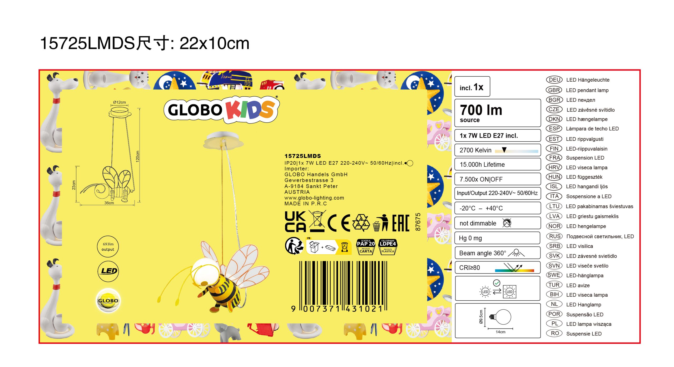 Viseća lampa HL Bee je jedinstvena i šarena, savršena za dečije sobe, vrtiće ili igrališta. Sa svojim šarenim plastičnim kućištem u obliku pčele, ona je atrakcija u svakoj prostoriji. Abažur HL Bee ima dužinu od 360 mm i pruža prijatnu raspodelu svetlosti. Sa izlazom od 693 lumena, viseća lampa pruža dovoljnu osvetljenost za osvetljenje prilagođeno deci. Temperatura boje je 2700K, što proizvodi toplo i prijatno svetlo. Zahvaljujući svom razigranom dizajnu i svetlim bojama, HL Bee privlači pažnju i unosi zabavu i radost u sobu. To je savršen dodatak za razigranu i veselu atmosferu. Otkrijte viseću lampu HL Bee i pustite svoju decu da blistaju njenom zabavnom i šarenom harizmom. To nije samo rešenje za osvetljenje, već i dekorativni element koji će ulepšati svaku dečiju sobu.
