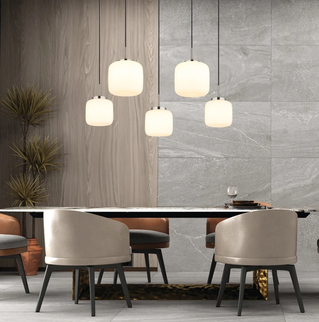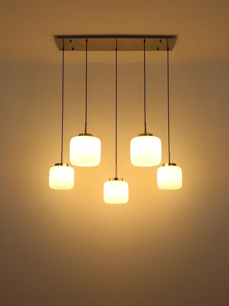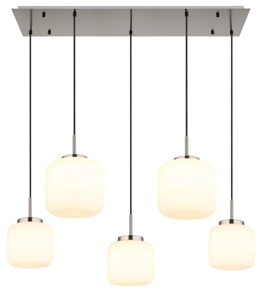 Viseća lampa KLADORA je moderan detalj za vaš dom koji impresionira svojim pravougaonim oblikom i pet lukovičastih stakala sa elegantnim žlebovima. Ova viseća lampa obezbeđuje ravnomernu raspodelu svetlosti i stvara prijatnu atmosferu u svakoj prostoriji. Telo napravljeno od mat nikl metala daje lampi stilski, savremeni izgled koji se savršeno integriše u različite stilove opremanja. Abažuri od opalnog stakla stvaraju meko, difuzno svetlo koje udobno osvetljava prostoriju. Sa dužinom od 1060 mm i širinom od 380 mm, lampa je idealna za veće trpezarije, kuhinjska ostrva ili iznad stolova. Viseća lampa KLADORA se isporučuje bez E27 LED sijalica, tako da možete izabrati pravo osvetljenje prema vašim potrebama. Postavlja i funkcionalne i estetske akcente i pruža stilsko osvetljenje u vašem domu.