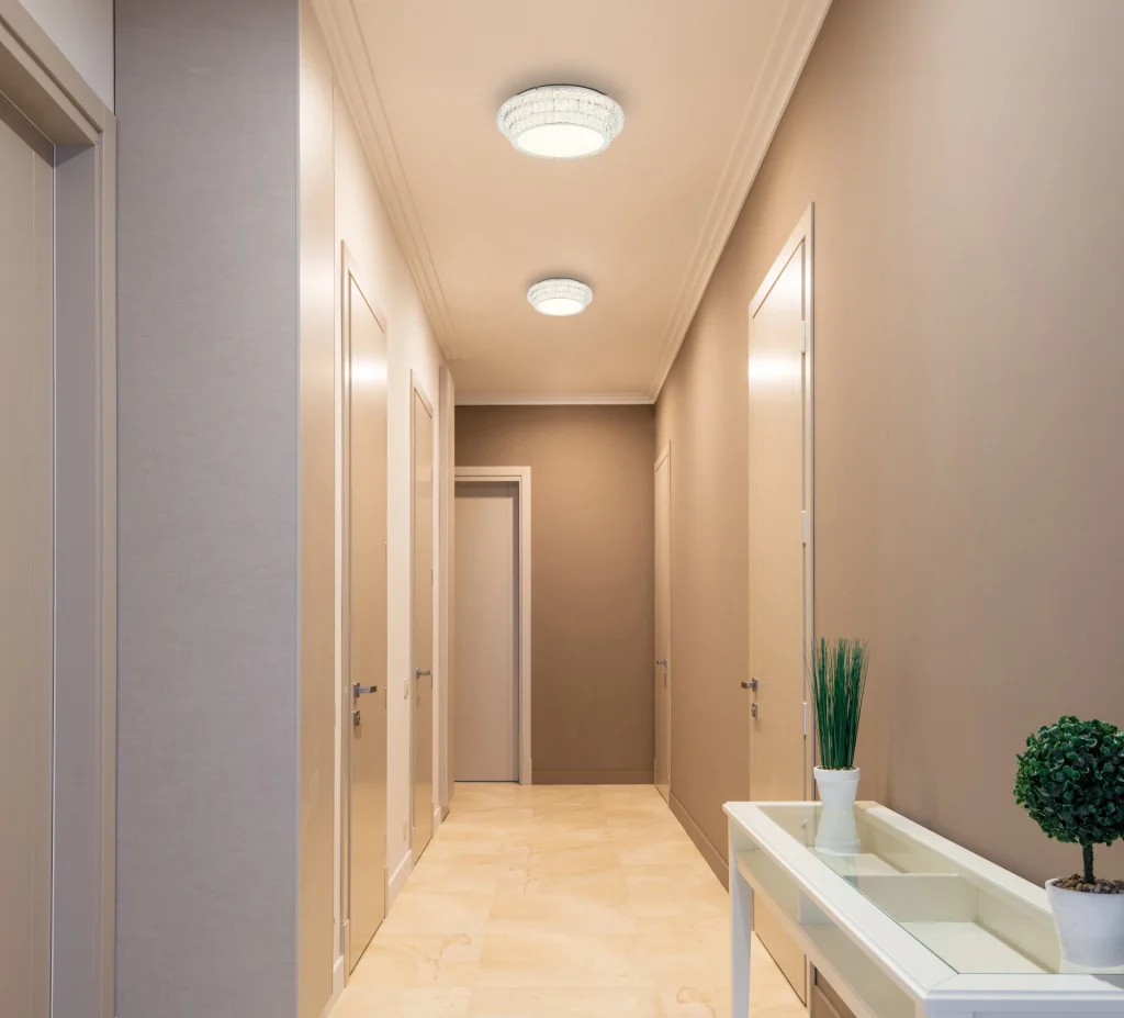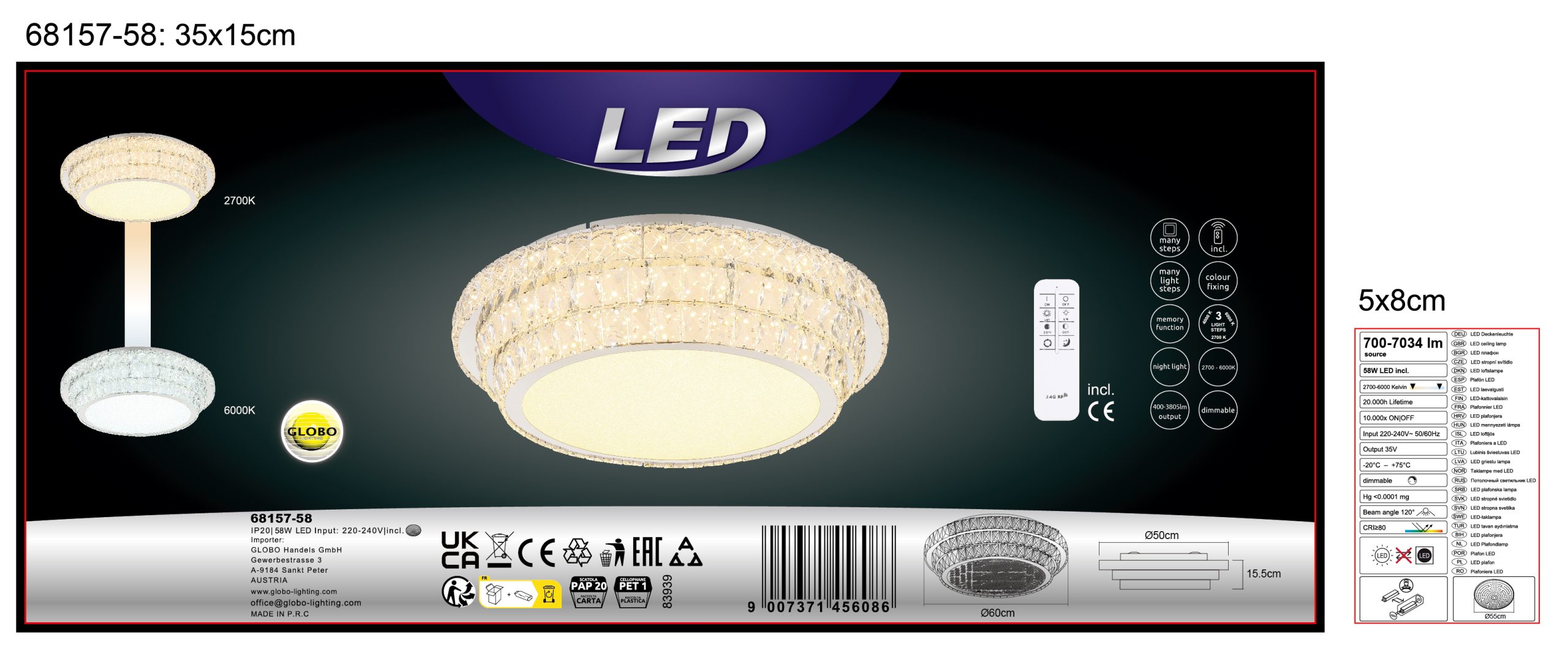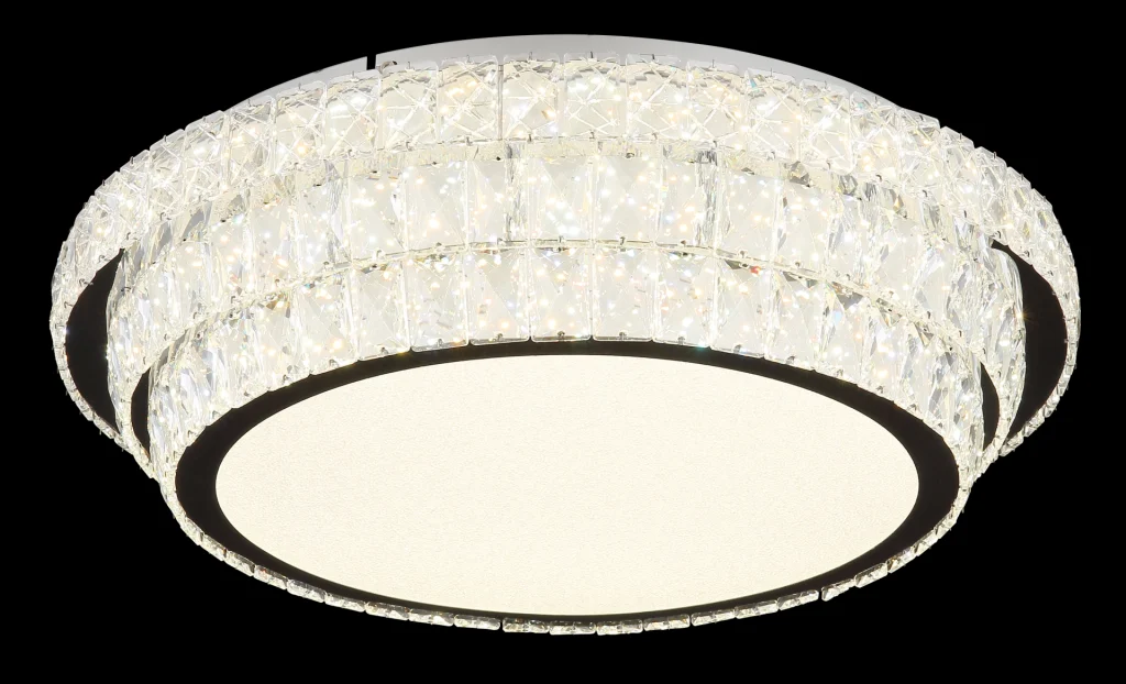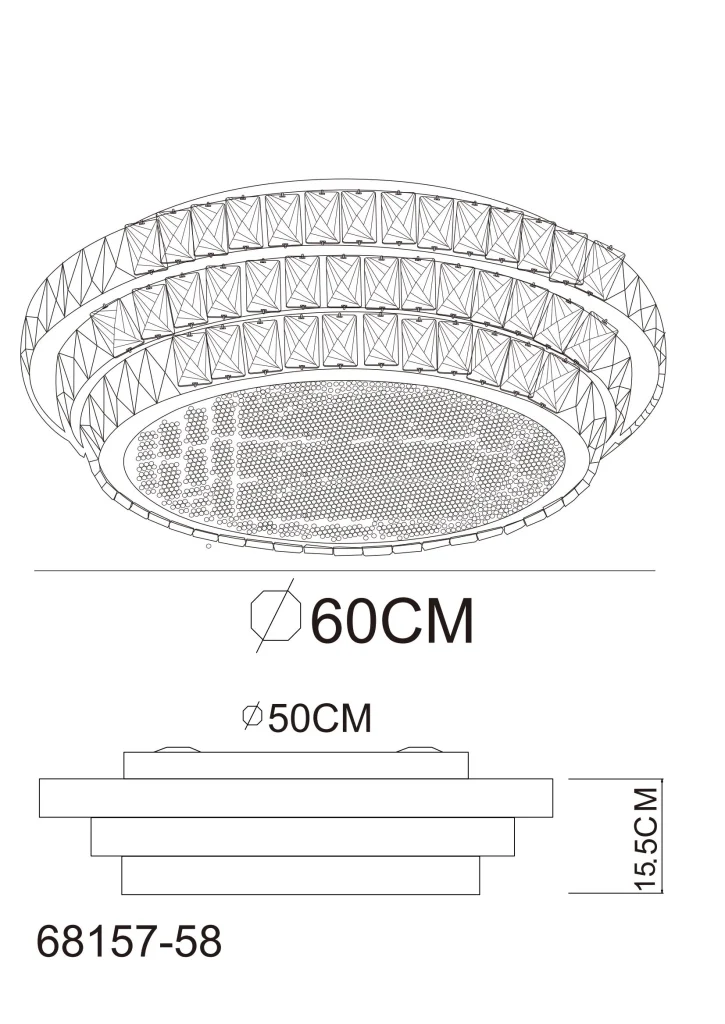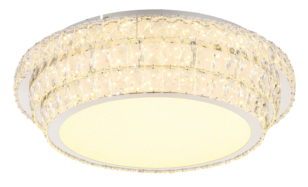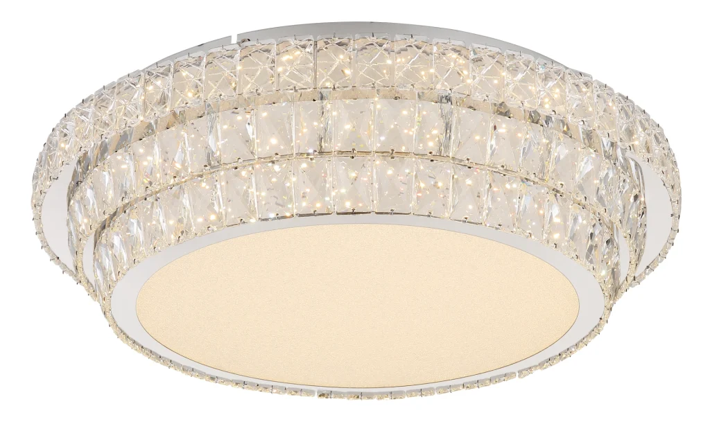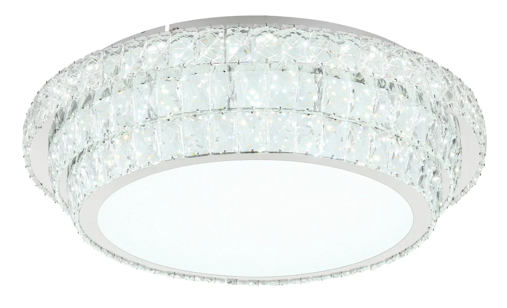 PLAFONSKA LAMPA METAL HROM je elegantna okrugla plafonska lampa koja uranja svaku prostoriju u stilski ambijent svojim kristalnim dekorom napravljenim od providnih akrilnih kristala. Hromirano metalno kućište daje lampi moderan izgled. Sa prečnikom od 600 mm i snagom od 58 W, ova plafonska lampa proizvodi jak svetlosni fluks od 3770 lumena, što pruža svetlo i prijatno osvetljenje. PLAFONSKA LAMPA HROM METAL je prigušiva i može se podesiti na različite nivoe osvetljenosti pomoću zidnog prekidača. Pomoću priloženog daljinskog upravljača možete podesiti temperaturu boje od 2700K do 6000K i pojedinačno fiksirati boju svetlosti. Praktična funkcija memorije čuva vaša željena podešavanja, dok funkcija noćnog svetla pruža meko osvetljenje u mraku. Uživajte u prilagodljivom i stilskom osvetljenju u vašem domu uz ovu visokokvalitetnu plafonsku lampu.
