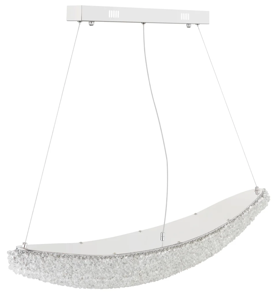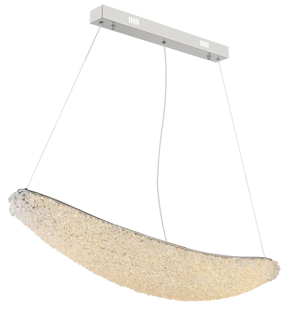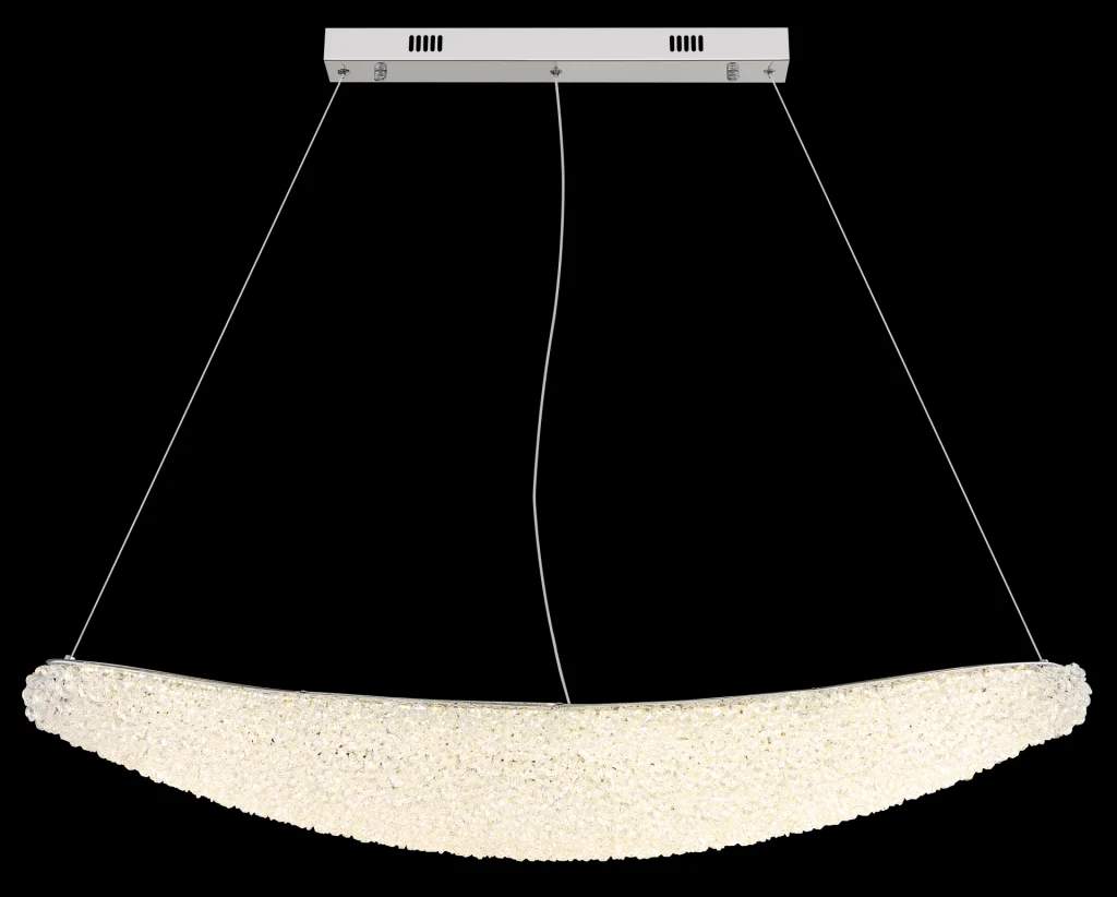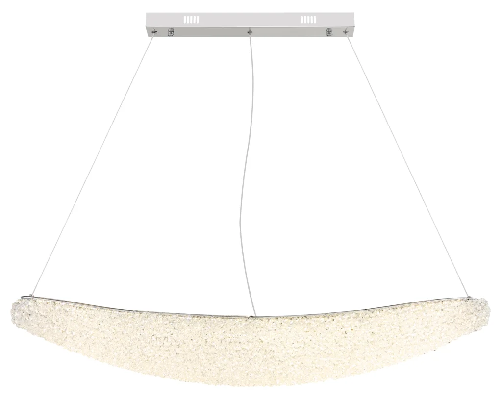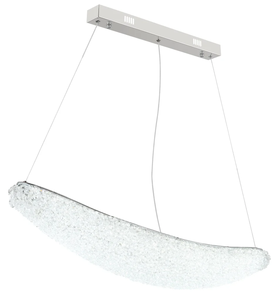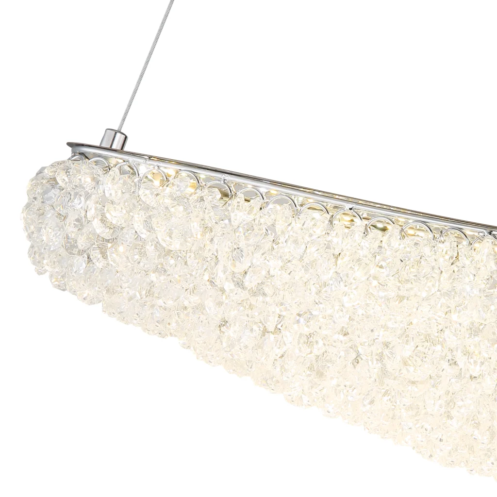 Ovalna viseća lampa KRISTALLA kombinuje elegantan dizajn sa visokokvalitetnom tehnologijom osvetljenja. Njeno telo napravljeno od hrom metala daje lampi moderan, sofisticiran izgled, dok abažur od providnih staklenih kristala stvara briljantnu, blistavu svetlost. Raspodela svetlosti je ravnomerna i stvara impresivnu atmosferu u dnevnim sobama, trpezarijama ili reprezentativnim prostorima. Sa dužinom od 1100 mm i širinom od 200 mm, lampa pruža izdašno osvetljenje sa 3900 lumena. Integrisana LED tehnologija (uključena) obezbeđuje energetsku efikasnost i dug vek trajanja. Upravljanje je praktično pomoću priloženog daljinskog upravljača: može se prigušiti, sa fiksnim bojama, funkcijom memorije i podesivom temperaturom boje od 2700 K do 6000 K. Ovo omogućava prilagođavanje osvetljenja od toplog ambijentalnog svetla do dnevne bele boje po potrebi. Kombinacija elegantnog hroma, blistavih kristala i moderne LED tehnologije čini KRISTALLA pravim centralnim delom.