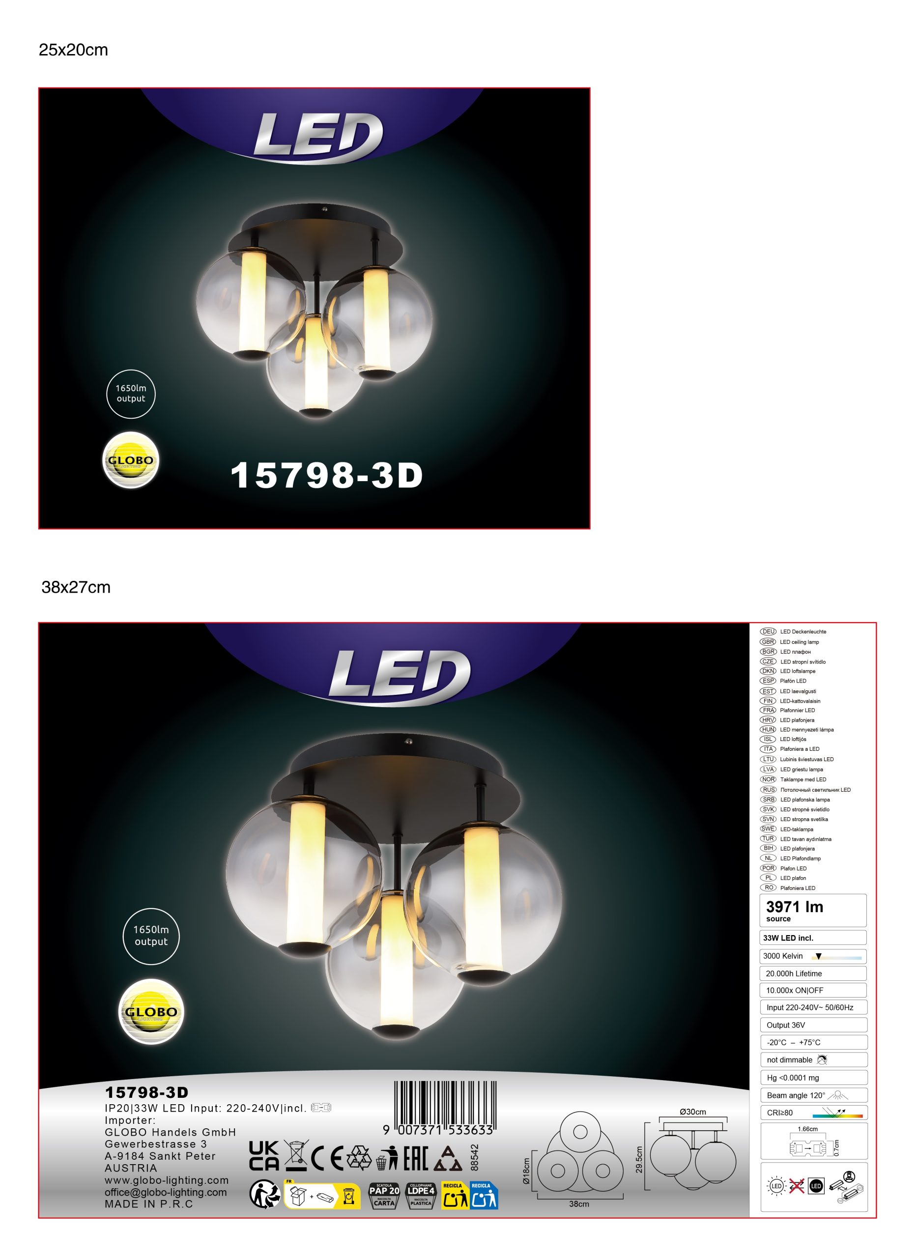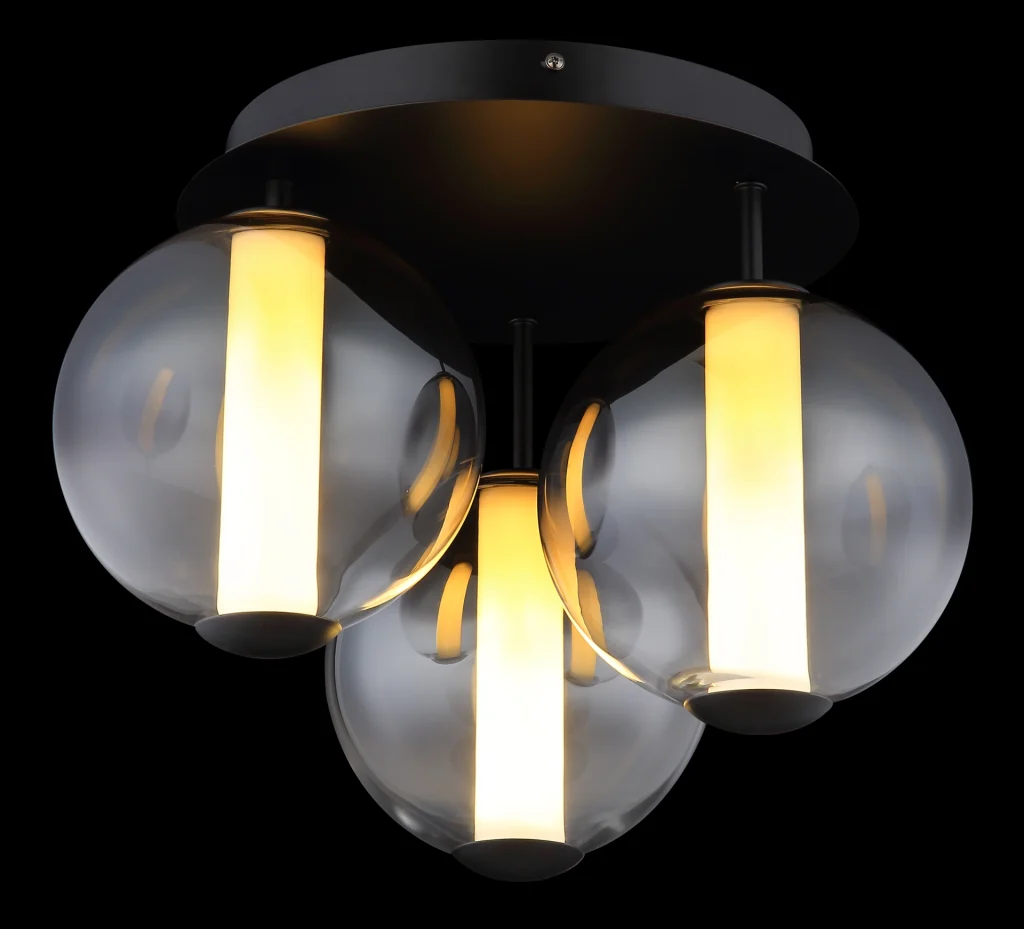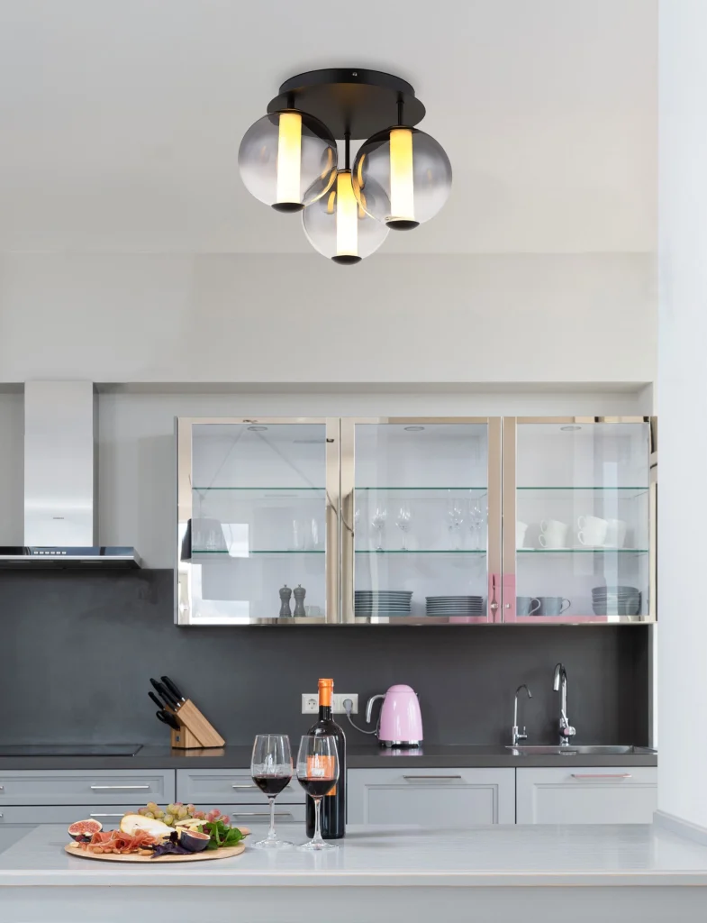 Plafonska lampa LACY kombinuje moderan dizajn sa funkcionalnim osvetljenjem. Telo napravljeno od mat crnog metala obezbeđuje elegantan i bezvremenski izgled, dok tri staklene kuglice unutra sa akrilnim cilindrima omogućavaju nežnu difuziju svetlosti. Dimljene staklene kuglice i opalni akrilni abažur stvaraju prijatnu atmosferu osvetljenja koja se savršeno uklapa u svako moderno životno okruženje. Sa prečnikom od 380 mm, lampa je idealne veličine za male do srednje velike prostorije. Integrisana LED tehnologija obezbeđuje potrošnju energije od samo 1650 lumena na temperaturi boje od 3000 K, što garantuje prijatno, toplo belo osvetljenje. Lampa LACY nije samo vrhunac u vašoj sobi, već je i izuzetno energetski efikasna. Dolazi sa ugrađenim LED sijalicama, tako da vam nisu potrebne dodatne sijalice. Idealna za dnevne sobe, hodnike ili trpezarije.