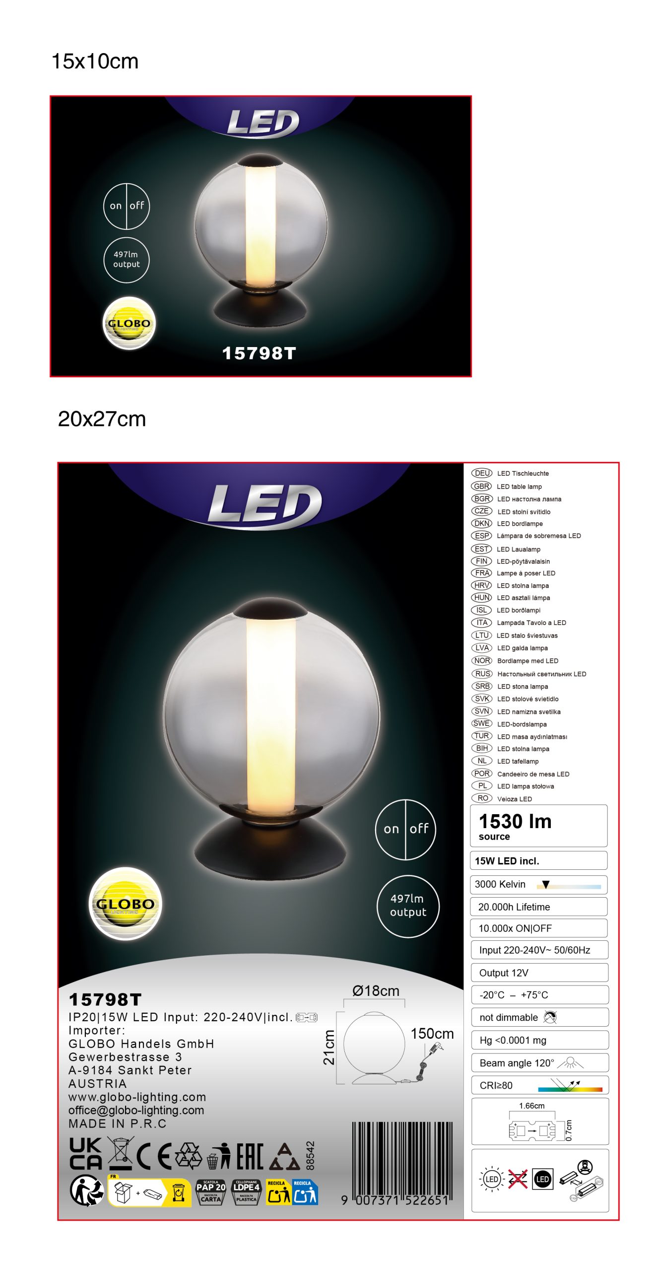 Stona lampa LACY kombinuje moderan dizajn i funkcionalno osvetljenje u kompaktnom, elegantnom formatu. Sa svojim okruglim kućištem od mat crnog metala i dimljenom staklenom kuglom, u kojoj se nalazi cilindar od opal akrila, obezbeđuje nežnu i ravnomernu raspodelu svetlosti. Abažur u obliku staklene kugle nije samo vizuelni akcenat, već je i praktičan, jer optimalno štiti LED diode i istovremeno stvara prijatnu atmosferu osvetljenja. Sa prečnikom od 180 mm, stona lampa je idealna za komode, noćne stočiće ili kao dekorativni element na policama. 497 lumena pruža toplo osvetljenje na temperaturi boje od 3000K, stvarajući ugodnu atmosferu. Prekidač na kablu omogućava lako rukovanje. Integrisane LED diode su energetski efikasne i dugotrajne, što čini stonu lampu LACY održivim izborom za svaki dom.