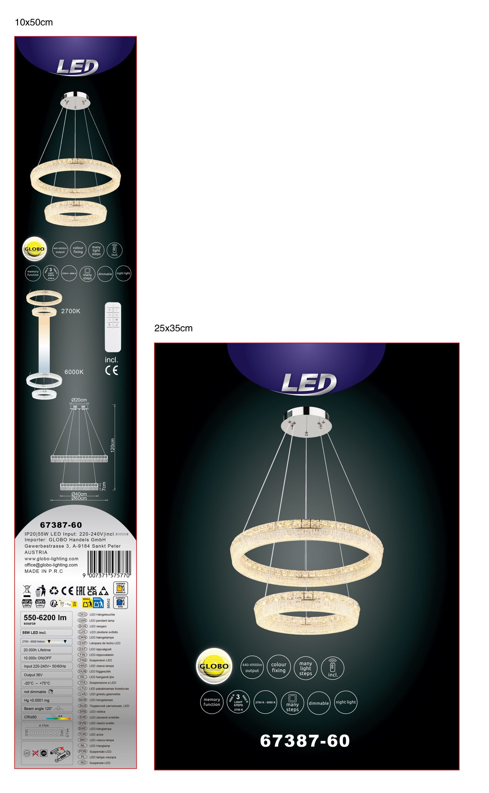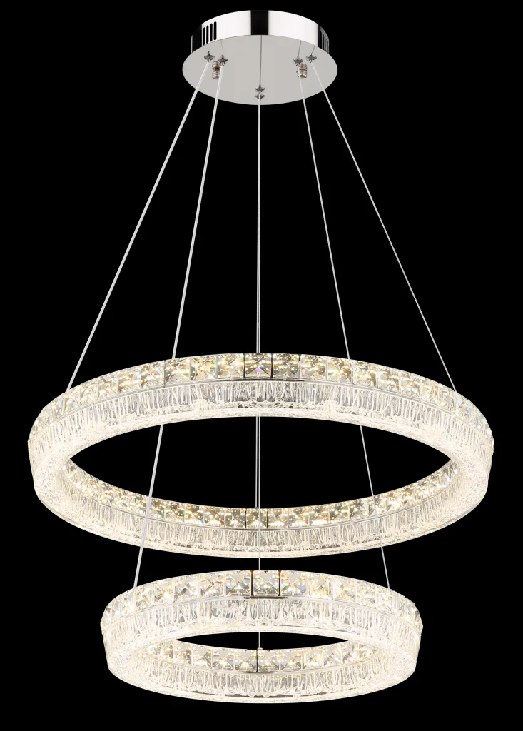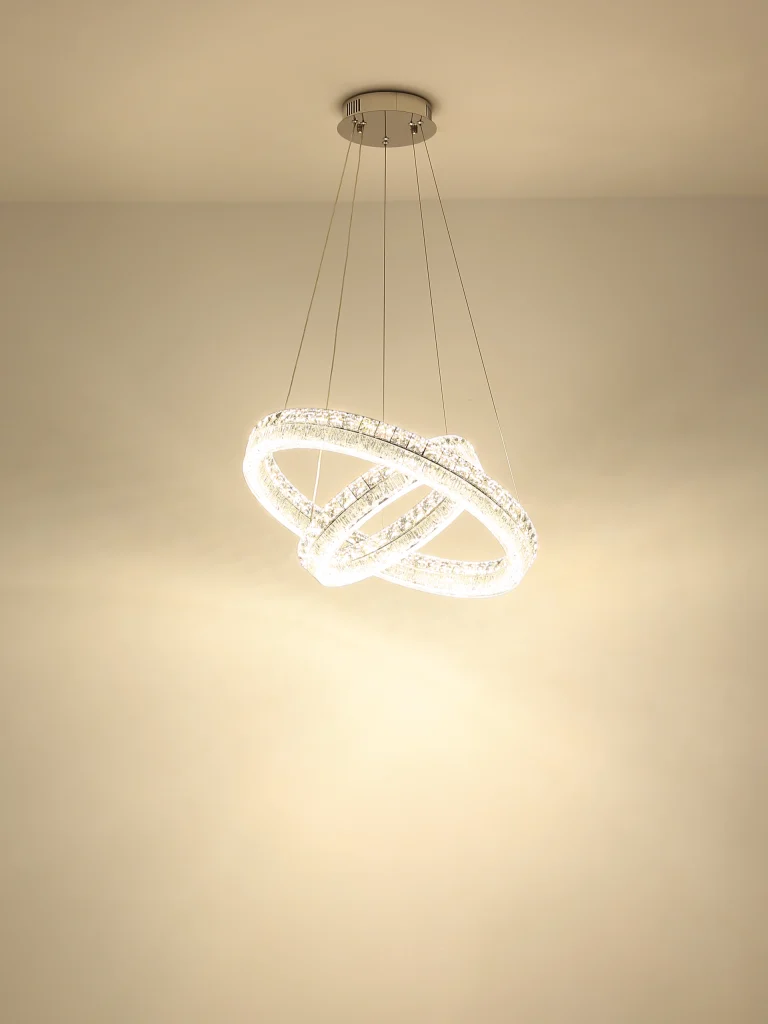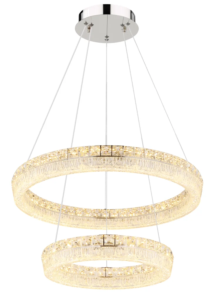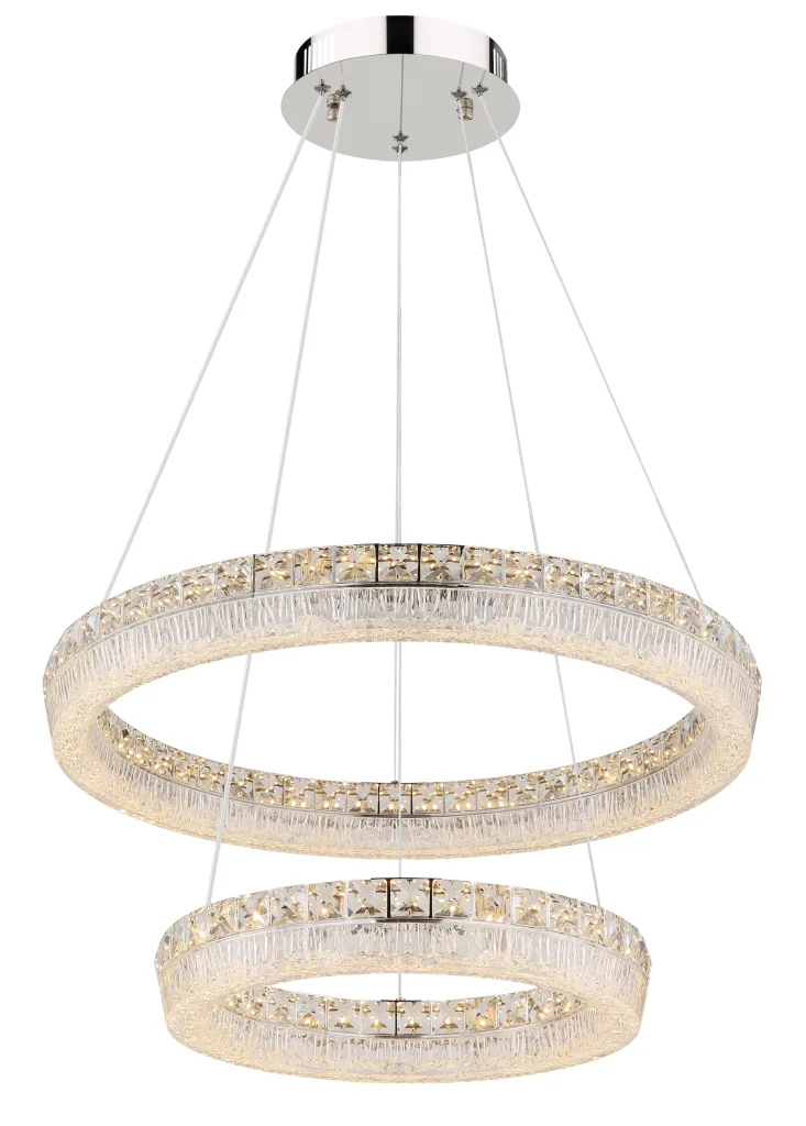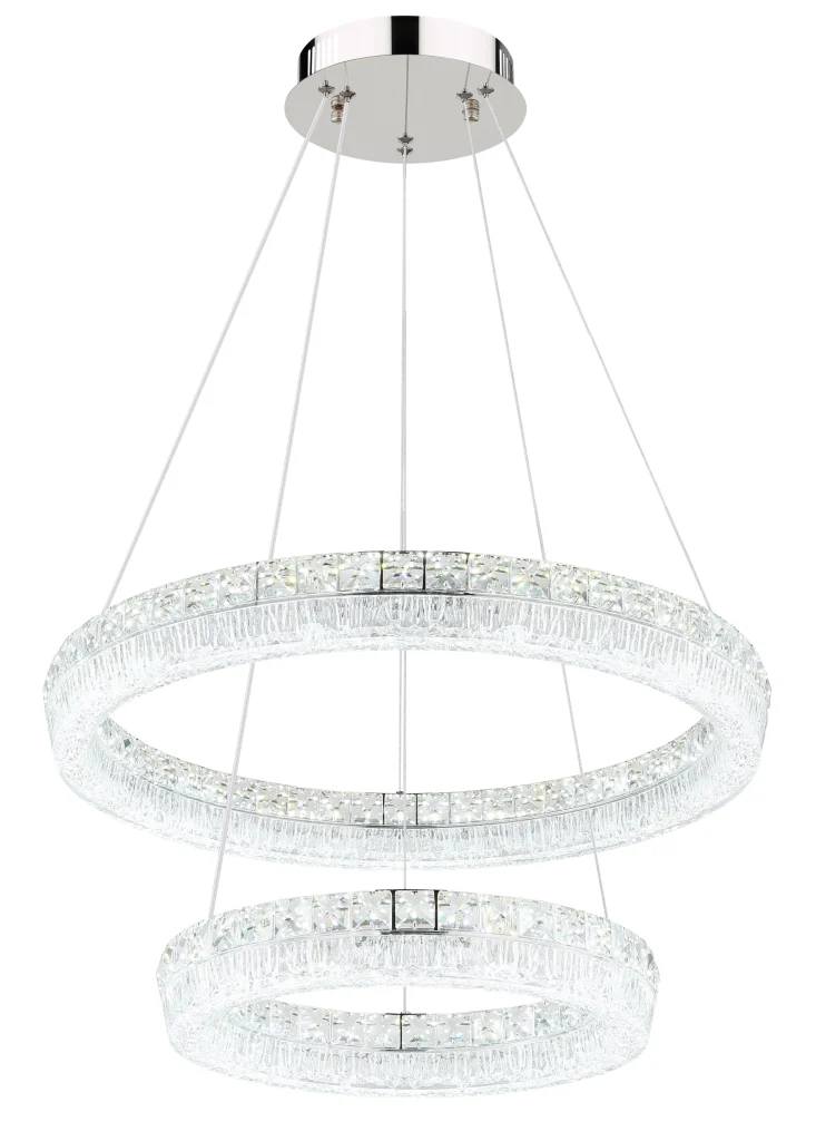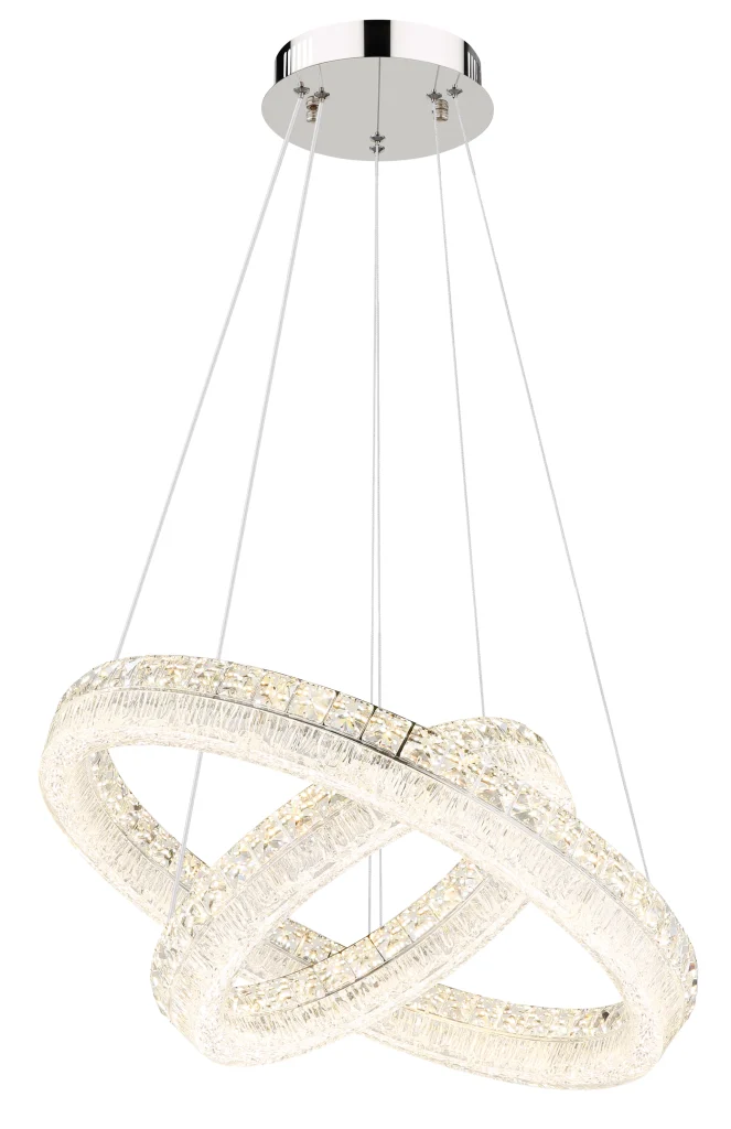 Viseća lampa LAUREL impresionira svojim modernim, okruglim dizajnom sa dva elegantno isprepletena prstena. Hromirani metalni okvir savršeno dopunjuje prozirni akrilni abažur, koji je naglašen blistavim kristalima od prozirnog stakla koji stvaraju stilske svetlosne efekte. Sa prečnikom od 600 mm, ova lampa je pravi atrakcija u svakoj prostoriji. Sa snažnim svetlosnim izlazom od 4900 lumena, integrisana LED tehnologija obezbeđuje svetlo i energetski efikasno osvetljenje. Uključeni daljinski upravljač omogućava glatko zatamnjivanje i fiksiranje boje. Temperatura boje se može fleksibilno podesiti između toplo bele (2700 K) i dnevne bele (6000 K) (CCT funkcija). Funkcija memorije čuva poslednja izabrana podešavanja, tako da uvek možete da se setite svog željenog osvetljenja. Pored toga, integrisano noćno svetlo pruža nežno osvetljenje uveče. LAUREL kombinuje stilski dizajn sa inovativnom tehnologijom – savršena viseća lampa za vaš dom.