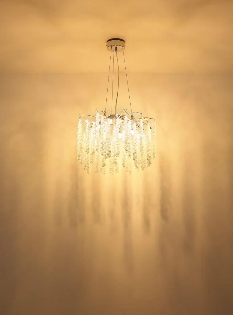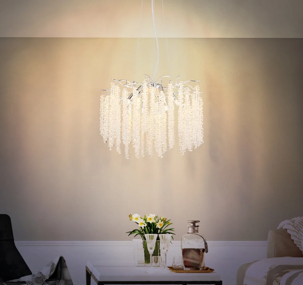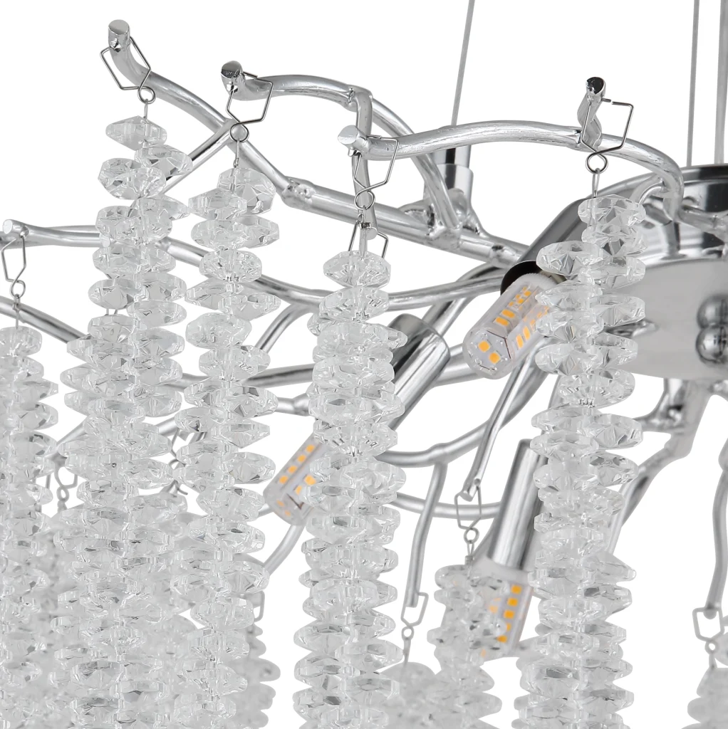Luster LAVERN je veličanstvena plafonska rasveta u tradicionalnom stilu koja svojim elegantnim dizajnom obogaćuje svaki koncept prostorije. Hromirano metalno i aluminijumsko kućište pruža moderan, sjajan izgled, dok vešto primenjeni plastični kristali dodaju dašak luksuza i elegancije. Grane sa kristalnim ukrasima lepo raspoređuju svetlost i stvaraju atmosferski ambijent. Sa prečnikom od 500 mm, luster se savršeno uklapa u veće prostorije, kao što su dnevne sobe ili trpezarije, i garantovano će privući pažnju. G9 grlo vam omogućava da koristite sijalicu po vašem izboru da biste prigušili svetlo po želji i stvorili prijatnu atmosferu. LAVERN kombinuje tradicionalne elemente sa modernom tehnologijom i savršen je izbor za svakoga ko traži stilsko osvetljenje sa sofisticiranim dodirom.
