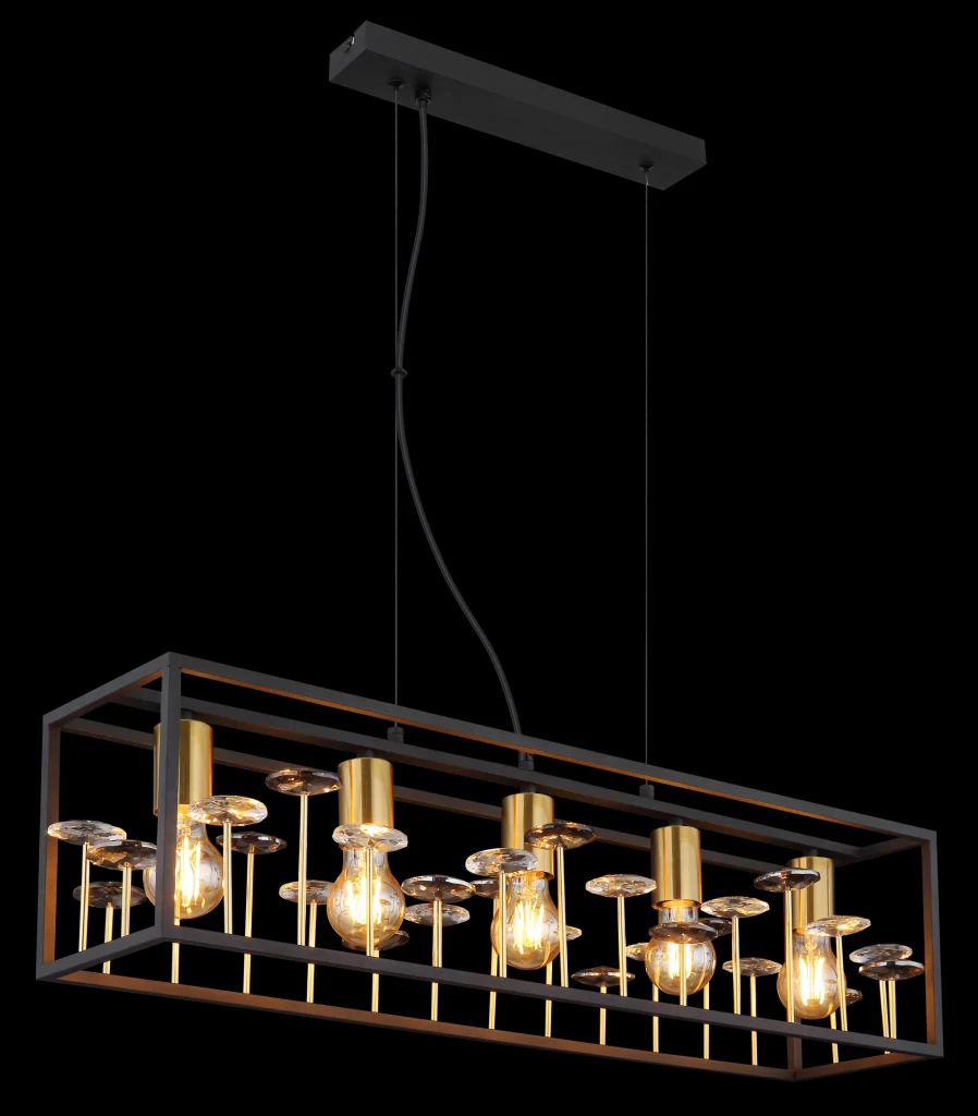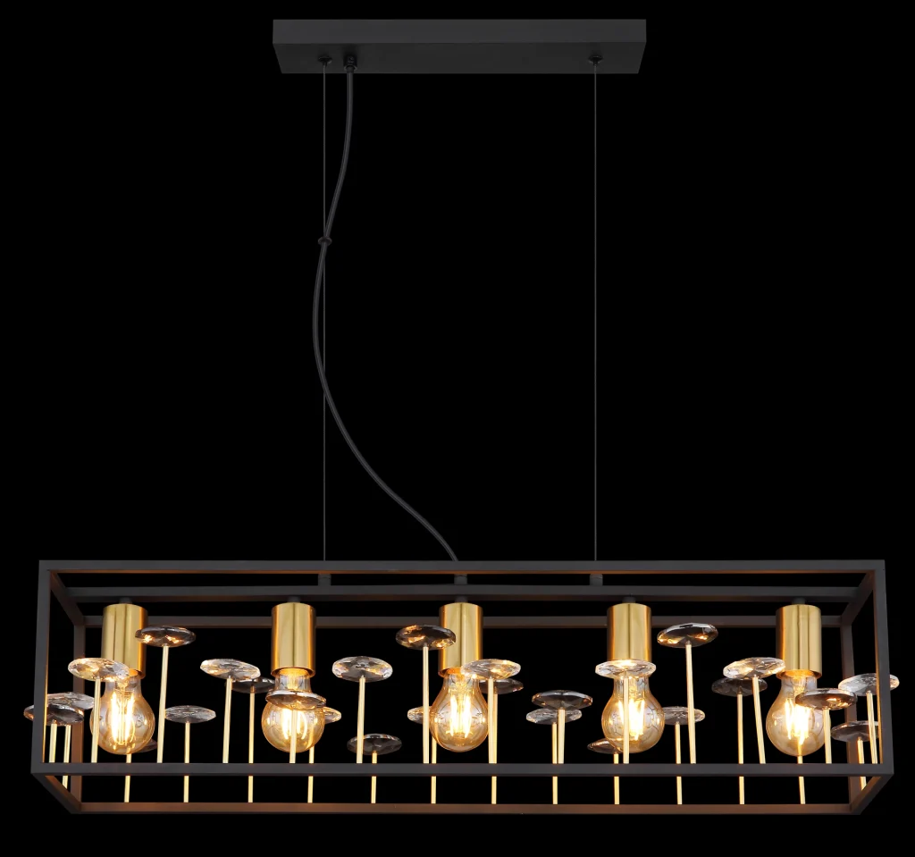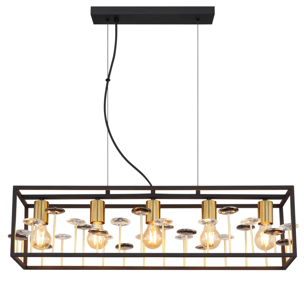 Uronite u svet vintage stila uz ovu pravougaonu viseću lampu od crnog mat metala i zlatnog abažura. Pravougaoni kavez, ispunjen kristalima od providnog stakla i kristalima K9 boje dima, kupa svaku sobu glamuroznom svetlošću. Sa pet E27 grla, ova viseća lampa nudi dovoljnu osvetljenost i istovremeno postavlja jedinstven akcenat. Sa dužinom od 770 mm i širinom od 180 mm, ispunjava sobu toplim, prijatnim svetlom. Crno metalno kućište je čvrsto i izdržljivo, dok zlatni abažur dodaje elegantan dodir. Ova viseća lampa nije samo funkcionalna, već je i pravi vrhunac koji daje luksuznu atmosferu svakoj prostoriji.