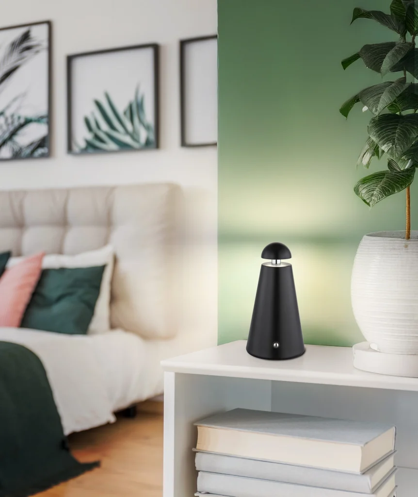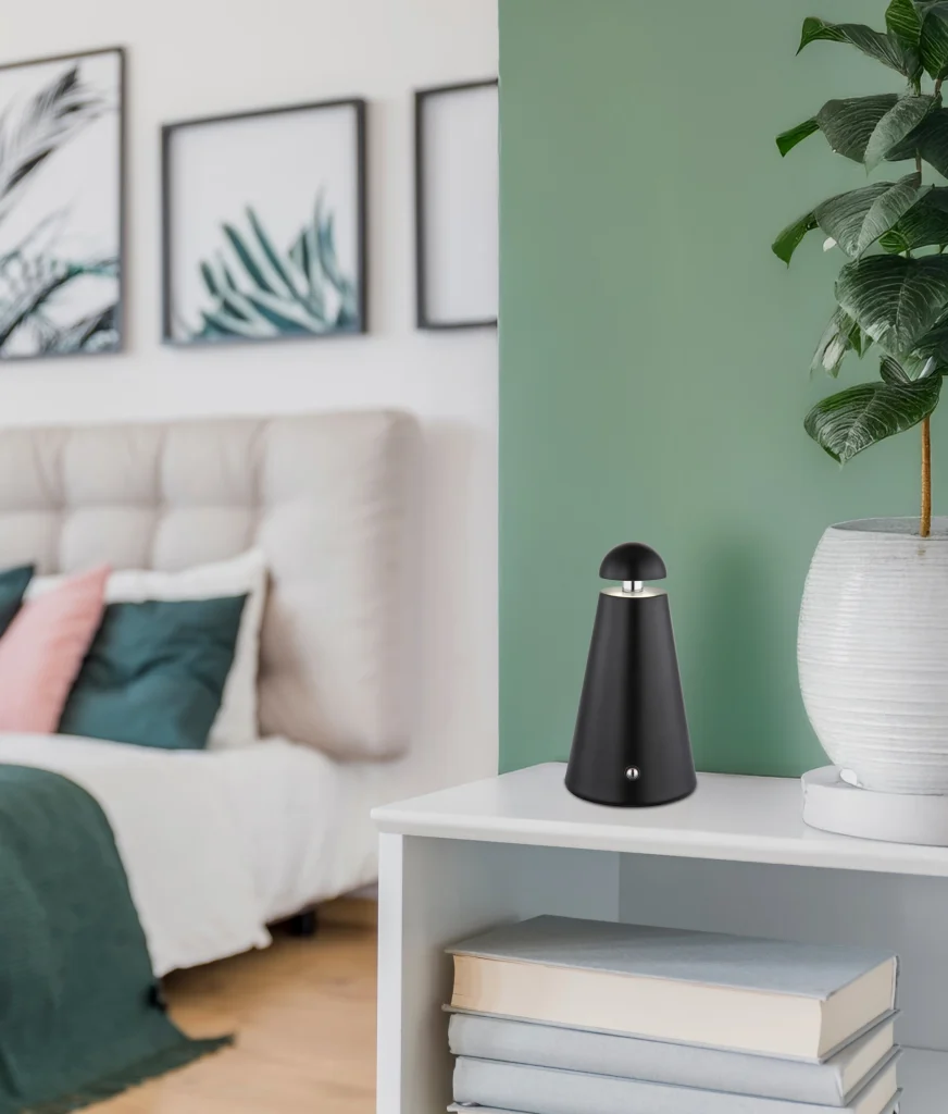 Stona lampa LIVA impresionira svojim modernim, okruglim i konusnim dizajnom u elegantnom mat crnom metalu. Sa prečnikom od 90 mm, savršeno se uklapa na svaki sto i stvara prijatnu atmosferu osvetljenja. Opremljena bezstepenim dodirnim dimerom, temperatura boje se može fleksibilno podesiti i fiksirati između 6000 K i 4500 K. Lampa isporučuje 80 lumena, pružajući dovoljnu osvetljenost za ugodne večeri ili fokusiran rad. Upravljanje je jednostavno putem dodirnog uključivanja/isključivanja. Zahvaljujući ugrađenoj bateriji, lampa svetli tokom punjenja, koje traje oko 4 sata. Nakon potpunog punjenja, pruža približno 6 sati svetlosti. Obim isporuke uključuje adapter i USB kabl za punjenje. Integrisana LED dioda obezbeđuje energetski efikasno osvetljenje i dug vek trajanja.