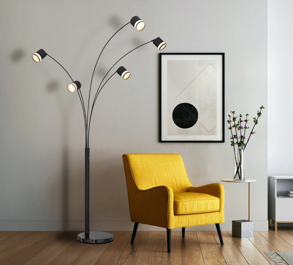 Zakrivljena podna lampa LUCERO sa tri kraka i cilindričnim reflektorima kombinuje moderan dizajn sa funkcionalnošću. Telo napravljeno od mat crnog lakiranog metala savršeno se usklađuje sa opalnim plastičnim abažurima, koji šire prijatnu svetlost. Sa širinom od 700 mm i dužinom od 1100 mm, savršeno se uklapa u velike prostorije i stvara prijatnu atmosferu. Funkcija prigušivanja omogućava podešavanje intenziteta svetlosti prema raspoloženju. Sa svetlosnim izlazom od 364 lumena na 3000 K, LUCERO nije samo stilska, već i praktična za svaki dnevni boravak.