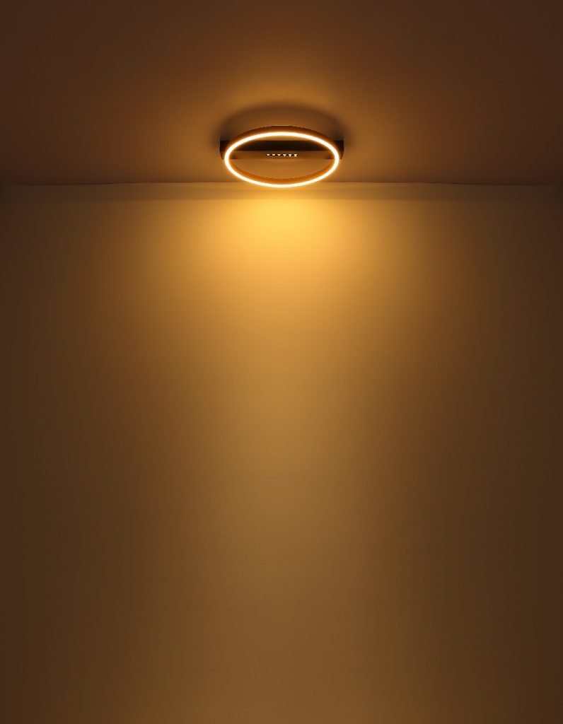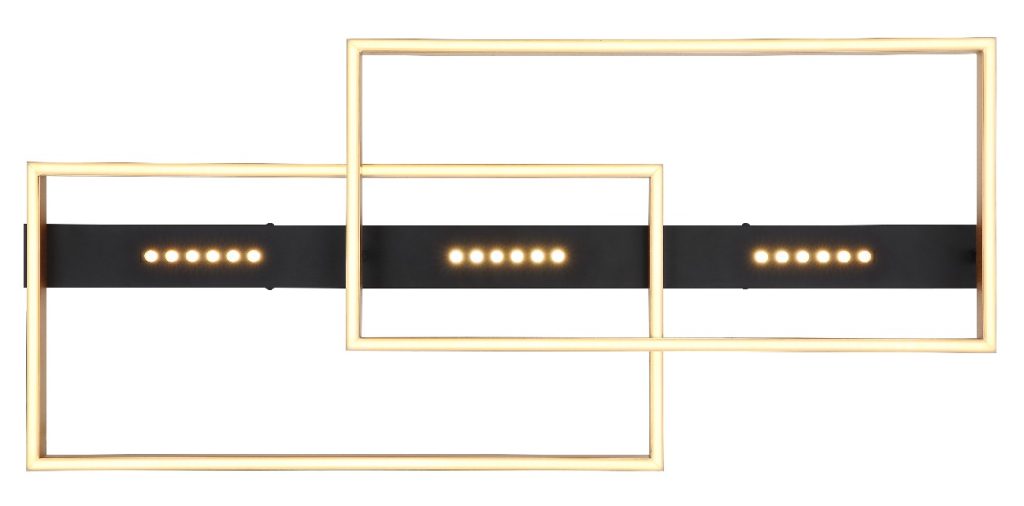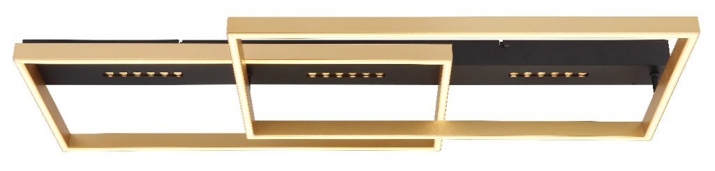 Ova moderna plafonska lampa impresionira odličnim dizajnom. Na 90 cm dugačkoj crno mat plafonskoj osnovi postoji dva pravougaona LED panela zlatne boje koji emituju toplo belu svetlost od 3000 Kelvina i tako pružaju prijatnu atmosferu.