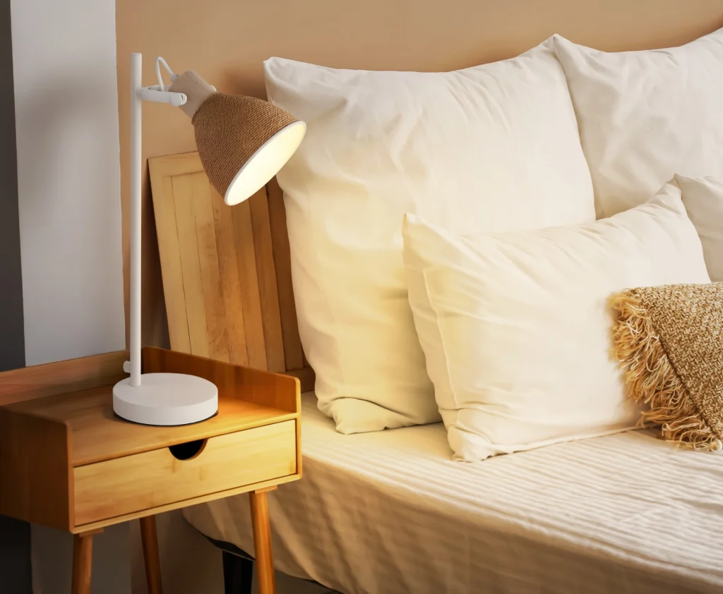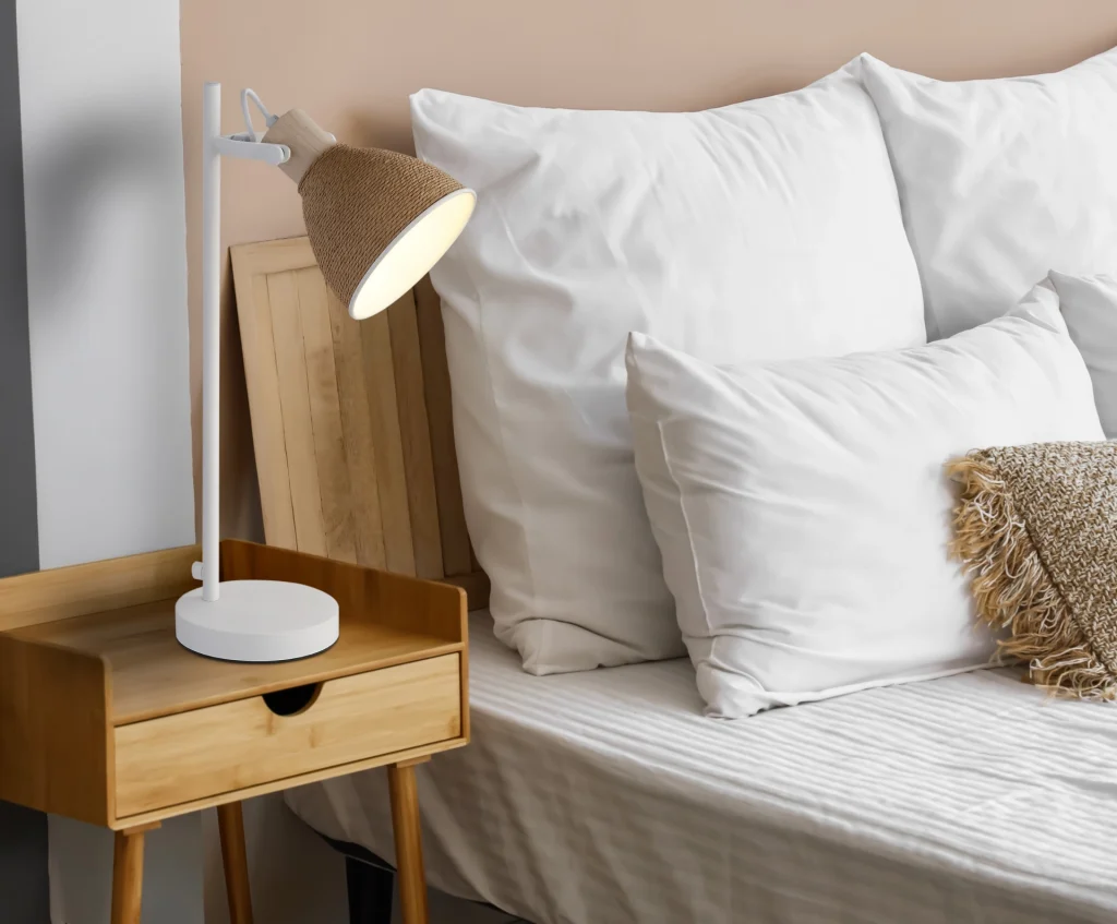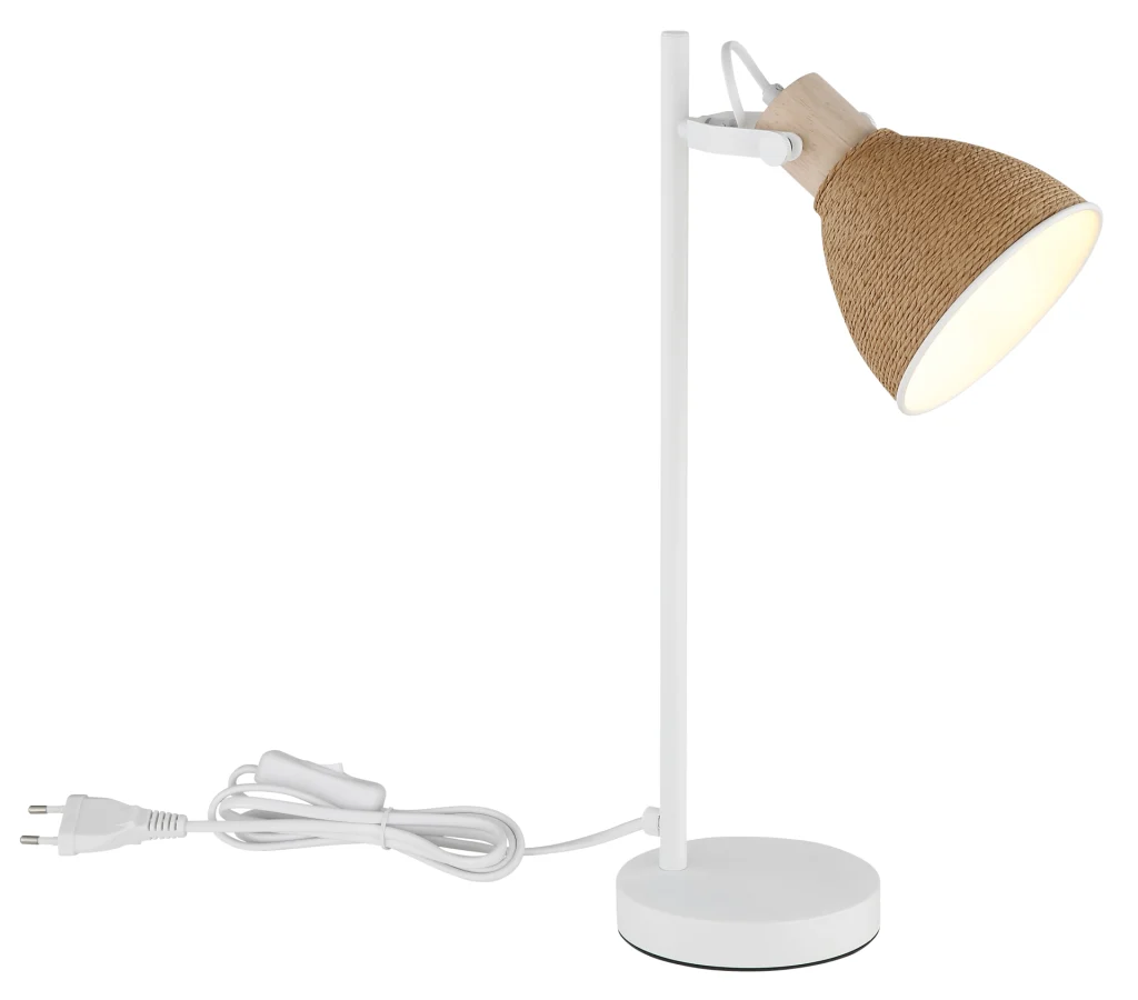 The table lamp LYNDON combines timeless elegance with natural materials and sets stylish accents in every room. The round metal shade, artfully wrapped with brown paper cord, gives the design a special structure and a homely, harmonious appearance. The straight, minimalist metal body in matte white emphasizes the modern design and integrates effortlessly into a wide range of interior styles. Whether on the bedside table, in the living room, or in the home office – LYNDON impresses with versatility and a clear design approach. The practical rocker switch on the cable allows simple and convenient operation. The combination of metal, wood look, and paper makes this table lamp a special design object that stylishly combines aesthetics and function.