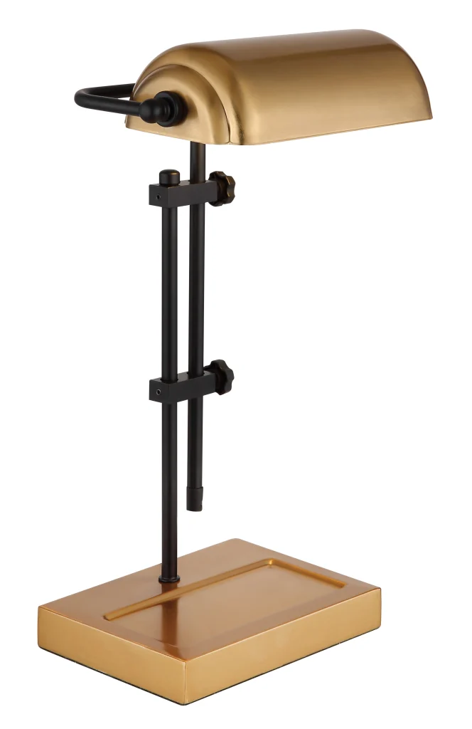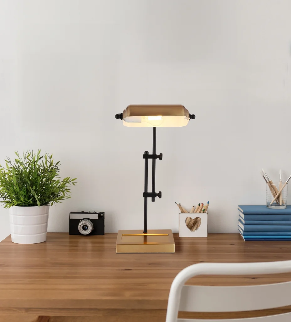 MARID METALNA STONA LAMPA CRNA MAT je ekskluzivna bankarska lampa koja se ističe svojim elegantnim dizajnom i dve ravne cevi. Lampa se može podesiti po visini, što omogućava postavljanje na različite stolove ili police. Telo je napravljeno od metala u mat crnoj boji, kombinovano sa metalom u antičkoj zlatnoj nijansi, što joj daje plemenit i luksuzan karakter. Abažur je napravljen od metala u antičkoj zlatnoj i beloj boji, što stvara čist i moderan izgled. Prekidač na kablu omogućava lako rukovanje. MARID METALNA STONA LAMPA je savršen dodatak za svaku dekoraciju, bilo da je postavljate u kancelariju, dnevnu sobu ili trpezariju.