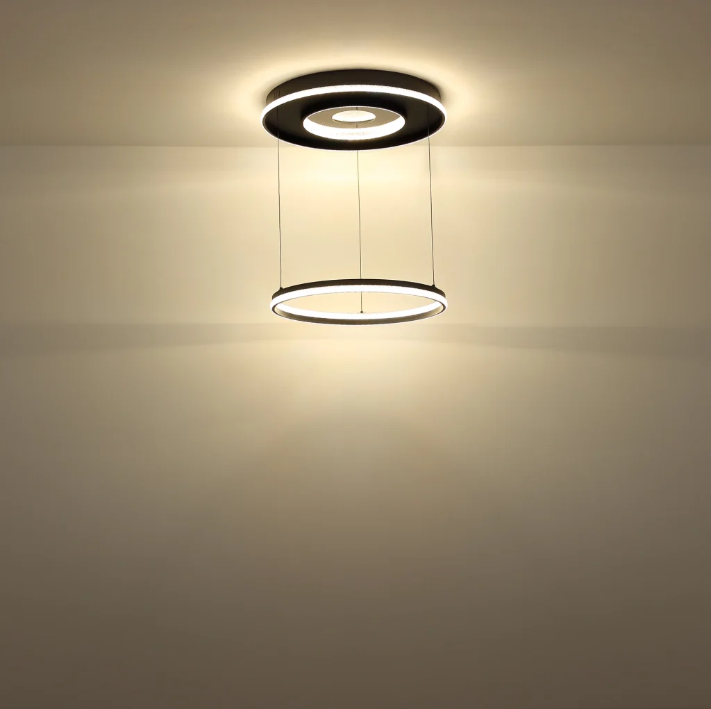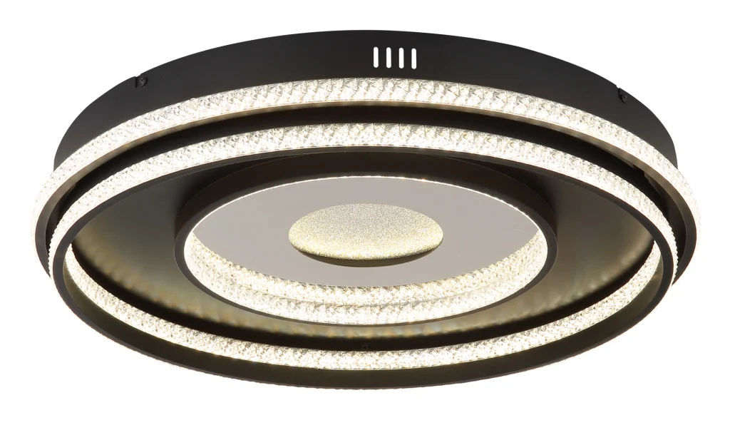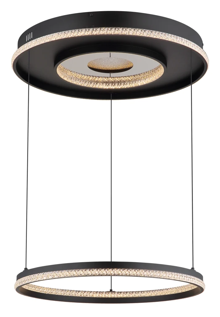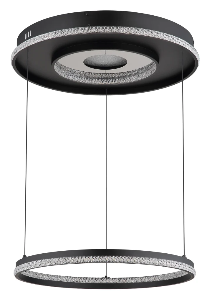 Viseća lampa MARSH kombinuje moderan dizajn sa funkcionalnošću i predstavlja pravi vrhunac vašeg doma. Telo napravljeno od crnog metala i mat aluminijuma obezbeđuje elegantan izgled, dok abažur napravljen od providnih plastičnih kristala i ogledalne plastike sa kristalnim efektom reflektuje svetlost u fascinantnim šarama. Lampa je podesiva po visini i stoga se može savršeno prilagoditi vašim potrebama. Pomoću priloženog daljinskog upravljača možete kontinuirano prigušiti osvetljenost i podesiti temperaturu boje od 2700K do 6500K kako biste stvorili željenu atmosferu. Zahvaljujući funkciji memorije, vaša željena podešavanja se mogu sačuvati i pozvati u bilo kom trenutku. Lampa takođe nudi praktično noćno svetlo. Sa prečnikom od 600 mm i svetlosnim snagama od 2035 lumena, viseća lampa MARSH pruža prijatno i ravnomerno osvetljenje u vašoj sobi.