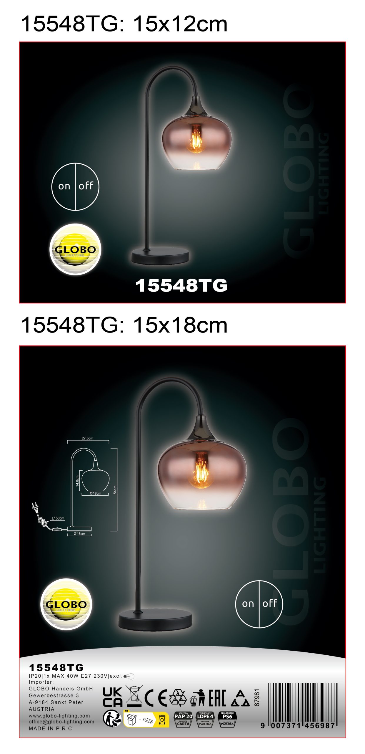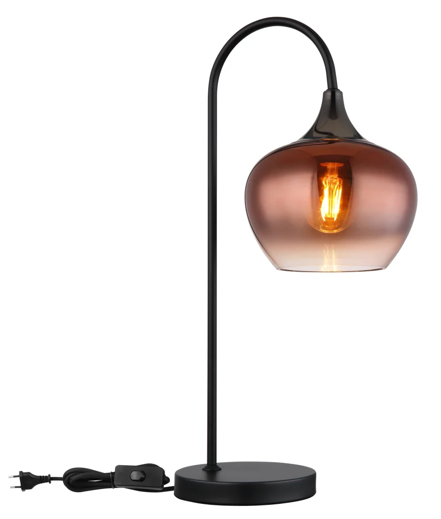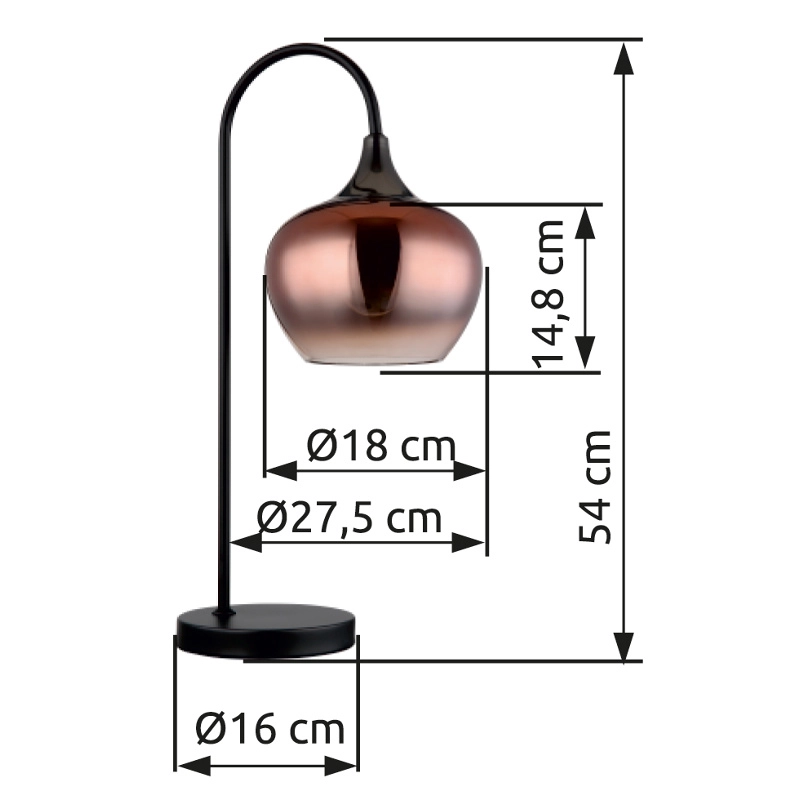 Stona lampa MAXY je elegantan komad dizajna sa cevčicom zakrivljenom na vrhu i telom od crnog mat ili crnog hromiranog metala. Abažur lampe je napravljen od okruglog, lukovičastog stakla u atraktivnom abažuru boje bakra, što stvara toplu i prijatnu atmosferu osvetljenja. Stona lampa MAXY je opremljena praktičnim prekidačem na kablu, što je čini jednostavnom za upotrebu. Sa dimenzijama D: 275 mm i Š: 180 mm, lampa je idealna kao dekorativni element na bilo kom stolu ili bočnom stočiću. Stona lampa MAXY kombinuje visokokvalitetne materijale, moderan dizajn i stilski izgled što je čini savršenim dodatkom svakom domu. Pogodna je za viseće svetiljke i kao stilsko rešenje za osvetljenje modernih stilova nameštaja.