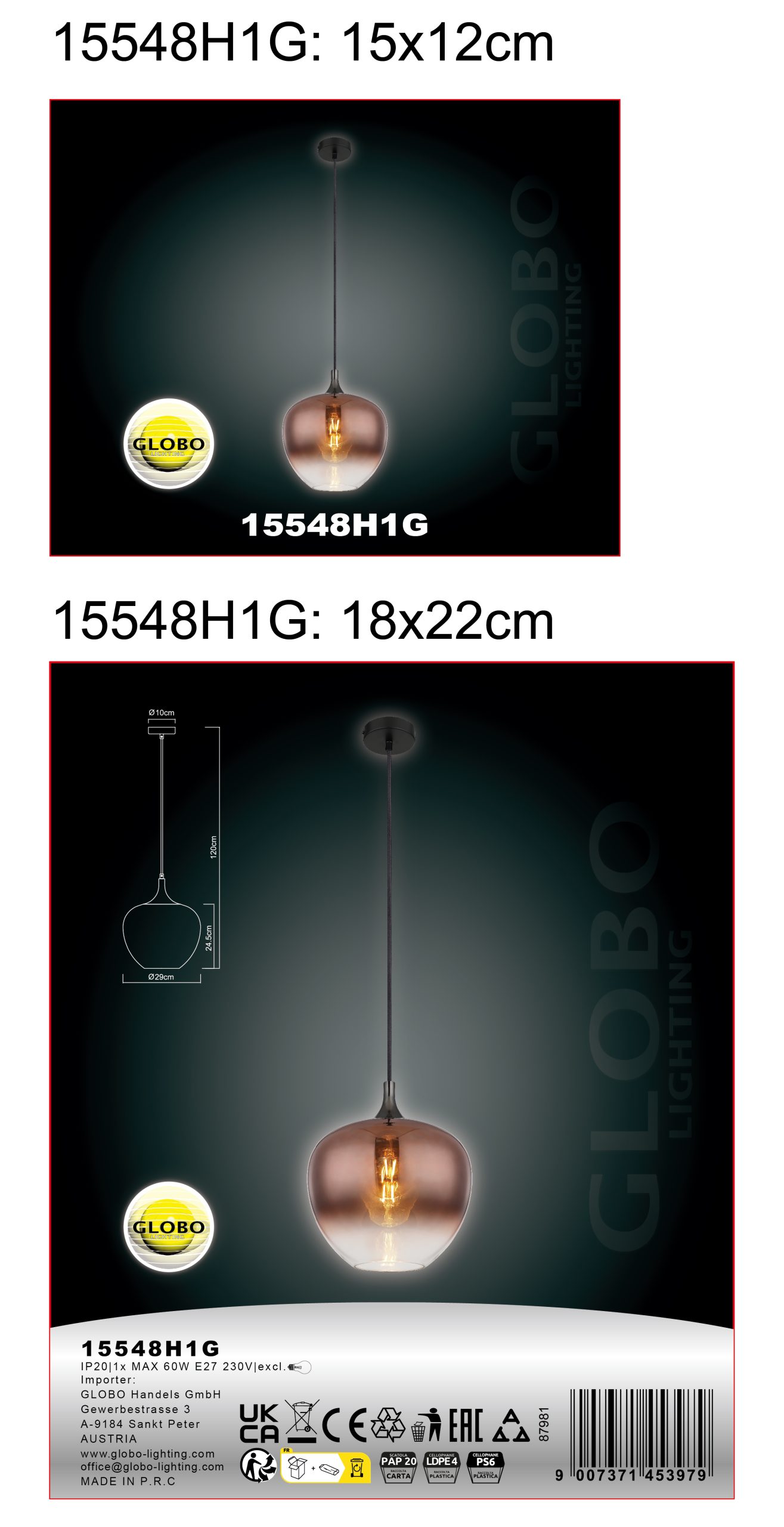 Viseća lampa MAXY impresionira svojim okruglim i lukovičastim staklom, koje stvara privlačnu atmosferu osvetljenja. Telo napravljeno od crnog mat i crnog hromiranog metala daje lampi moderan i elegantan izgled. Abažur je napravljen od providnog, gradijentnog stakla u prijatnom bakarnom tonu koji stvara toplu atmosferu. Sa prečnikom od 290 mm, viseća lampa MAXY pruža prijatno i ravnomerno svetlo koje optimalno osvetljava prostoriju. Viseća svetiljka MAXY kombinuje visok kvalitet, atraktivan dizajn i funkcionalnost u jednom proizvodu. Ova lampa postavlja stilske akcente u svakoj prostoriji i privlači pažnju u svakom modernom enterijeru.