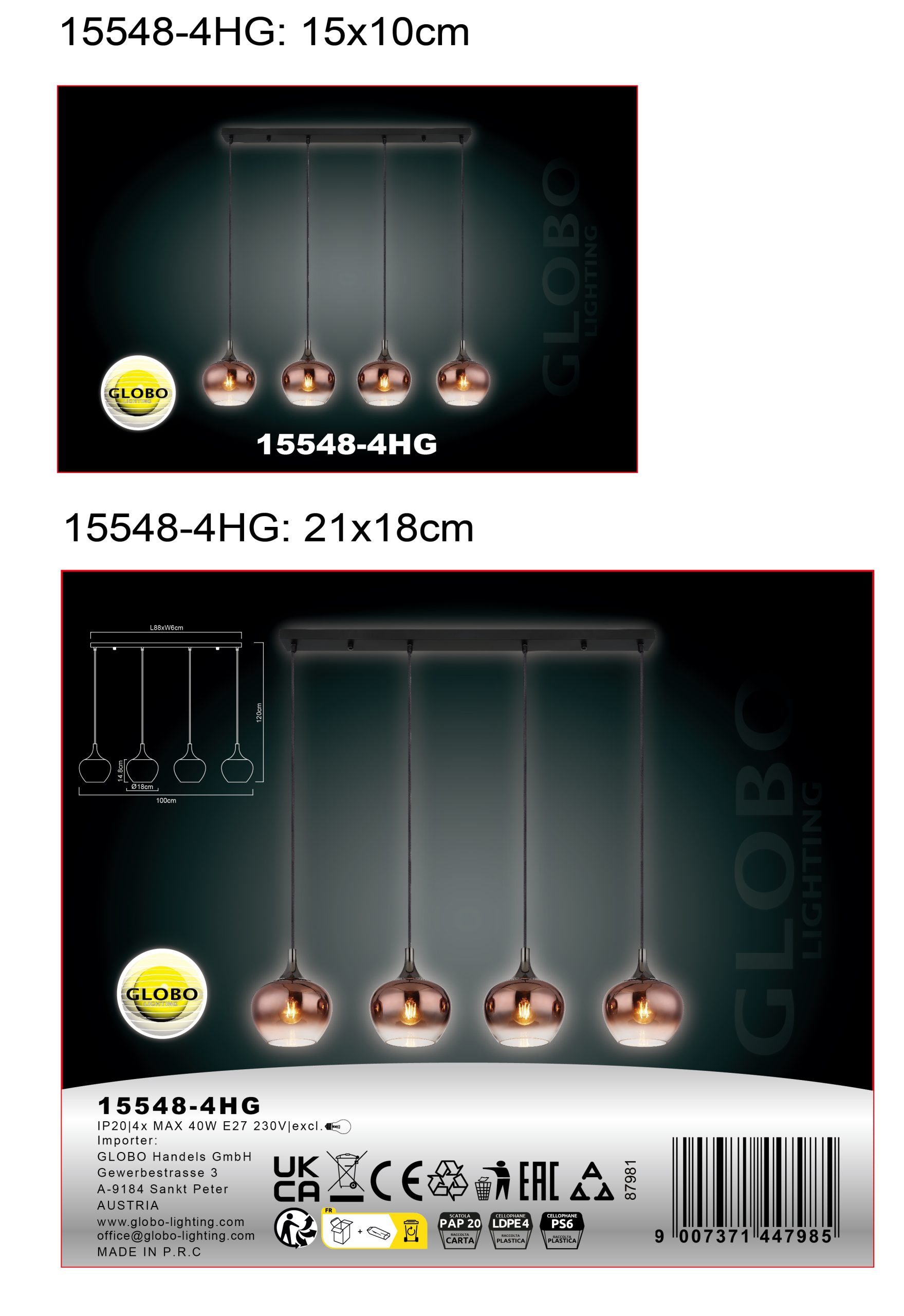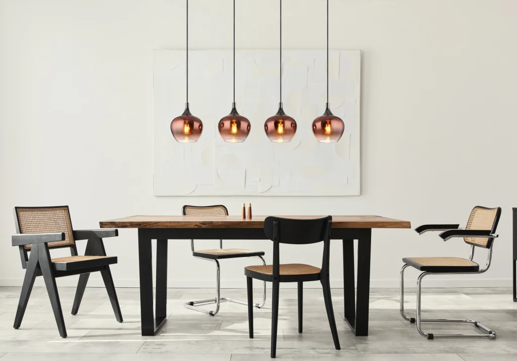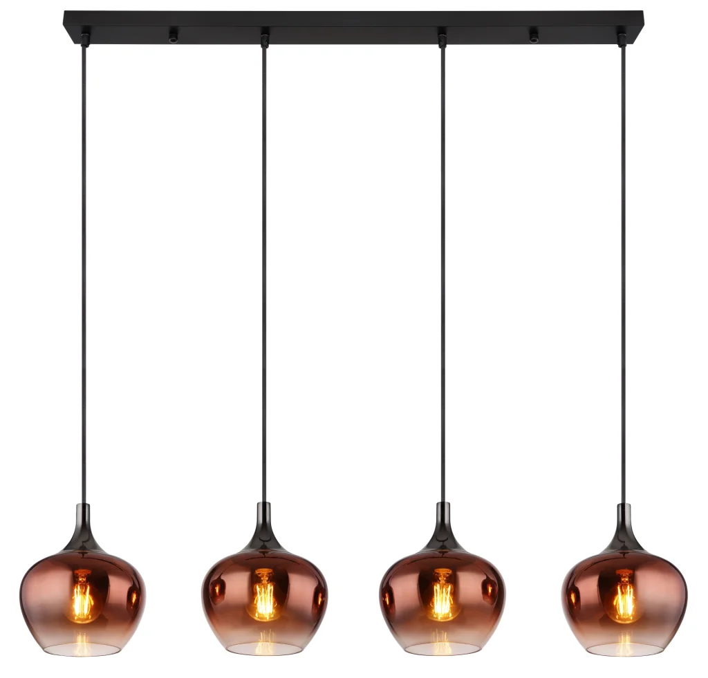 Viseća lampa MAXY impresionira svojom ravnom šinom i četiri viseća, lukovicasta stakla, koja su stilski vrhunac u svakoj prostoriji. Telo napravljeno od crnog mat i crnog hromiranog metala daje lampi moderan i plemenit izgled. Abažuri napravljeni od stakla boje bakra imaju jasan i gradijentni dizajn, što obezbeđuje posebnu difuziju svetlosti. Sa dužinom od 1000 mm i širinom od 180 mm, viseća lampa daje prijatno svetlo i stvara ugodnu atmosferu u prostoriji. Viseća svetiljka MAXY nije samo funkcionalna, već i dekorativni element u vašem enterijeru. Sa svojim modernim dizajnom i visokokvalitetnom izradom, ova svetiljka postavlja elegantne akcente i pruža harmonično osvetljenje u prostoriji.