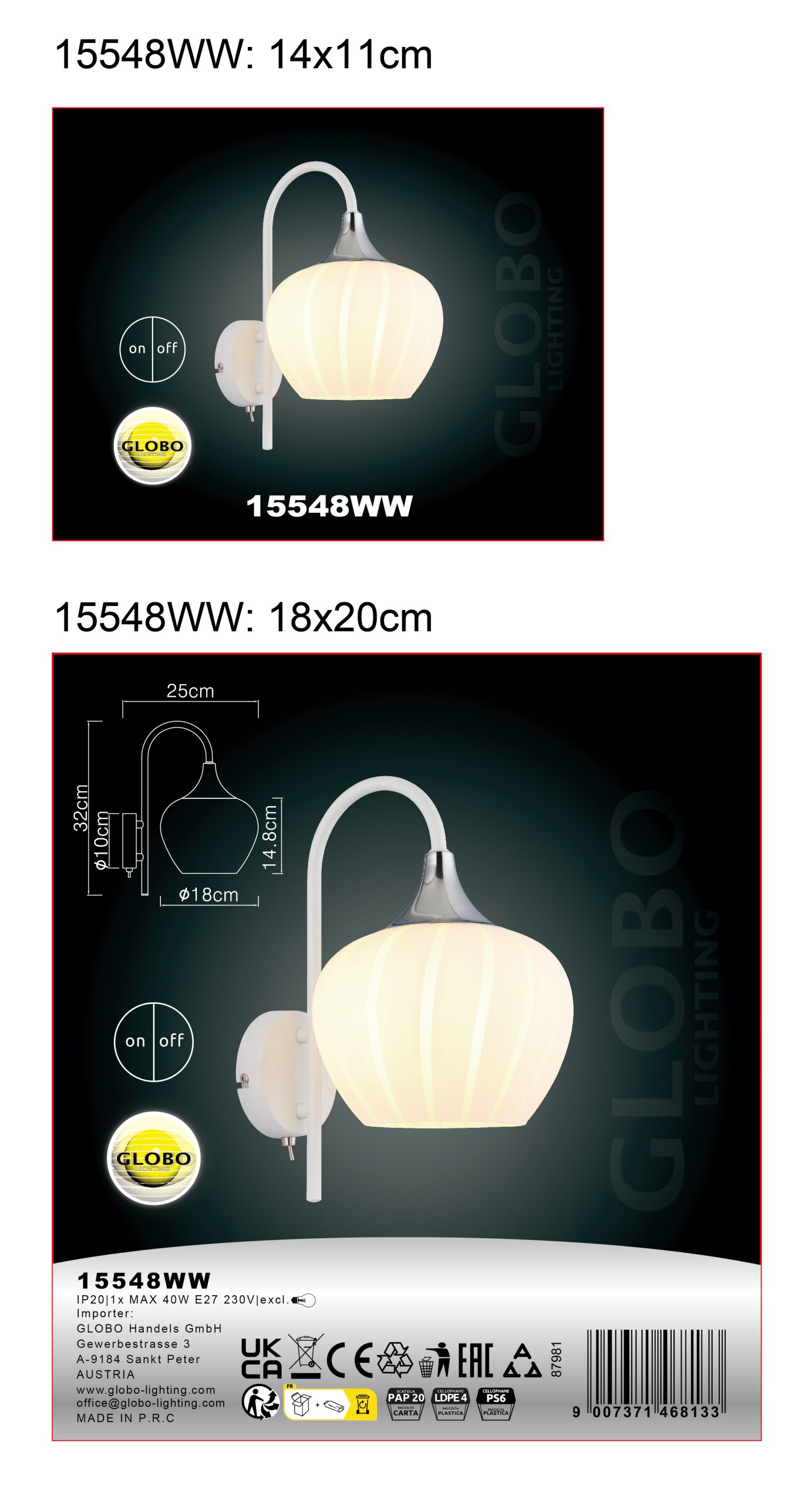Zidna lampa MAXY je jedinstveno i elegantno rešenje za osvetljenje koje se ističe svojom modernom estetikom i pametnim dizajnom. Abažur je napravljen od opal satenskog stakla sa dekorativnim žlebovima, što je dekorativni element. Lufasto staklo sa žlebovima je oblikovano u obliku šolje i nagnuto je nadole zakrivljenom strukturom. Telo je napravljeno od belog, mat metala ili hromiranog metala. Prekidač na lampi omogućava lako regulisanje osvetljenja. Zidna lampa MAXY je savršena za moderne dnevne sobe, kancelarije i druge prostorije gde vam je potrebno savremeno i energetski štedljivo osvetljenje. Dostupna je u dve različite završne obrade: mat bela ili hromirana.