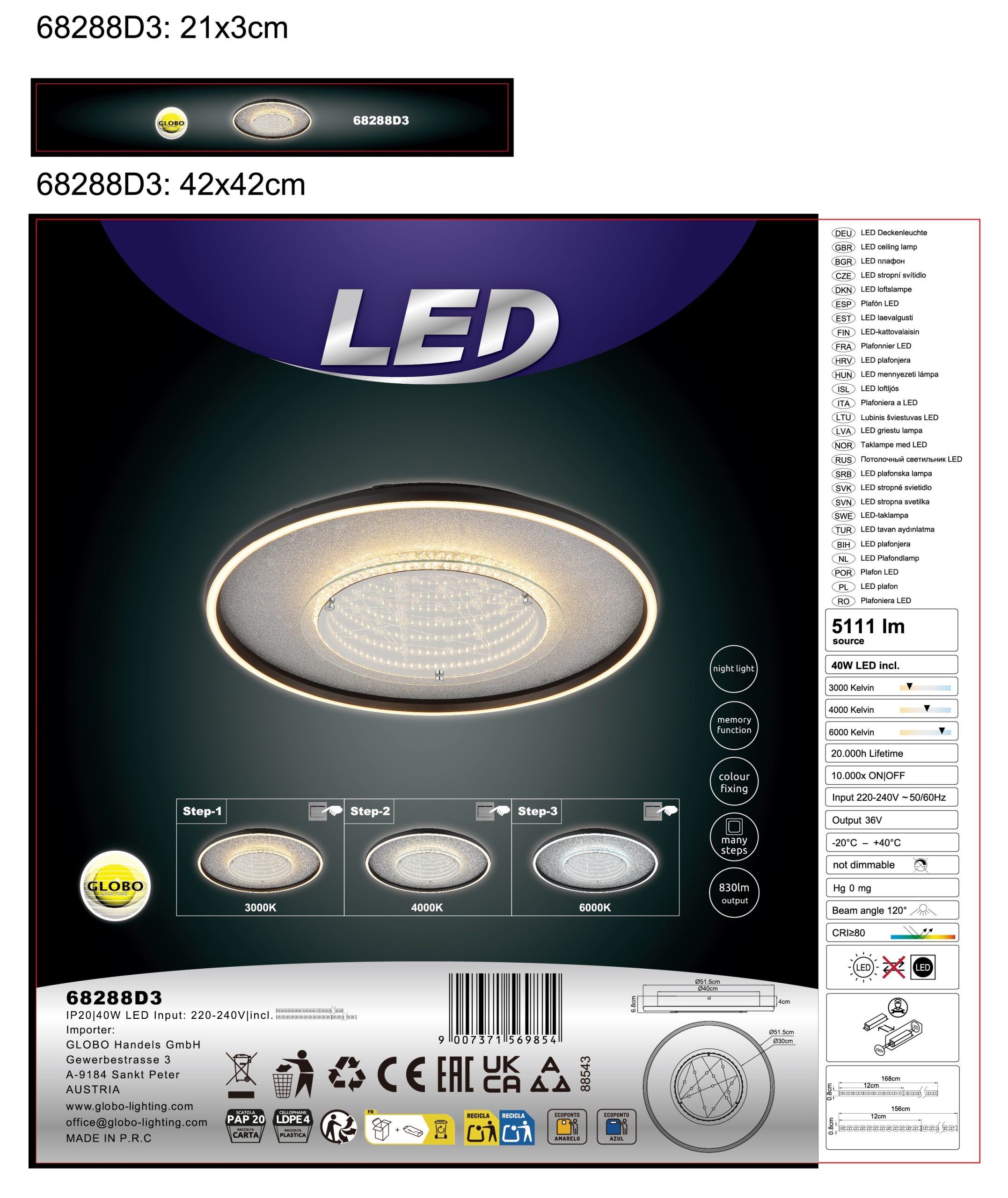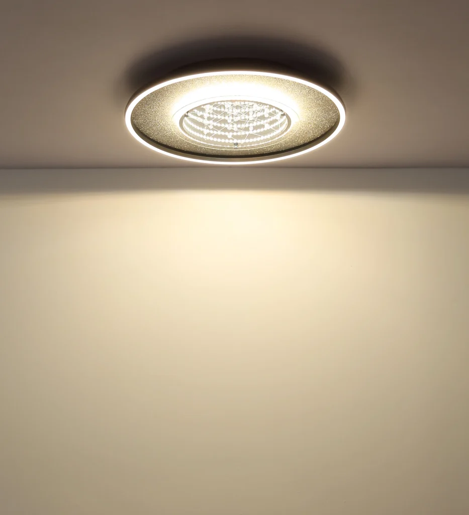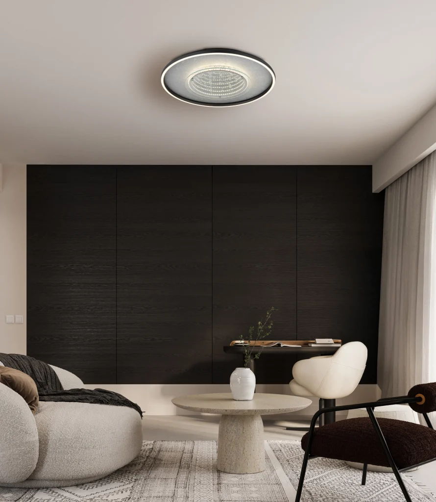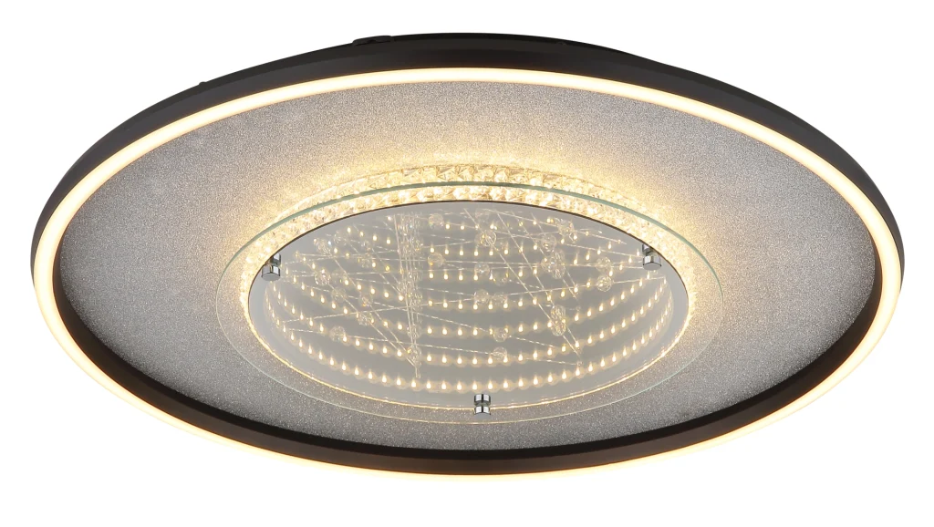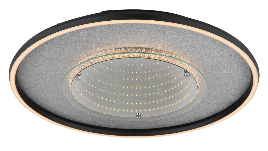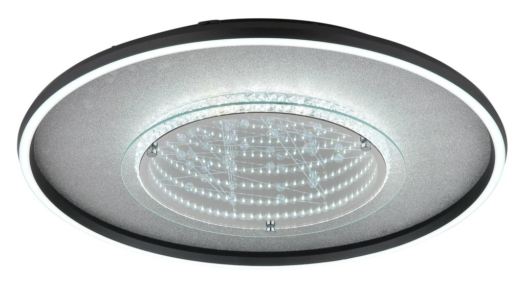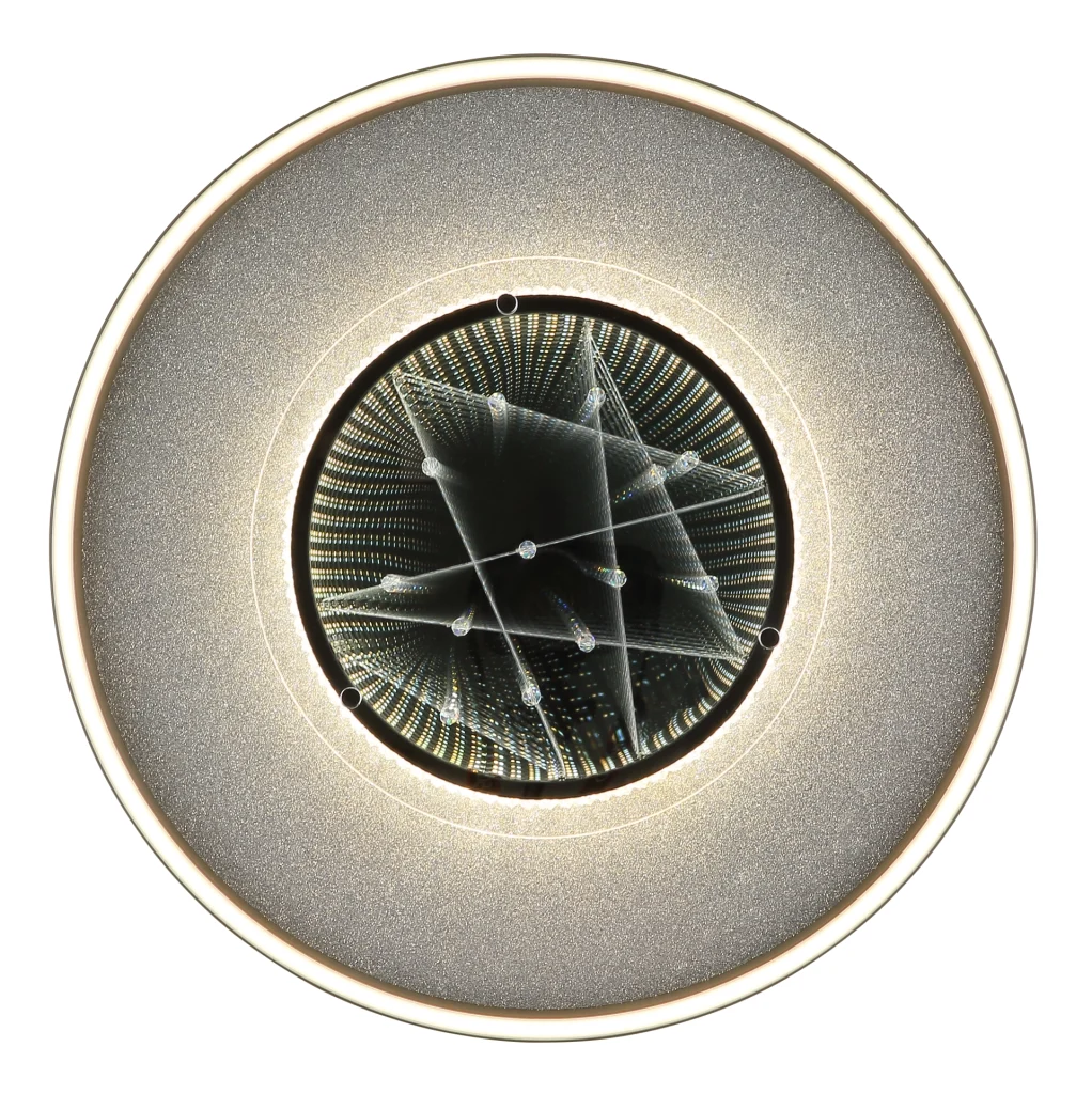 Okrugla plafonska lampa MIRRORA impresionira svojim jedinstvenim efektom tunela i providnim plastičnim kristalima unutra, stvarajući fascinantnu 3D igru svetlosti. Telo je napravljeno od mat crnog aluminijuma i kombinuje srebrne i hromirane metalne elemente, dajući lampi moderan, elegantan izgled. Abažur od ogledalskog stakla sa detaljima od opal plastike pojačava efekat i stvara atmosferski ambijent. Sa prečnikom od 515 mm, MIRRORA je idealna za dnevne sobe, spavaće sobe ili elegantne ulazne prostore. Integrisana LED dioda isporučuje 830 lumena i nudi fleksibilnu temperaturu boje od toplo bele (3000 K) do dnevne bele (6000 K). Boje se mogu fiksirati, a funkcija memorije čuva poslednje podešavanje. Praktično noćno svetlo upotpunjuje karakteristike. MIRRORA kombinuje moderan dizajn sa inovativnom tehnologijom osvetljenja i savršena je plafonska lampa za sofisticirane životne prostore.