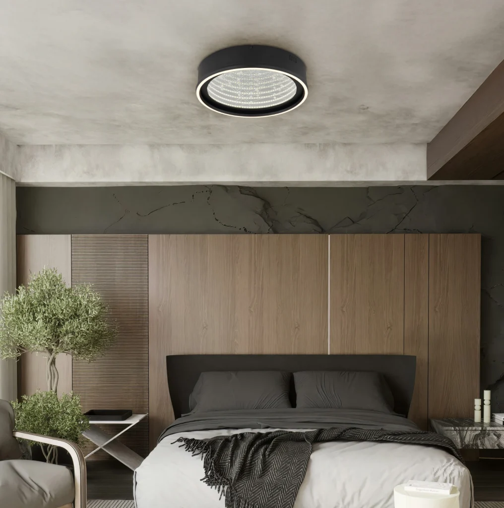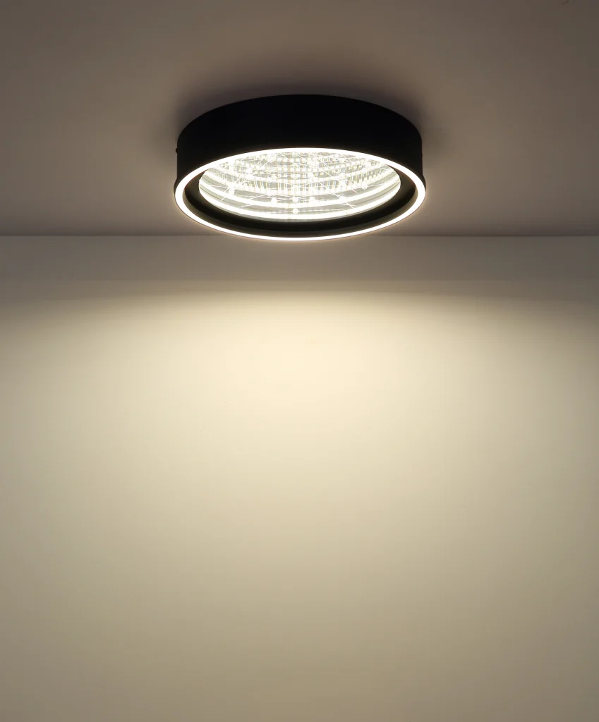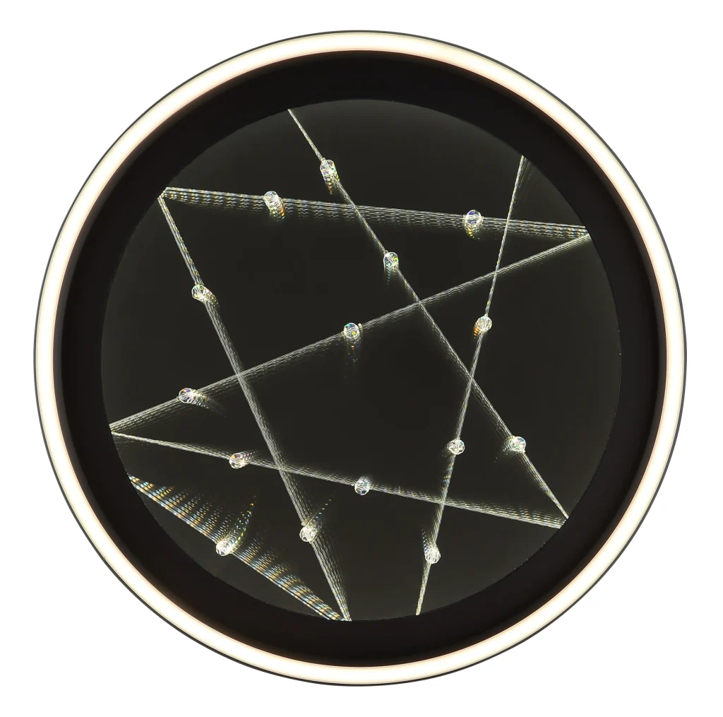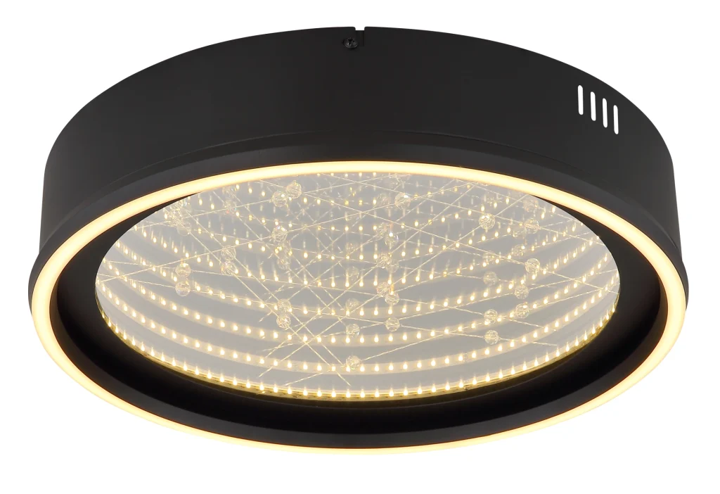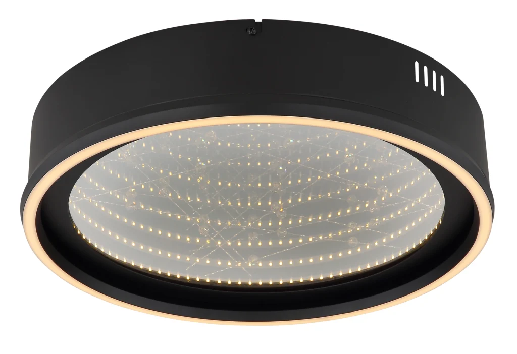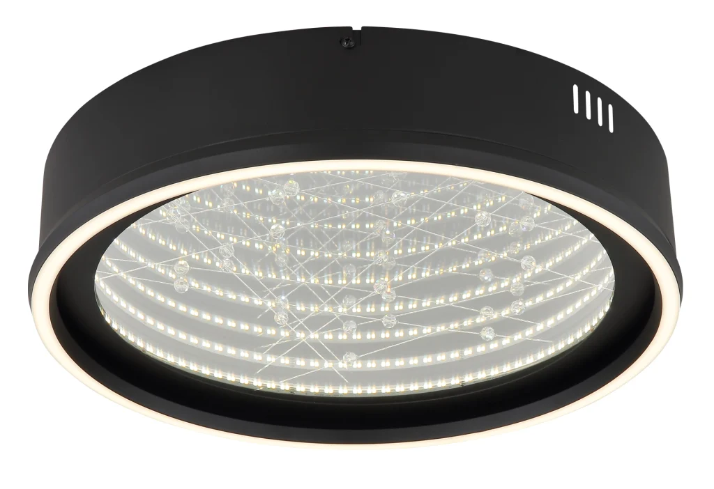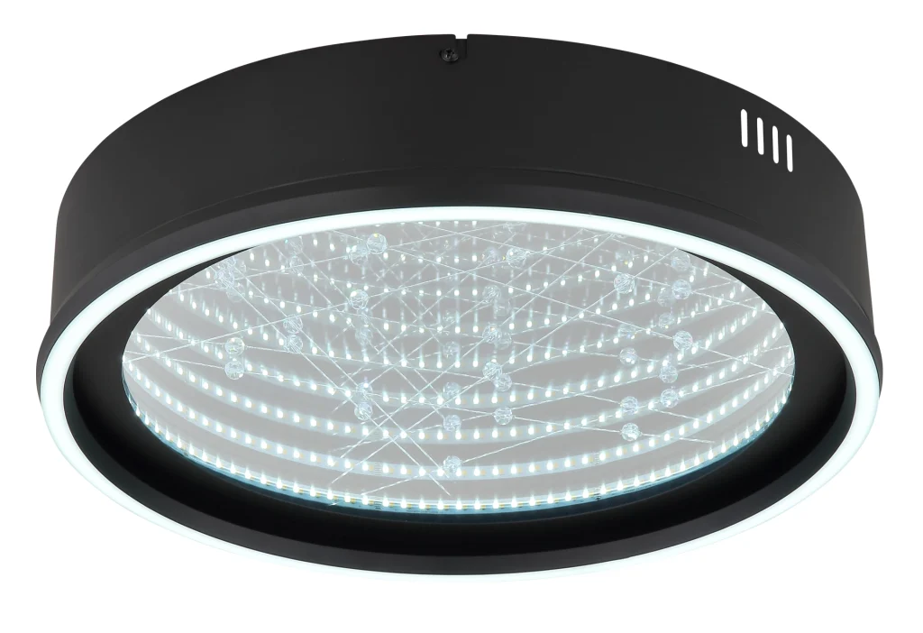 Okrugla plafonska lampa MIRRORA impresionira svojim fascinantnim efektom tunela i providnim plastičnim kristalima unutra, stvarajući impresivnu 3D igru svetlosti. Mat crno metalno i aluminijumsko kućište savršeno dopunjuje abažur od ogledalskog stakla, poboljšan detaljima od opal plastike. Sa prečnikom od 515 mm, MIRRORA pruža atmosfersko i ravnomerno osvetljenje u dnevnim sobama, spavaćim sobama ili elegantnim ulaznim prostorima. Lampa se može prigušiti i dolazi sa daljinskim upravljačem, što omogućava fleksibilno podešavanje temperature boje od toplo bele (2700 K) do hladno bele (6500 K). Boje se mogu fiksirati, a praktična funkcija memorije čuva poslednje podešavanje. Integrisano noćno svetlo upotpunjuje paket udobnosti. Ugrađena LED dioda isporučuje 899 lumena, obezbeđujući energetski efikasno osvetljenje i dug vek trajanja. MIRRORA kombinuje moderan dizajn sa inovativnom tehnologijom osvetljenja i savršen je izbor za sofisticirane životne prostore.