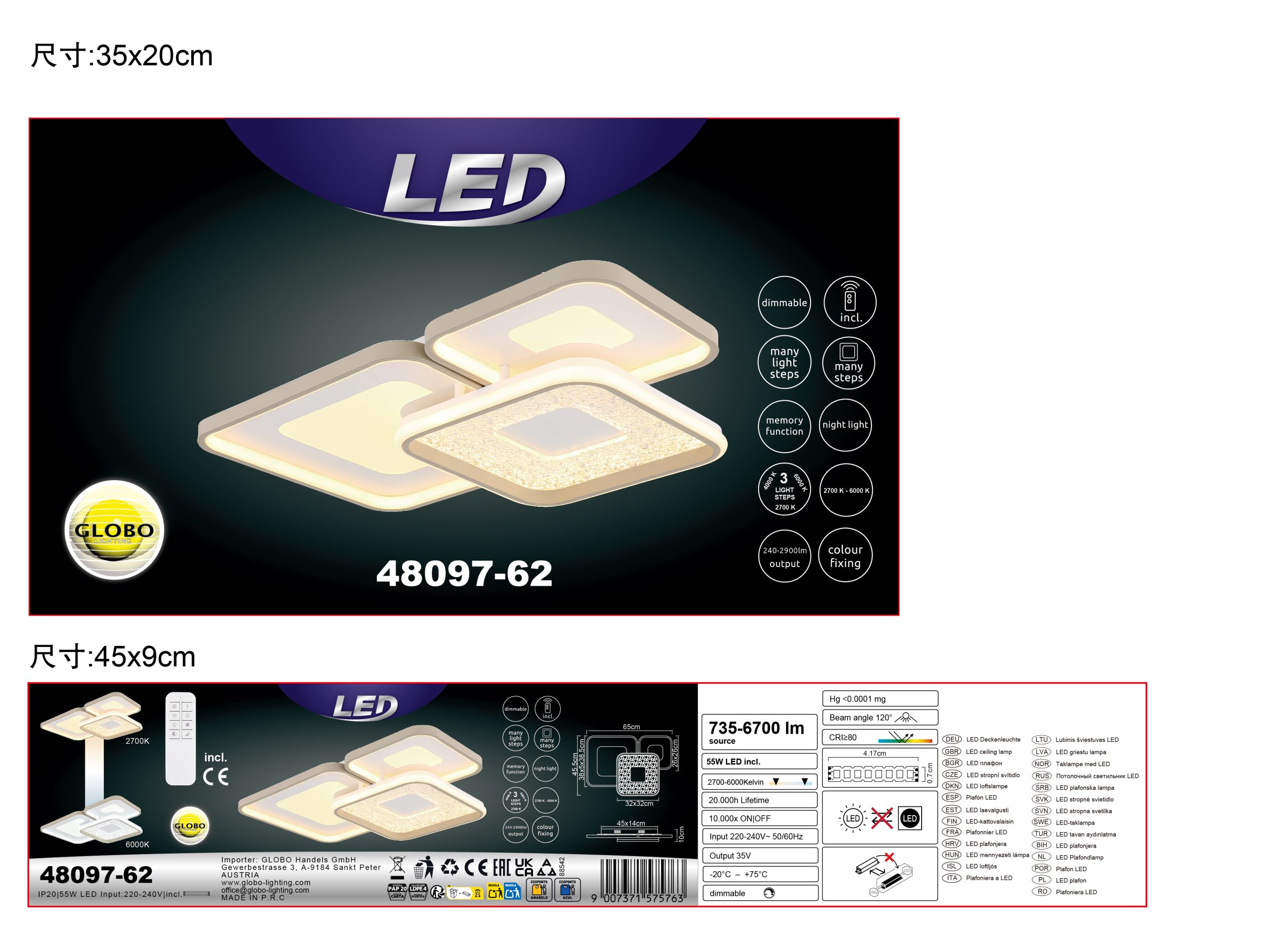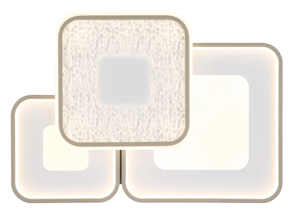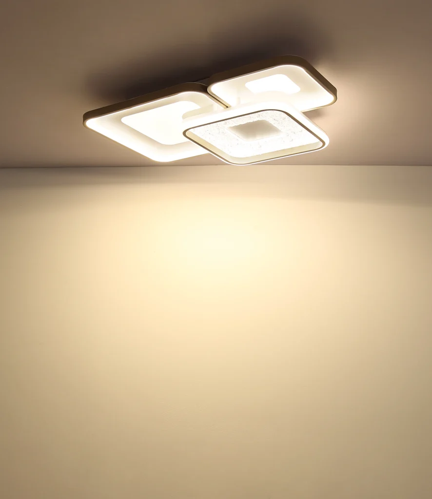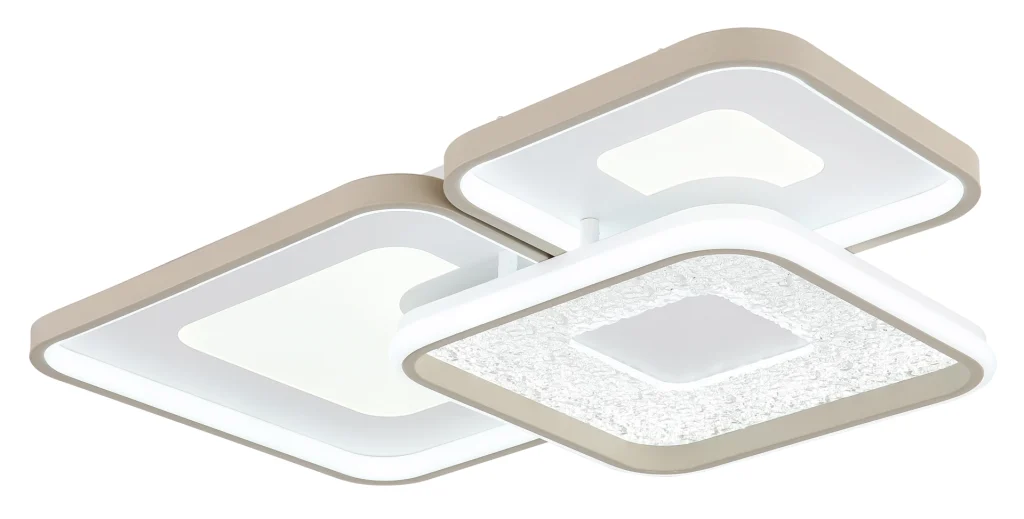 Pravougaona plafonska svetiljka MOSAIKO impresionira svojim modernim dizajnom sa tri vertikalno postavljena kvadrata, stvarajući arhitektonski upečatljiv svetlosni uzorak. Telo napravljeno od mat belog i metala boje peska daje lampi elegantan, nenametljiv izgled, dok abažuri od opal akrila sa providnim akrilnim dekorom obezbeđuju ravnomernu i prijatnu raspodelu svetlosti. Dimenzijama D: 650 mm i Š: 455 mm sa svetlosnim snagama od 2900 lumena, idealna je za dnevne sobe, trpezarije ili moderne radne prostore. Integrisana LED tehnologija (uključena) garantuje energetsku efikasnost i dug vek trajanja. Upravljanje je praktično pomoću priloženog daljinskog upravljača: može se prigušiti, sa fiksnim bojama, funkcijom memorije i praktičnom opcijom noćnog svetla. Zahvaljujući CCT funkciji, temperatura boje se može fleksibilno podesiti od toplo bele 2700 K do dnevne bele 6000 K. MOSAIKO savršeno kombinuje moderan dizajn, funkcionalnost i atmosfersko osvetljenje.