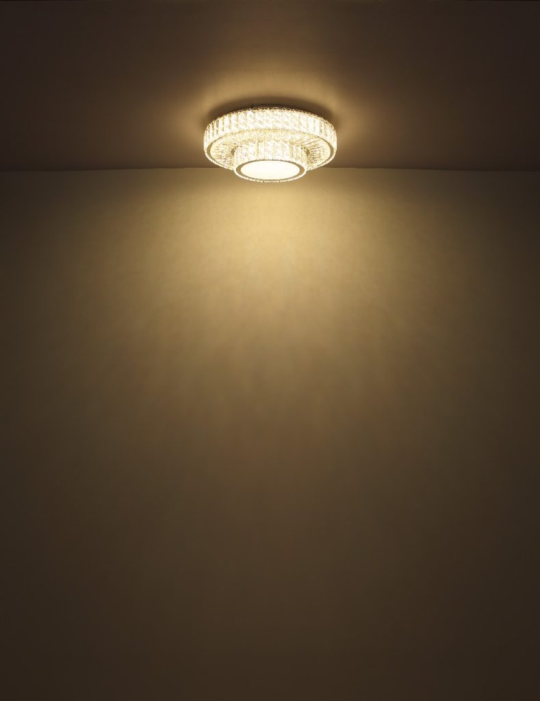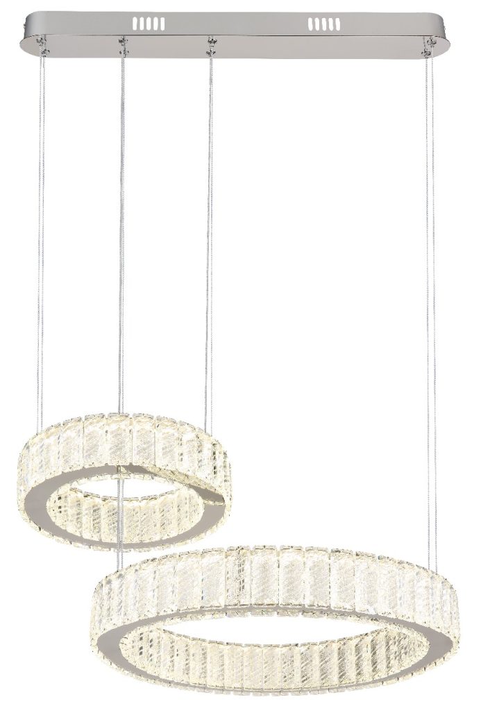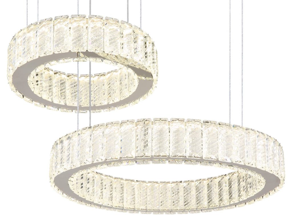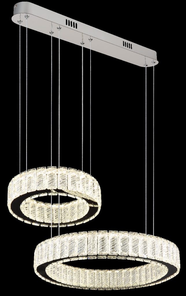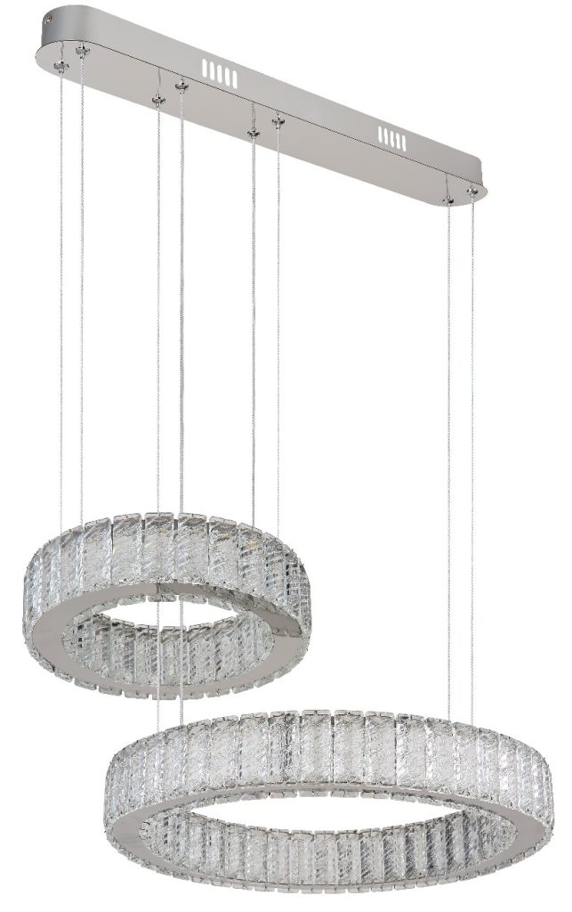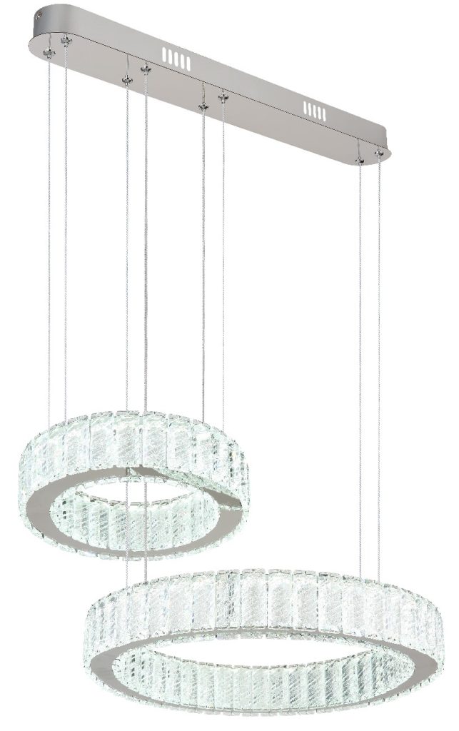 Visilica serije MUCKY napravljena od hromiranog metala i providnih K5 kristala koji lepo reflektuju svetlost. Hromirani prsten daje sofisticirani izgled lampi. Kabl je napravljen od PVC-a i providan je. Lampa ima mogućnost zatamnjivanja i može se kontrolisati preko zidnog prekidača. Boja se može prilagoditi i fiksirati. Ima funkciju memorije, noćno svetlo i daljinski upravljač (baterije 2AAA nisu uključene). Dimenzije: DxŠxV: 630x500x1200 mm i sastoji se od dva prstena prečnika 30 i 50 cm. Lampu napaja LED dioda snage 80W i napona 230volti. Temperatura boje može se podesiti između 2700K i 6000K. Jedinstvrnom kombinacijom modernog dizajna i visokokvalitetnih materijala, privlačiće poglede u svakoj prostoriji.