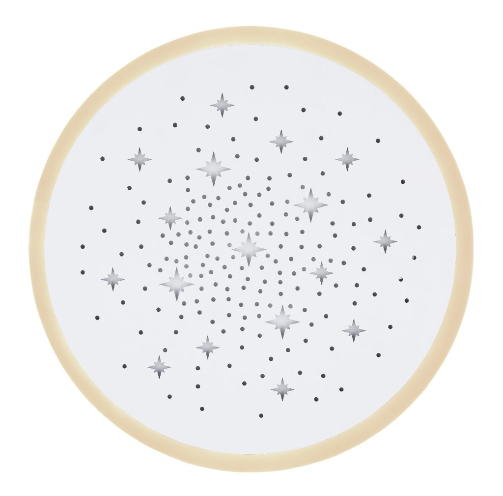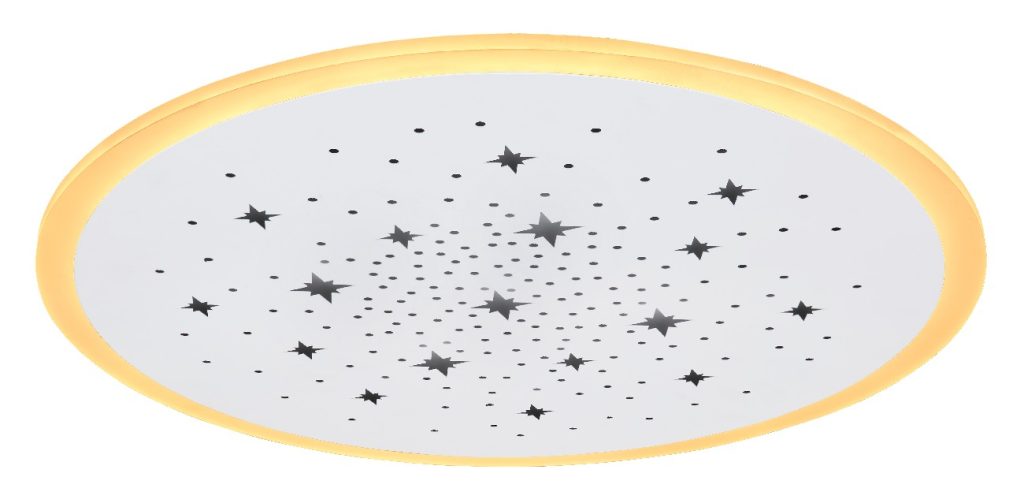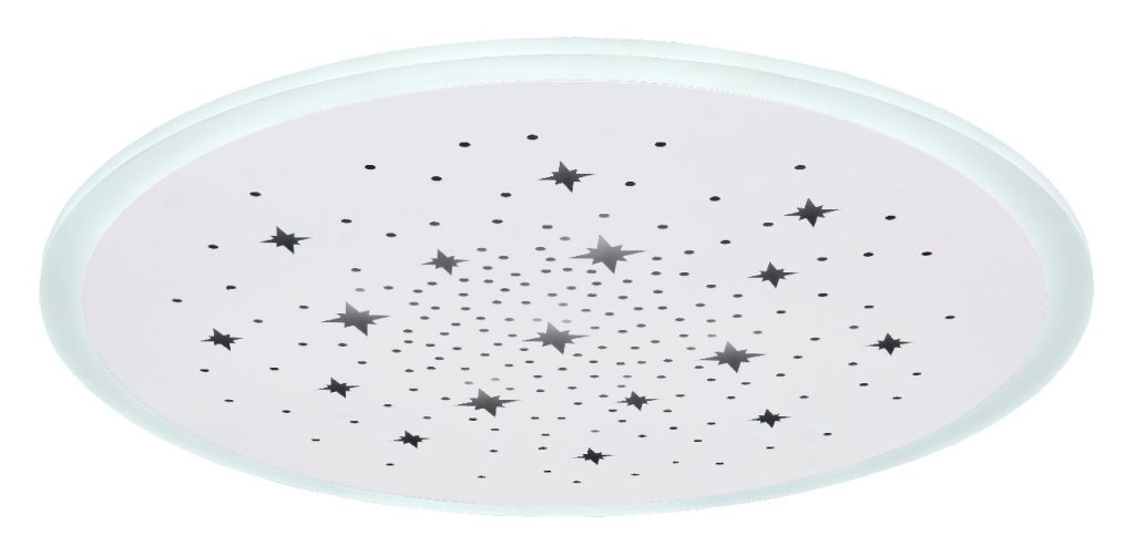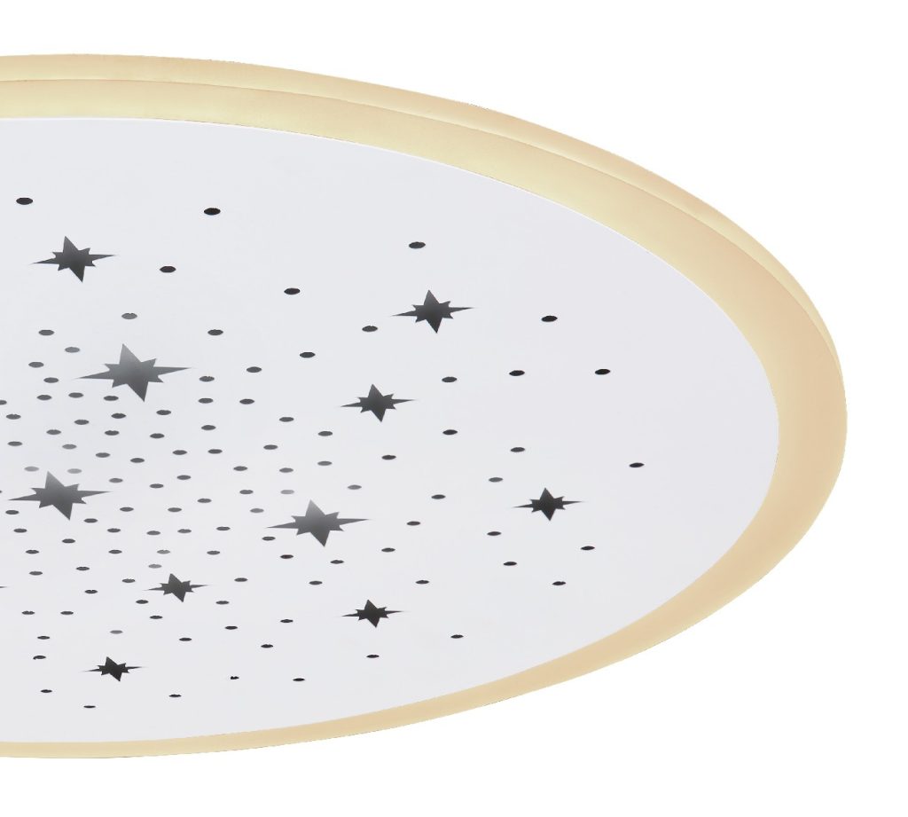 Ova okrugla plafonska lampa iz serije Merfi (ø 38 cm) je divna za vaš enterijer. Sastoji se od plastičnog prstena koji obuhvata okruglu, belu metalnu ploču, koja je opremljena perforacijama u obliku zvezde i okruglim perforacijama. One se mogu osvetljavati u RGB bojama. Sa uključenim LED sijalicama, plafonska lampa pruža 1300 lumena jake svetlosti. Pored toga, možete ih ne samo prigušiti pomoću priloženog daljinskog upravljača, već i pojedinačno podesiti boju svetlosti u nekoliko nivoa između 2700 Kelvina (toplo bela) i 6500 Kelvina (hladno bela), a takođe ima i funkciju noćnog svetla. Sa drugim modelima iste serije možete upotpuniti celokupnu sliku u svoja četiri zida.