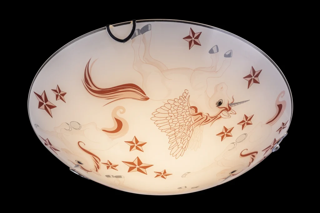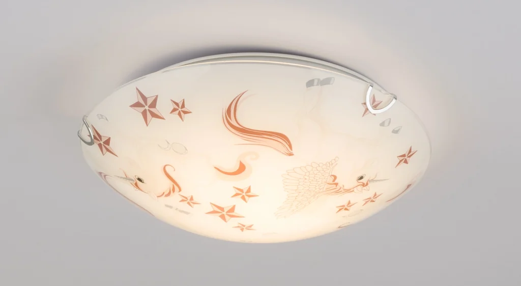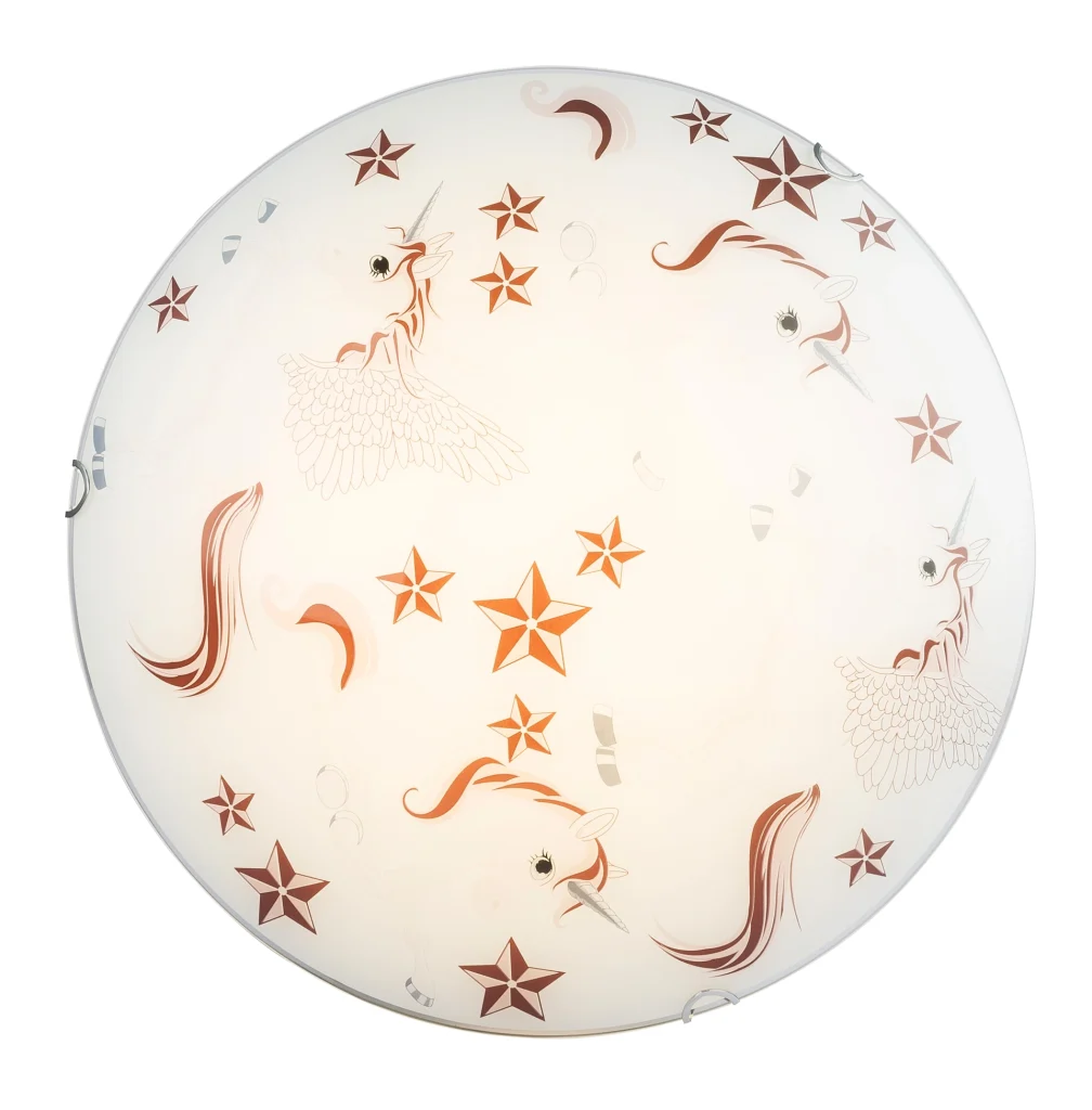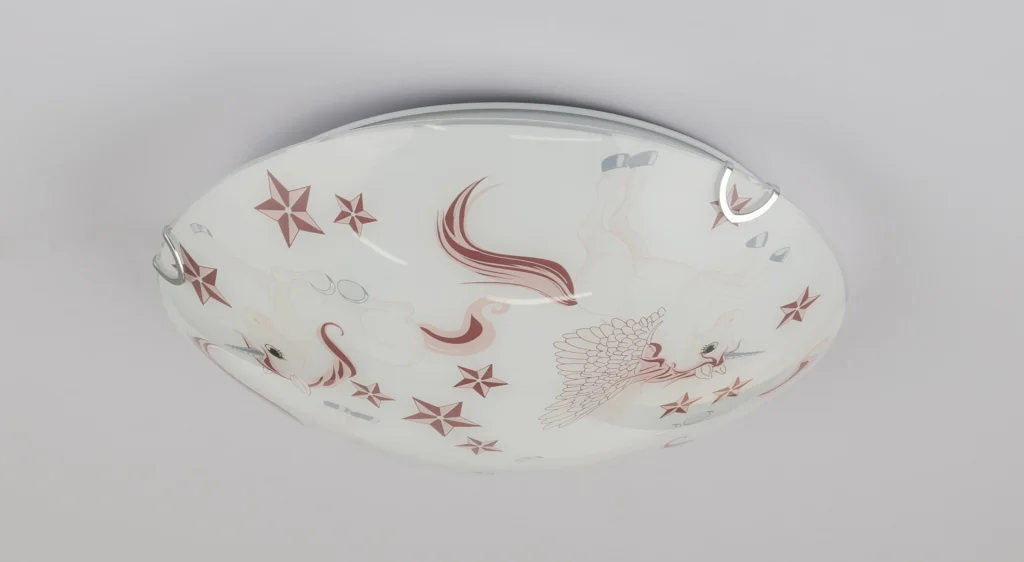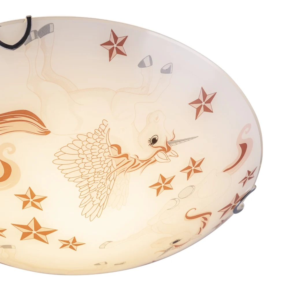 Ova okrugla plafonska lampa (Ø30 cm) je posebno pogodna za dečije sobe sa svojim belim i ružičastim staklom sa motivima jednoroga. Ova plafonska lampa pruža jako svetlo neutralne bele boje svetlosti od 4000K sa ugrađenom LED diodom od 960 lumena.