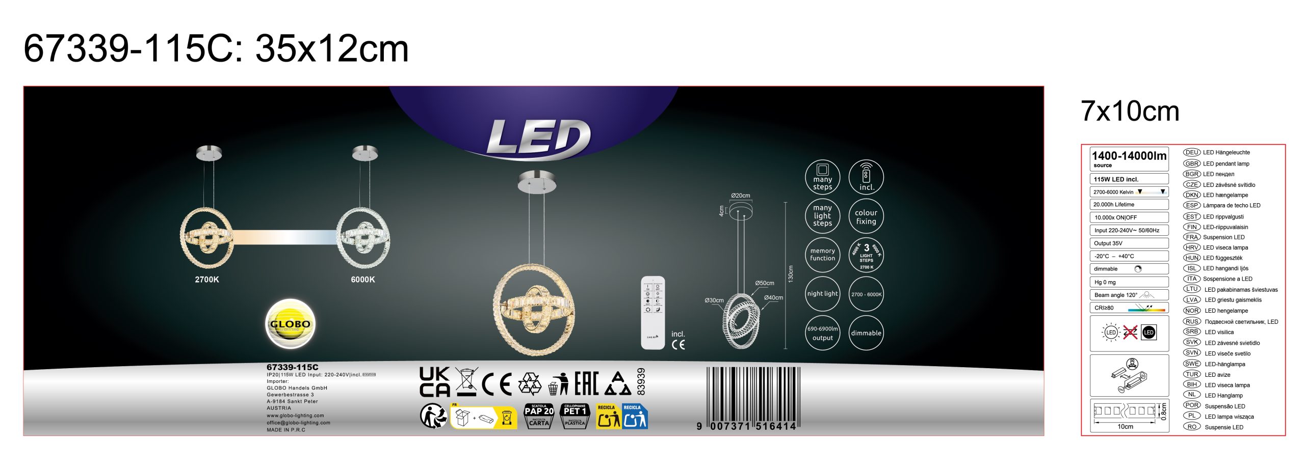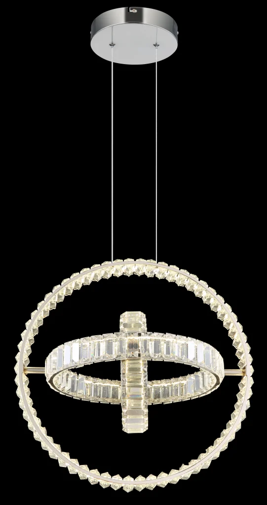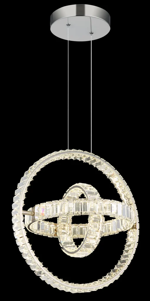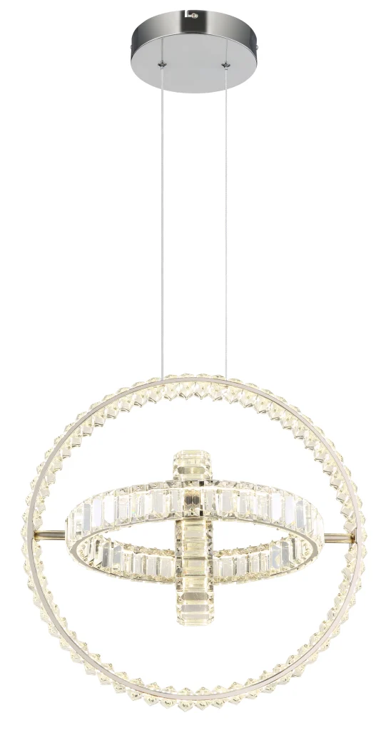 Viseća lampa NEIL impresionira svojim modernim dizajnom i inovativnom tehnologijom. Tri isprepletena, rotirajuća prstena napravljena od hromiranog metala i nerđajućeg čelika stvaraju fascinantnu igru svetlosti i postavljaju stilske akcente u vašoj sobi. Abažur napravljen od providnih K5 kristala obezbeđuje briljantan odraz svetlosti i elegantan izgled. Sa dužinom od 500 mm i širinom od 400 mm, lampa je savršena za veće prostorije i postavlja elegantne akcente. Viseća lampa NEIL se može prigušiti i nudi podesivu temperaturu boje (CCT) od 2700K do 6000K, što vam omogućava da podesite svetlost u zavisnosti od raspoloženja i potreba. Zahvaljujući integrisanom daljinskom upravljaču, možete fiksirati boje, regulisati osvetljenost i koristiti praktičnu funkciju memorije. Funkcija noćnog svetla takođe pruža nežno osvetljenje. Sa svetlosnim snagama od 6900 lumena i integrisanom LED tehnologijom, viseća lampa NEIL je vrhunac i funkcionalno i estetski.
