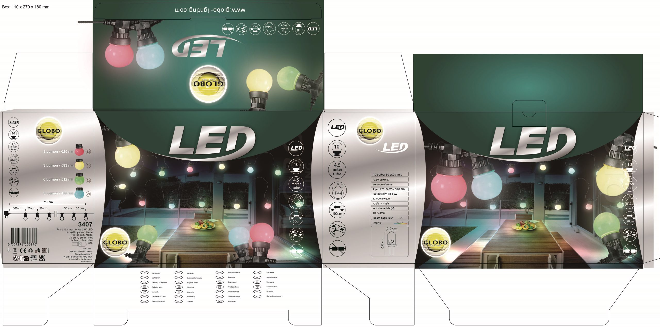 Ovaj niz svetala iz serije proizvoda Nirvana pruža šareno osvetljenje. 10 šarenih sijalica napravljenih od opal plastike pričvršćene su na crni lanac sa rastojanjem od 50 cm svaka. Verzija dužine 450 cm povezana je na napajanje dužine tri metra. Zbog stepena zaštite IP44, ovaj proizvod je savršen za spoljašnju upotrebu. Ulepšajte svoj dnevni boravak drugim proizvodima iz ove serije.