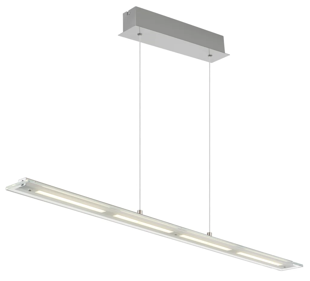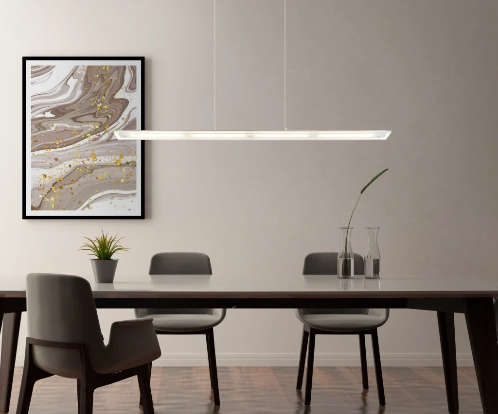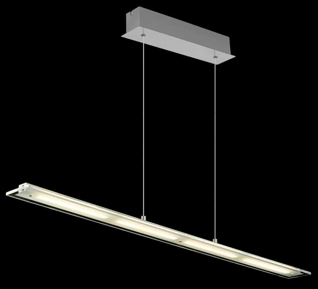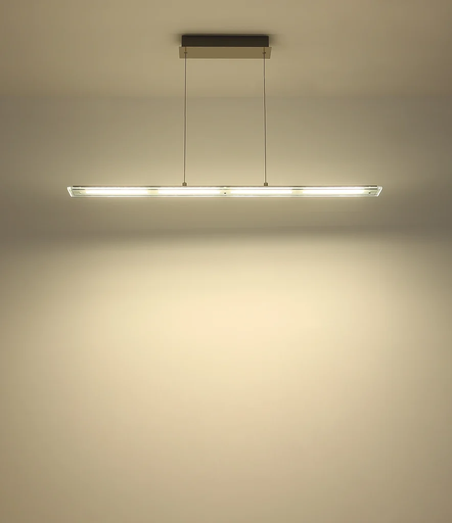 Viseća lampa NOVAK kombinuje moderan, linearan dizajn sa inovativnom funkcionalnošću, dodajući stilske akcente iznad trpezarijskih stolova, radnih prostora ili dnevnih boravka. Pravougaoni snop napravljen od mat nikl metala zrači visokokvalitetnom elegancijom, dok abažur od providnog i matiranog stakla ravnomerno raspoređuje svetlost, stvarajući prijatnu atmosferu bez odsjaja. Svetlo se može podesiti po visini, što omogućava optimalno prilagođavanje različitim visinama plafona i veličinama stolova. Sa dimenzijama D: 1150 mm, Š: 90 mm, viseća lampa NOVAK ostavlja upečatljiv utisak, a da ne preopterećuje prostoriju. Integrisana LED dioda pruža 1420 lumena sa podesivom temperaturom boje od 3000 K do 6500 K, koja se može prigušiti pomoću bezstepenog dodirnog dimera. Boje se mogu fiksirati, a funkcija memorije čuva vaše željeno podešavanje osvetljenja. Zahvaljujući vrhunskim materijalima, modernom dizajnu i inteligentnoj tehnologiji osvetljenja, viseća lampa NOVAK je savršena za one koji traže harmoničnu kombinaciju stila i funkcionalnosti.