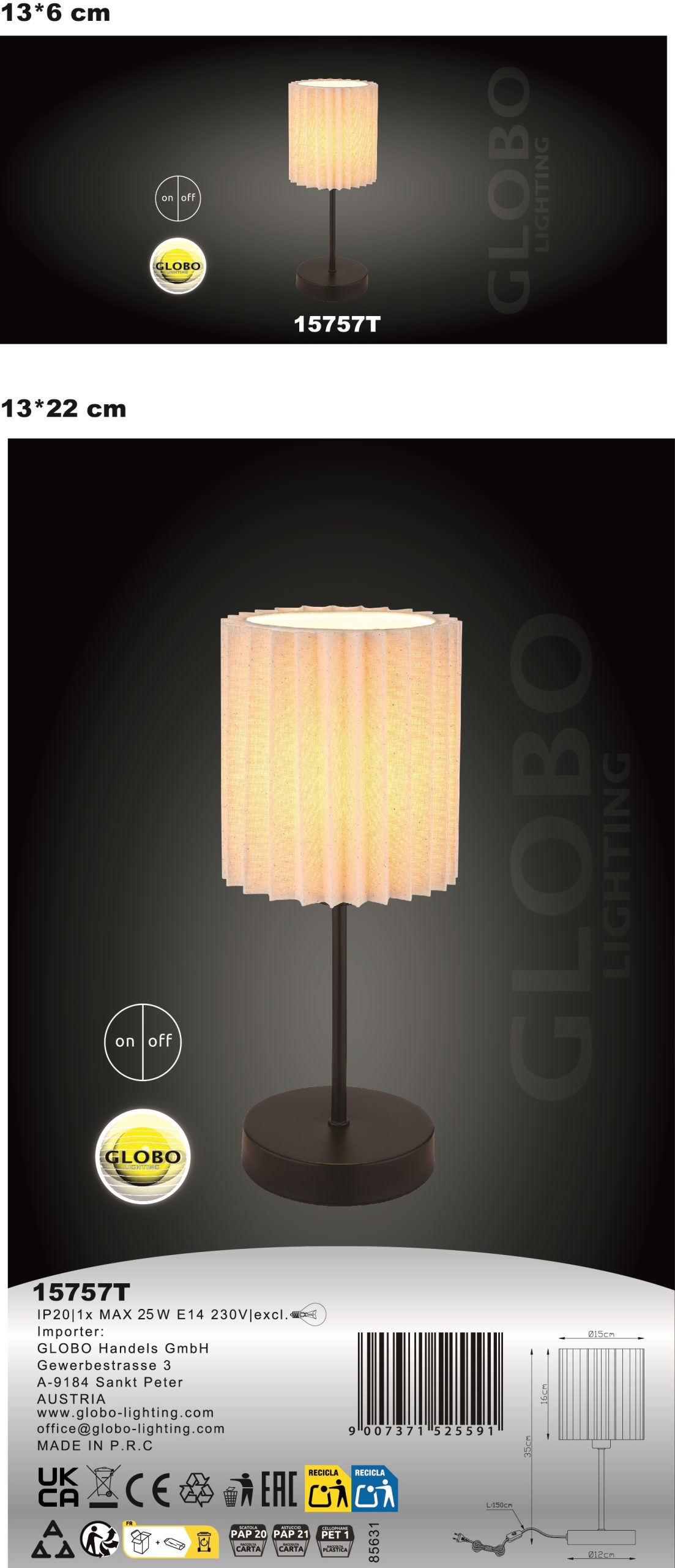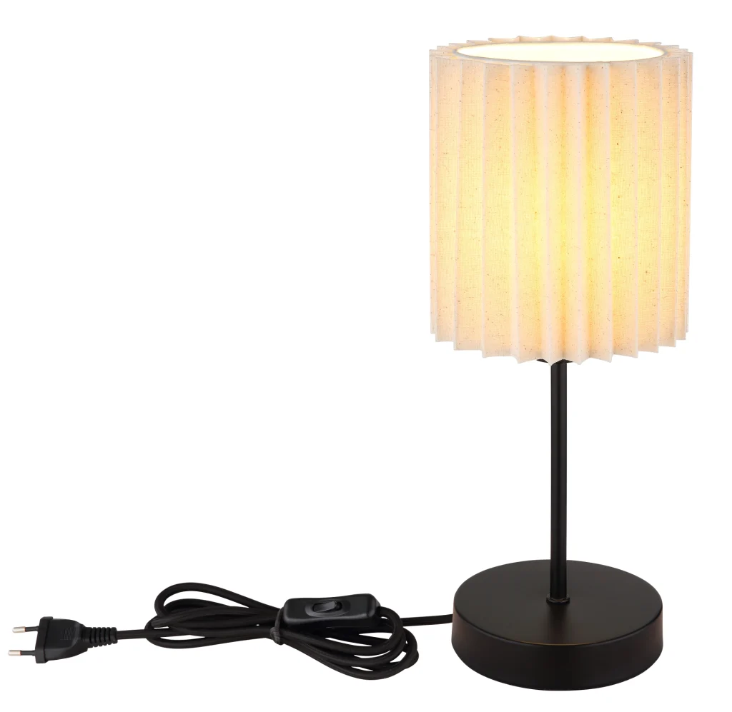 Stona lampa PAGE kombinuje tradicionalni dizajn sa modernom elegancijom i pruža prijatno osvetljenje u svakoj prostoriji. Okrugli, cilindrični tekstilni abažur sa finim naborima u tekstilu prirodne boje daje lampi topao i privlačan izgled. Telo napravljeno od crnog, mat metala zaokružuje klasičan dizajn i besprekorno se uklapa u različite stilove enterijera. Sa prečnikom od 150 mm, stona lampa je kompaktna i idealna je za bočne stočiće, noćne stočiće ili kao dekorativni element u bilo kojoj prostoriji. Prekidač na kablu omogućava lako rukovanje, tako da svetlo možete lako uključiti ili isključiti. Stona lampa PAGE je opremljena grlom E14, što vam omogućava da izaberete pravi izvor svetlosti prema vašim potrebama. Nudeći i funkcionalno i estetsko osvetljenje, ova lampa je savršen izbor i za tradicionalne i za moderne enterijere.