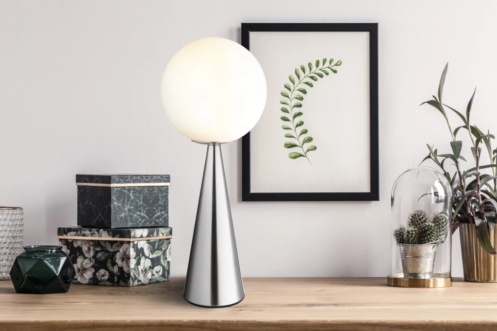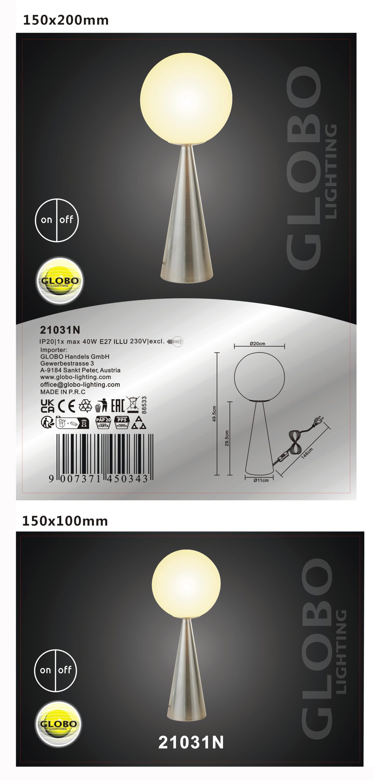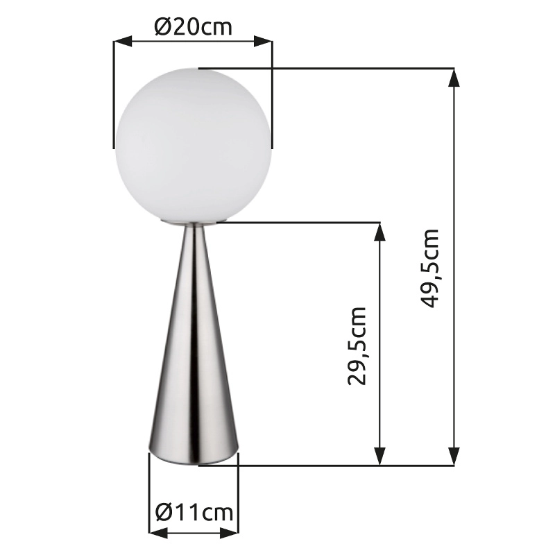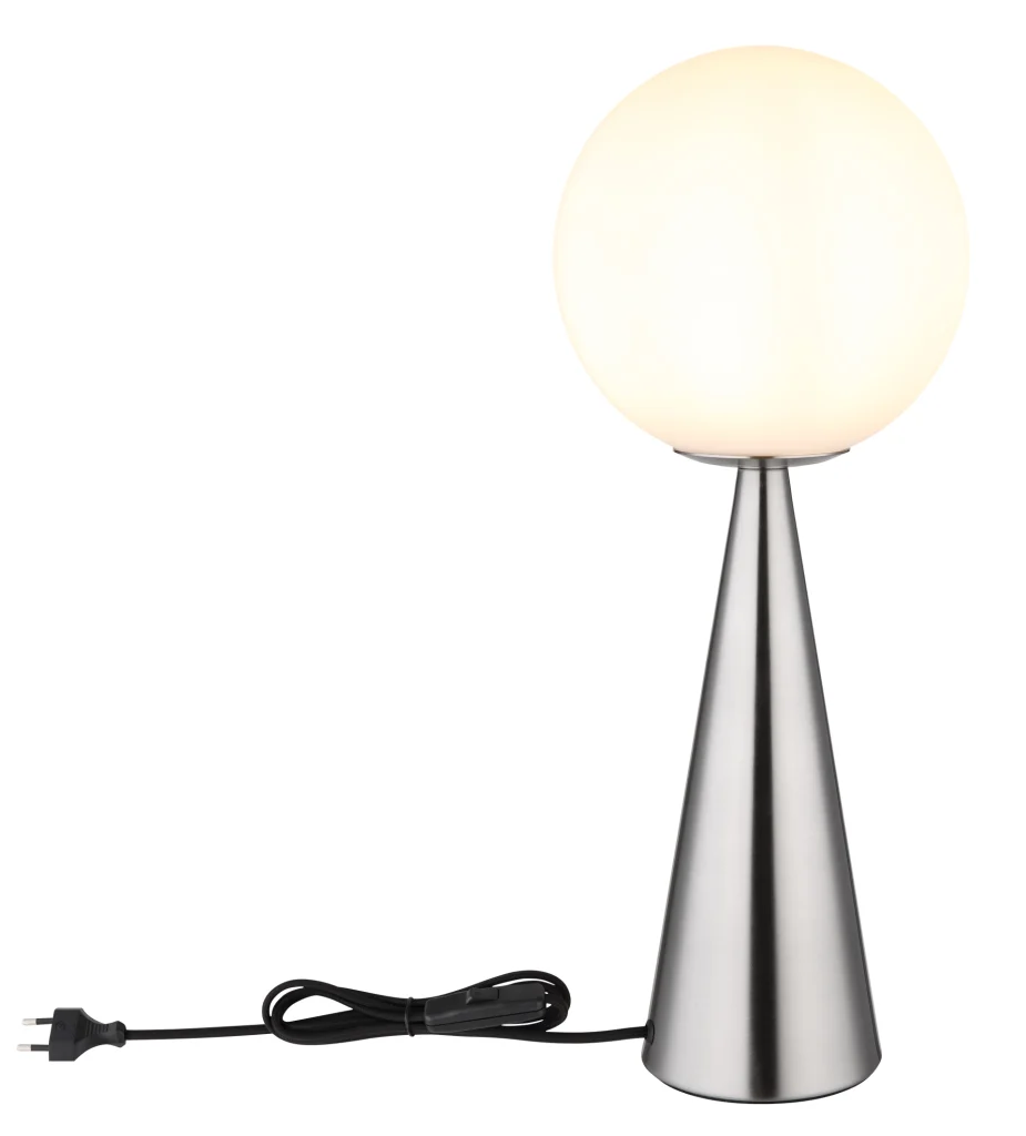 Šik konusna stona lampa ubeđuje svojim modernim dizajnom i visokokvalitetnom izradom. Konusno telo napravljeno od mat nikla daje lampi bezvremenski i elegantan izgled. Opalno bela staklena kugla kao abažur pruža prijatno osvetljenje bez odsjaja. Sa prečnikom od 200 mm i snagom od 40 W, stona lampa nudi dovoljnu osvetljenost za različite namene. Grlo E27 omogućava upotrebu različitih izvora svetlosti i individualno podešavanje svetla. Praktični prekidač na kablu olakšava rukovanje svetiljkom. Ova konusna stona lampa je idealna kao dekorativni element i izvor svetlosti u dnevnim sobama, spavaćim sobama ili radnim prostorima. Postavite stilske akcente ovom stonom lampom i stvorite ugodnu atmosferu u svom domu.
