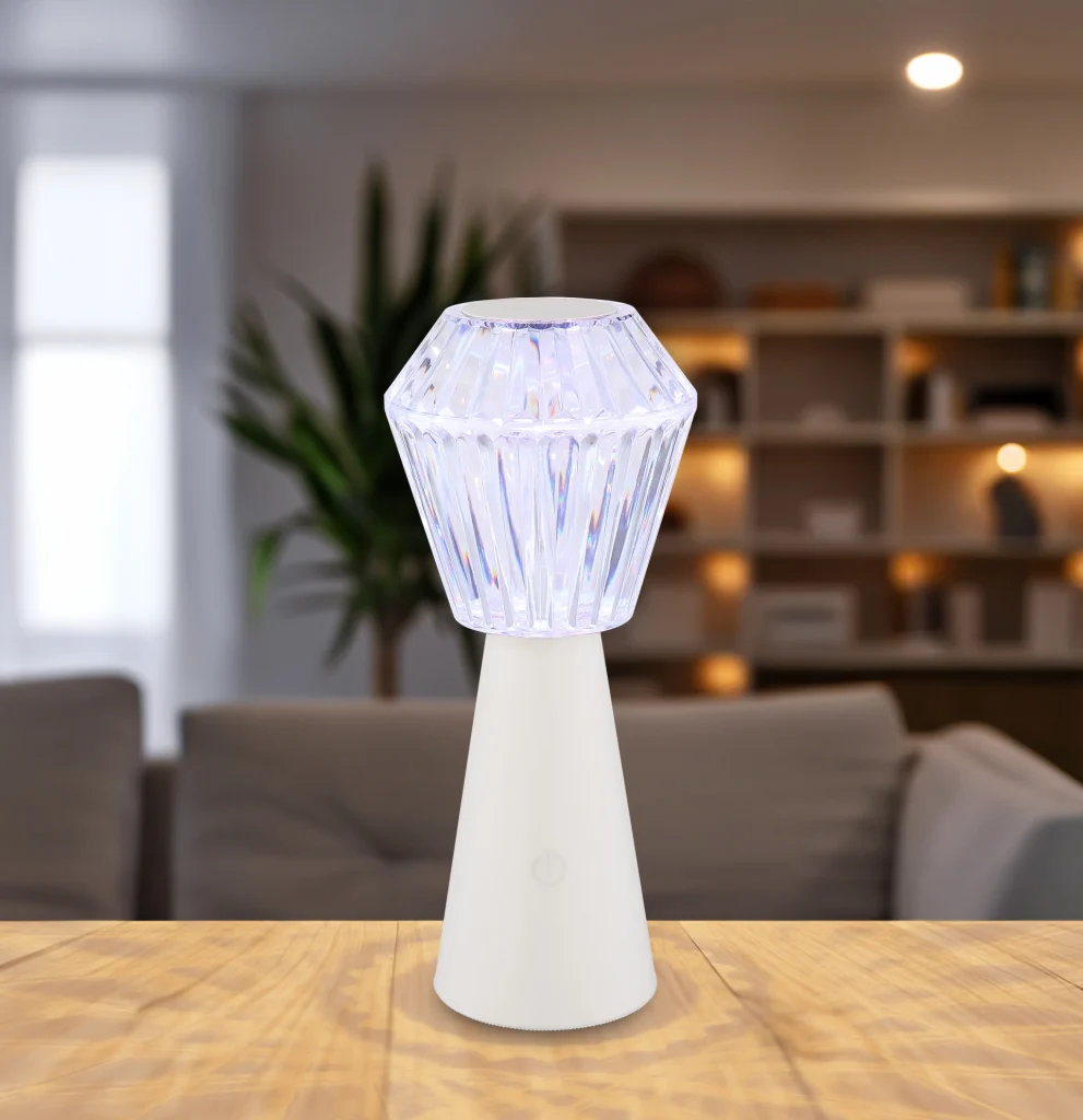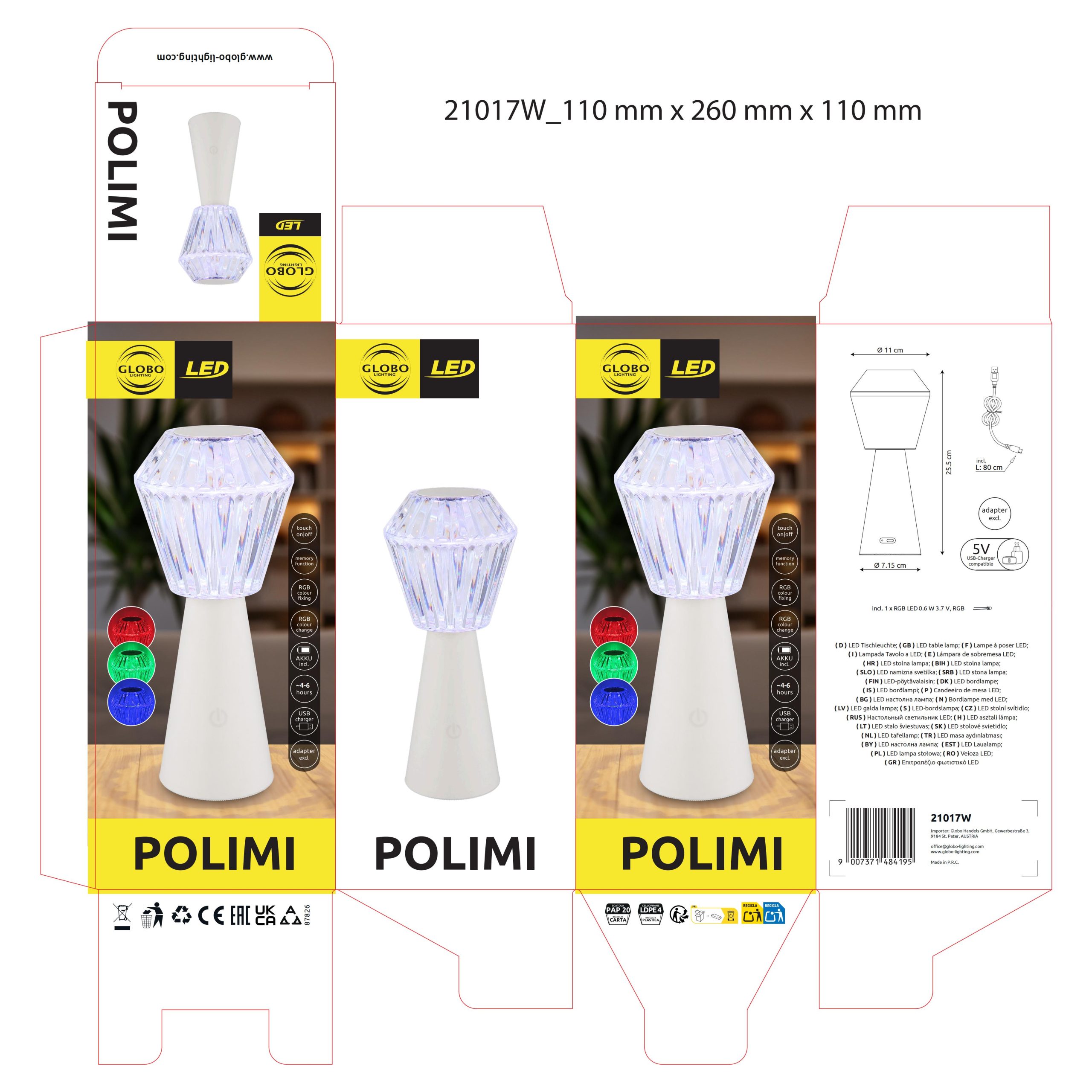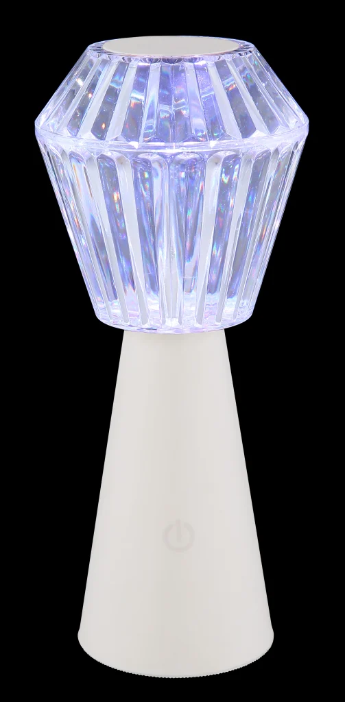 Stona lampa POLIMI ubeđuje svojim modernim i elegantnim dizajnom u okruglom obliku čaše. Mat belo plastično kućište i providni abažur sa očaravajućim kristalnim efektom stvaraju harmoničnu kombinaciju koja se uklapa u svako životno okruženje. Sa prečnikom od 110 mm, lampa je idealna za stolove, noćne stočiće ili police. Posebna karakteristika POLIMI-ja je integrisana RGB promena boje, koja vam omogućava da podesite i fiksirate boju svetlosti po želji. Zahvaljujući praktičnoj funkciji memorije, vaša željena podešavanja svetlosti se čuvaju, tako da uvek možete da pređete na željeno raspoloženje jednim klikom. Inovativna funkcija uključivanja/isključivanja na dodir čini rukovanje posebno jednostavnim. Adapter i USB kabl za punjenje su uključeni u obim isporuke. Nakon kratkog vremena punjenja od oko 4 sata, lampa nudi vreme osvetljenja do 6 sati. Još jedna prednost: POLIMI se takođe pali tokom procesa punjenja. Sa svetlosnom efikasnošću od 15 lumena i uključenom RGBV LED diodom, unosi ne samo stil, već i prijatnu atmosferu u vaš dom.