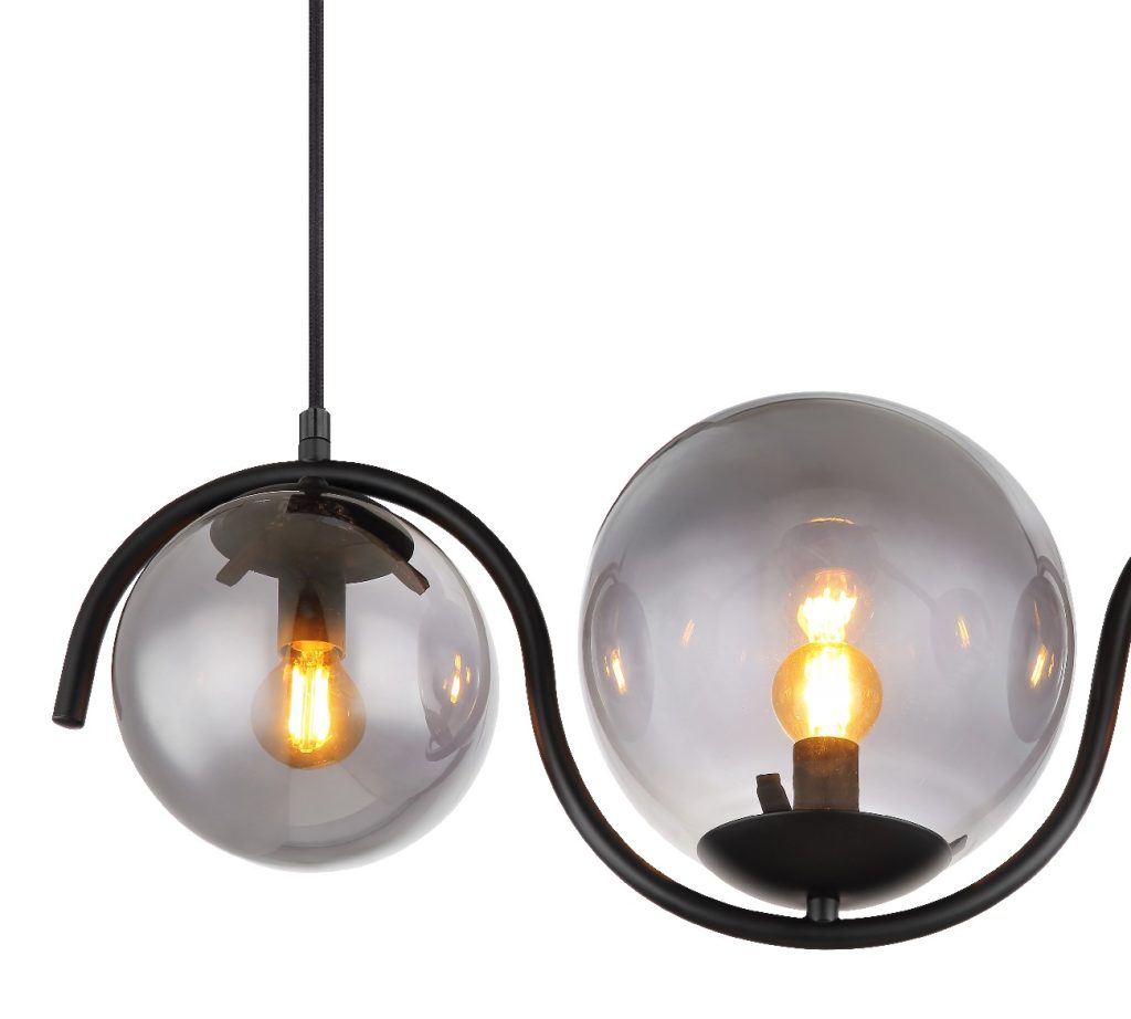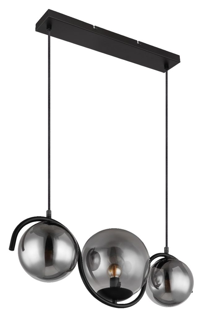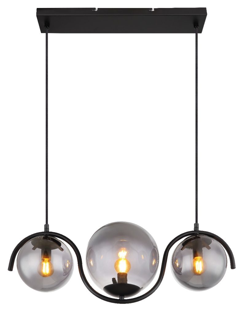 Ova visilica impresionira sjajnim dizajnom. Dva crno mat kabla dužine 1,2 m se pružaju od uske plafonske osnove do metalne šipke u obliku slova S, na kojoj se nalaze tri E14 grla sa oblikovanim staklenim abažurima u boji dima. E14 grla vam omogućavaju da odredite boju svetla i jačinu do maksimalnog izlaza od 25 vati. Zbog dugovečnosti i uštede energije preporučujemo LED sijalice.