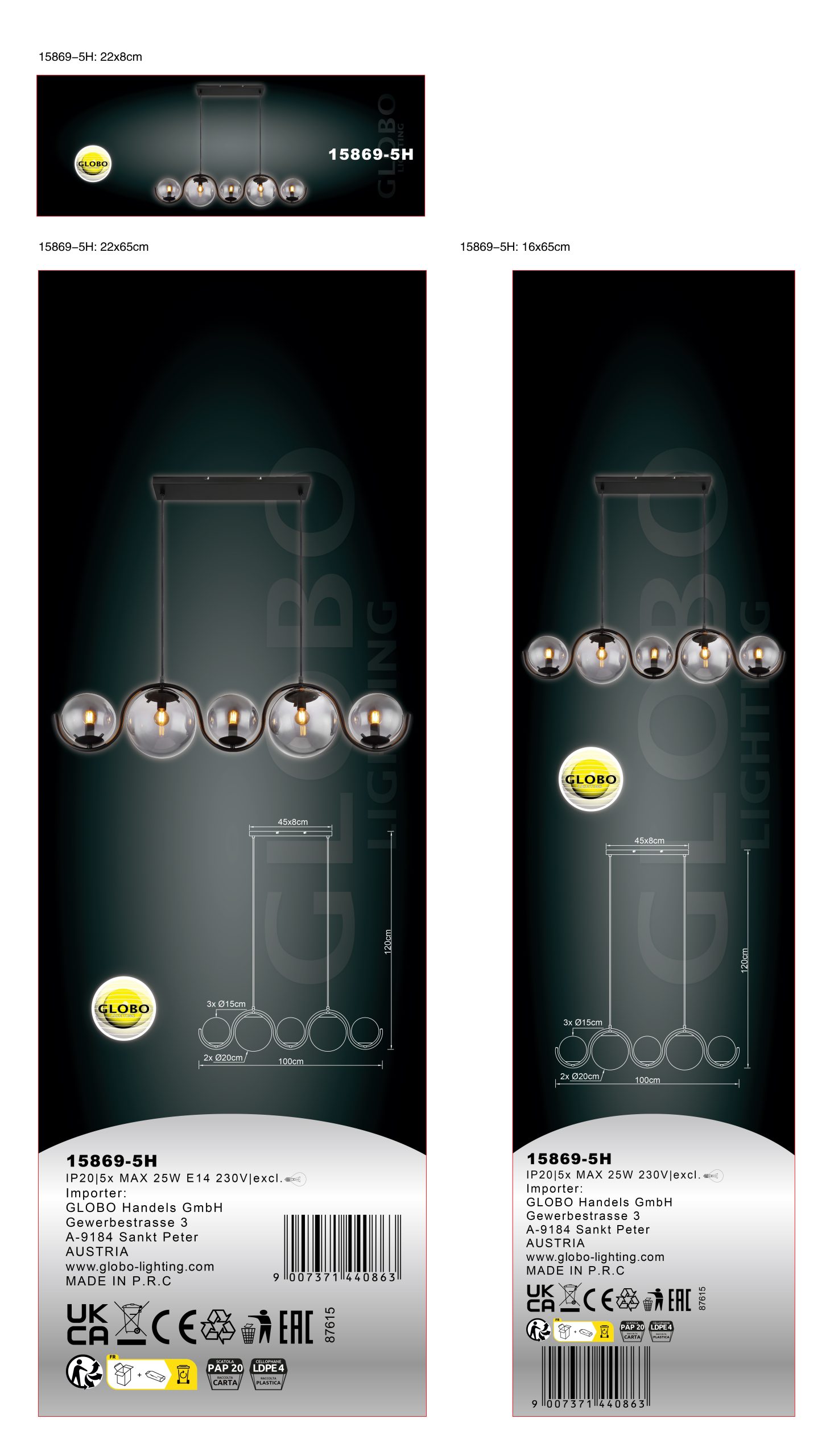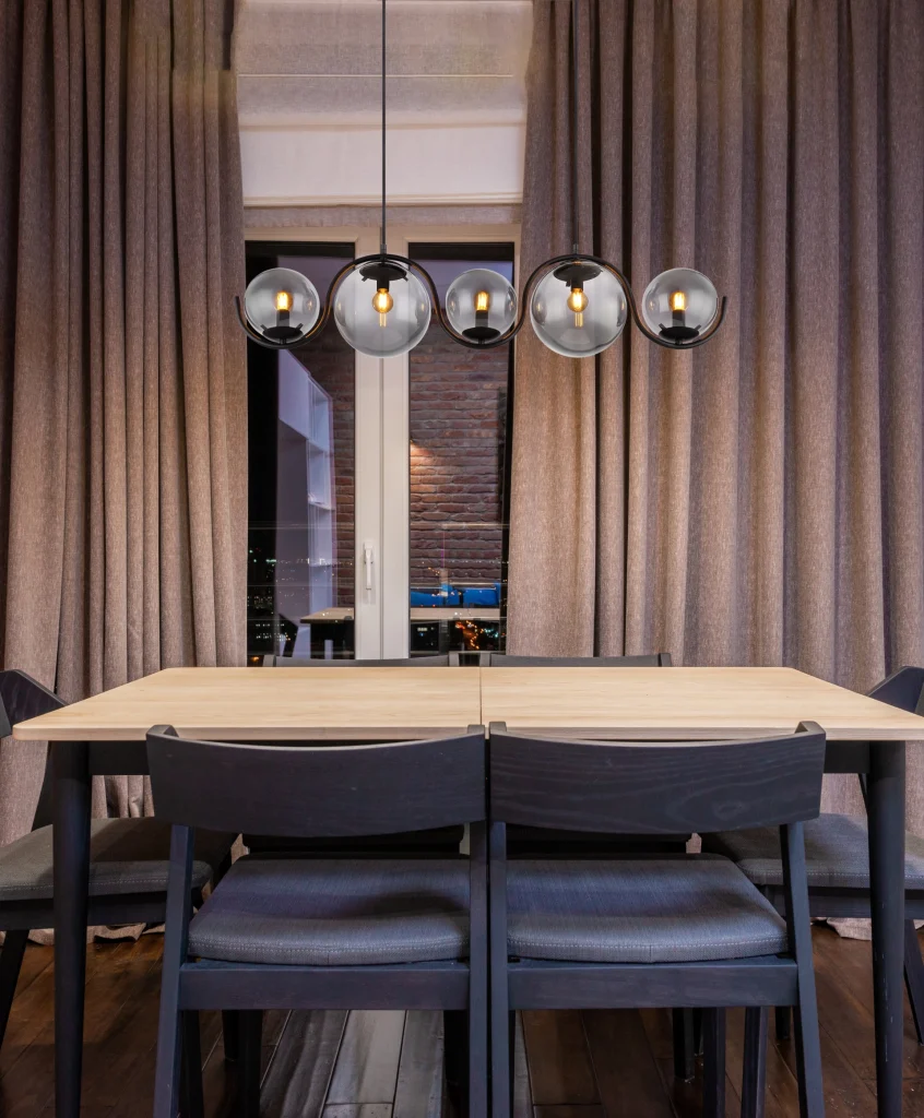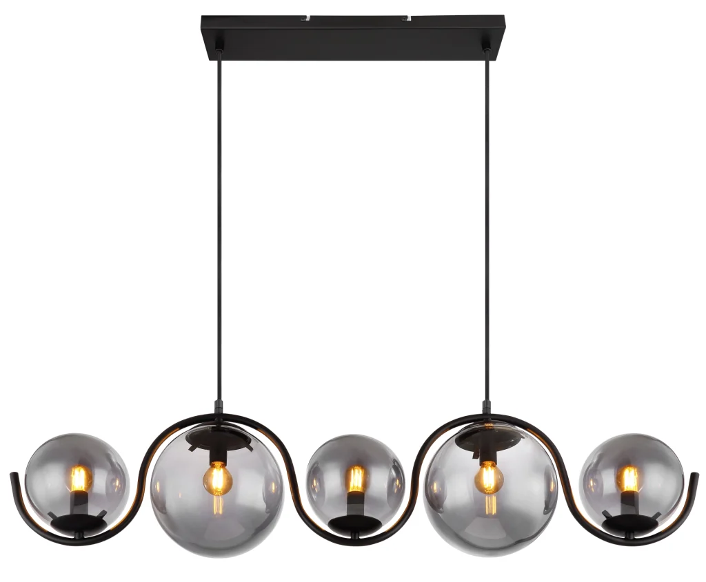 Ova plafonska lampa inspiriše odličnim dizajnom. Od uskog plafonskog nosača, dva crna mat kabla se protežu do 1,2 m do metalne šipke u obliku slova S, na kojoj se nalazi pet E14 grla, svako sa oblikovanim staklenim abažurima boje dima. E14 grla vam omogućavaju da sami određujete boje svetlosti i osvetljenost do maksimalne snage od 25 vati. Zbog dugotrajnosti i uštede energije, preporučujemo LED sijalice.