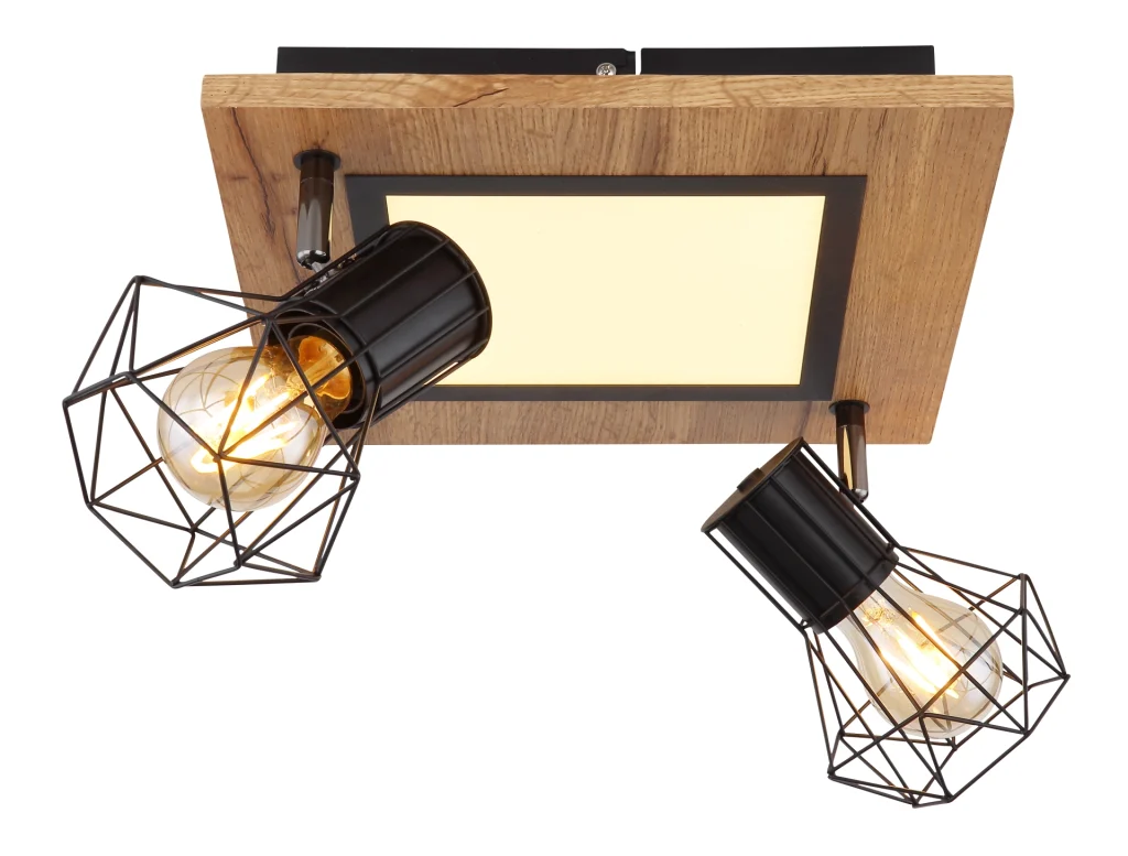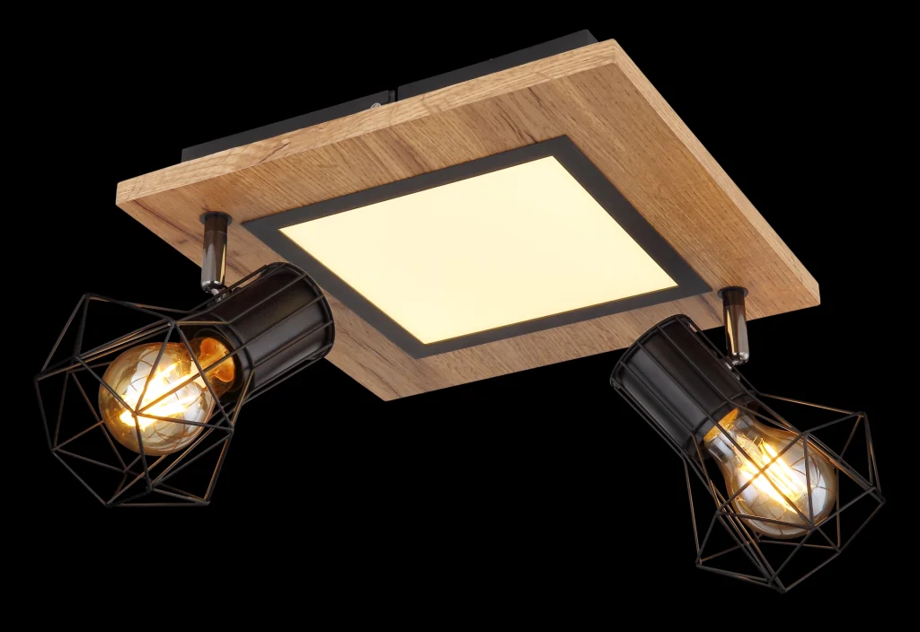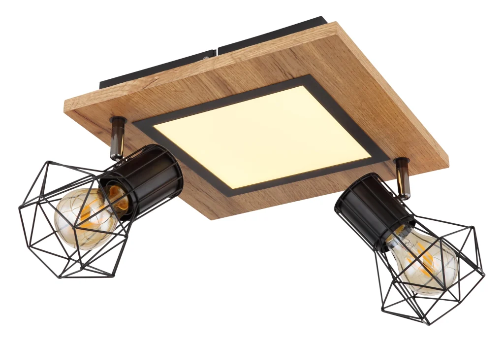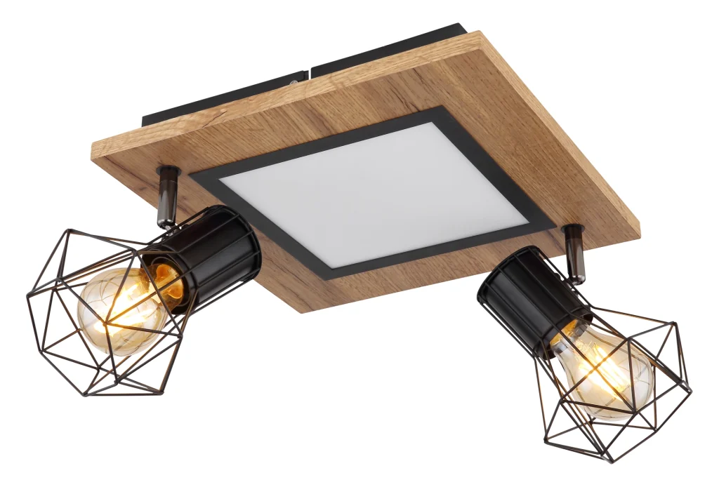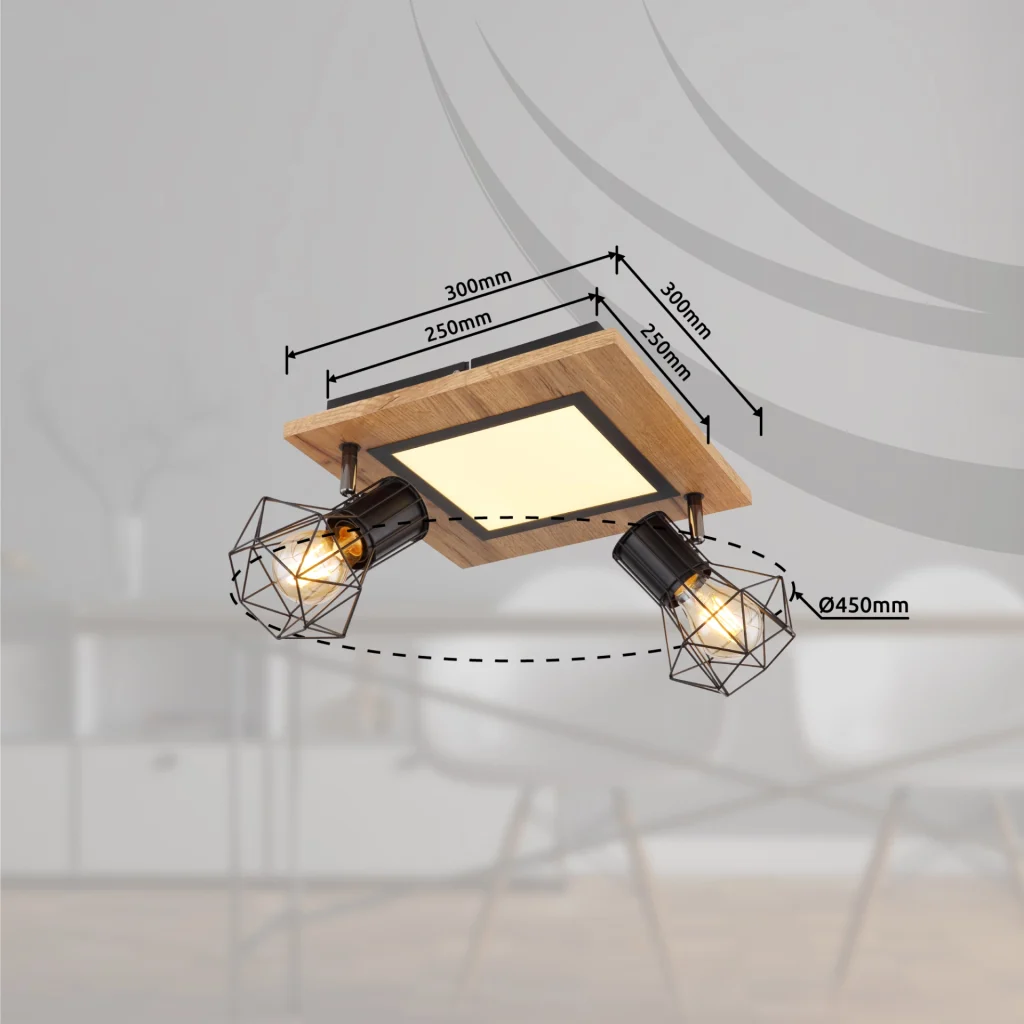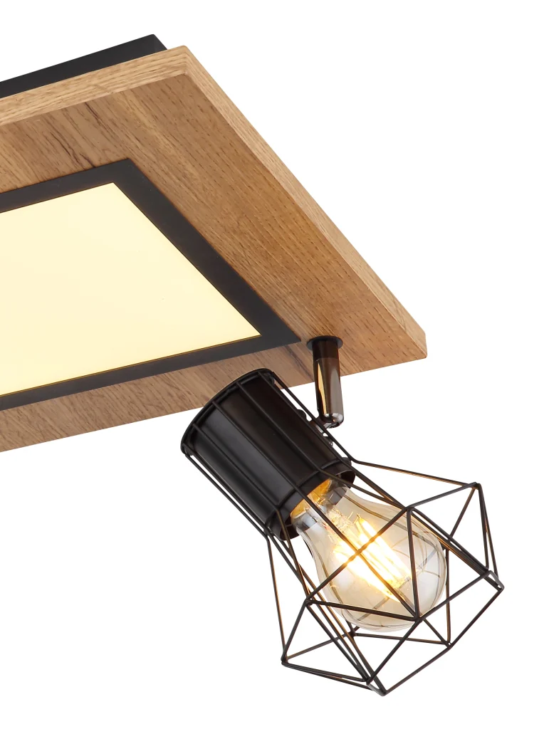 Ova kvadratna plafonska lampa inspiriše svojim sjajnim izgledom. LED panel se nalazi u sredini drvenog panela (30×30 cm) sa dva dodatna E27 grla sa oblikovanim metalnim rešetkastim abažurima. Panel pruža toplo belo svetlo od 3000 Kelvina i ima snagu od 12 W. Funkcija memorije vam omogućava da sačuvate poslednje korišćena podešavanja.