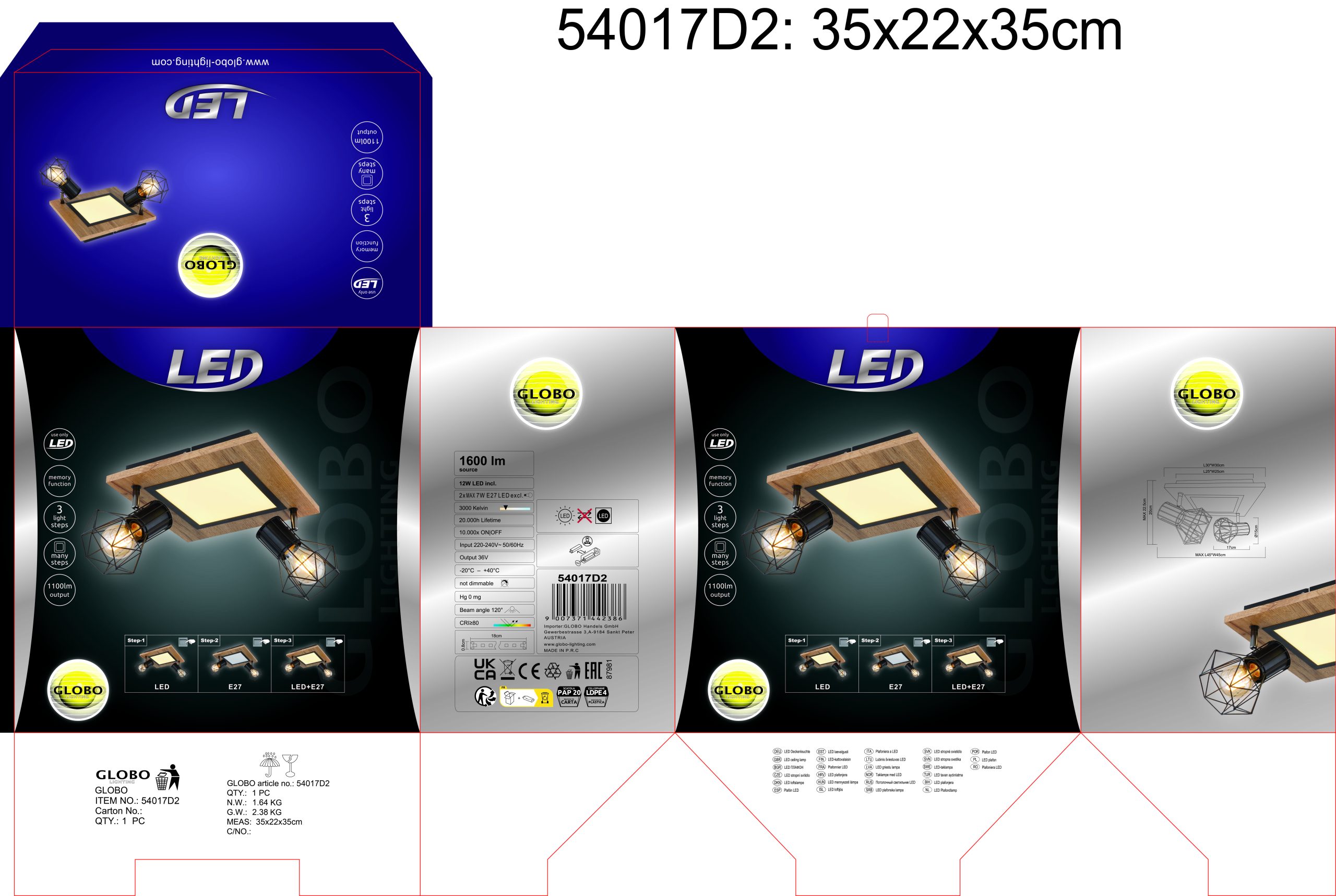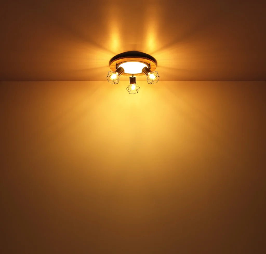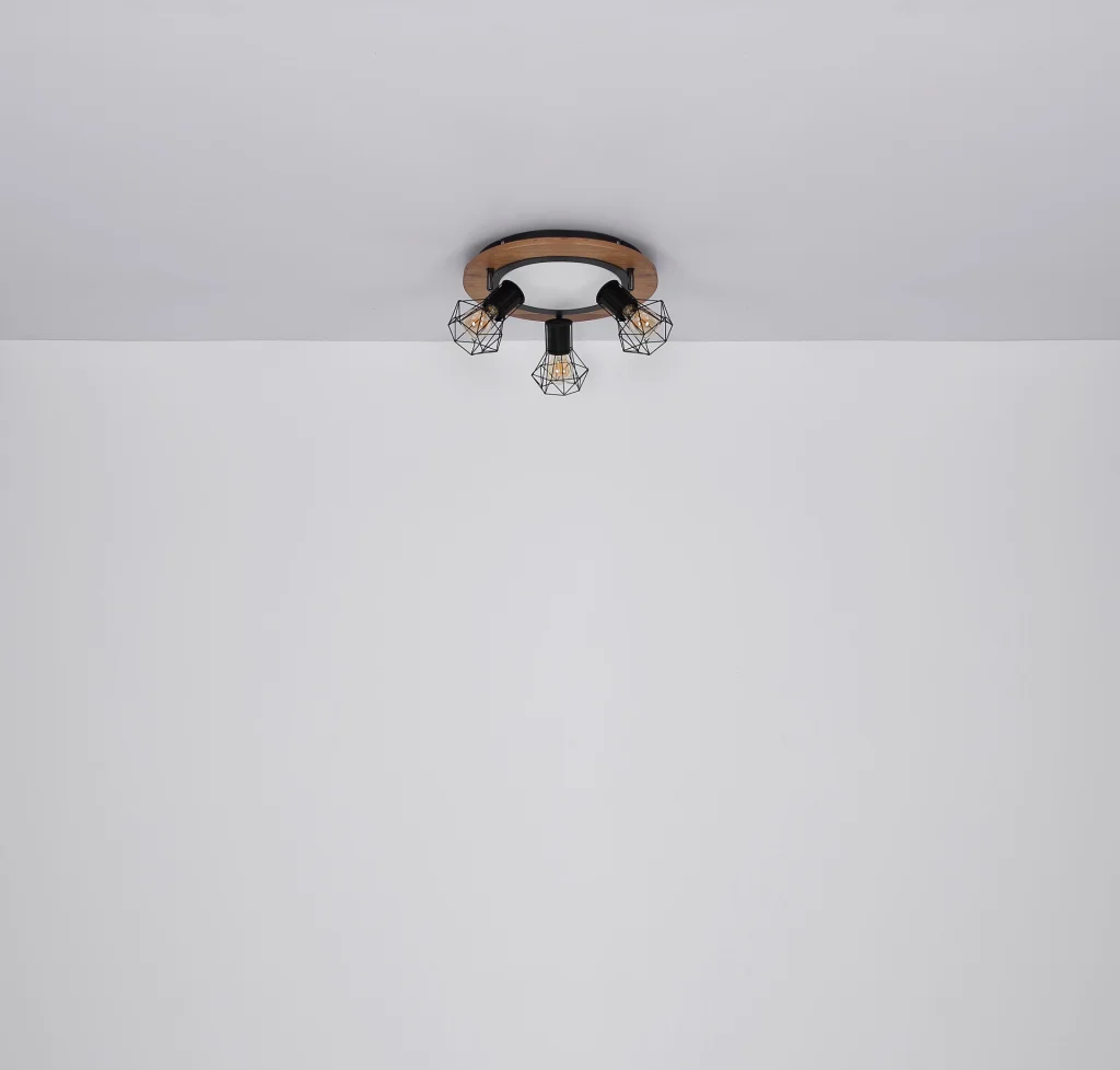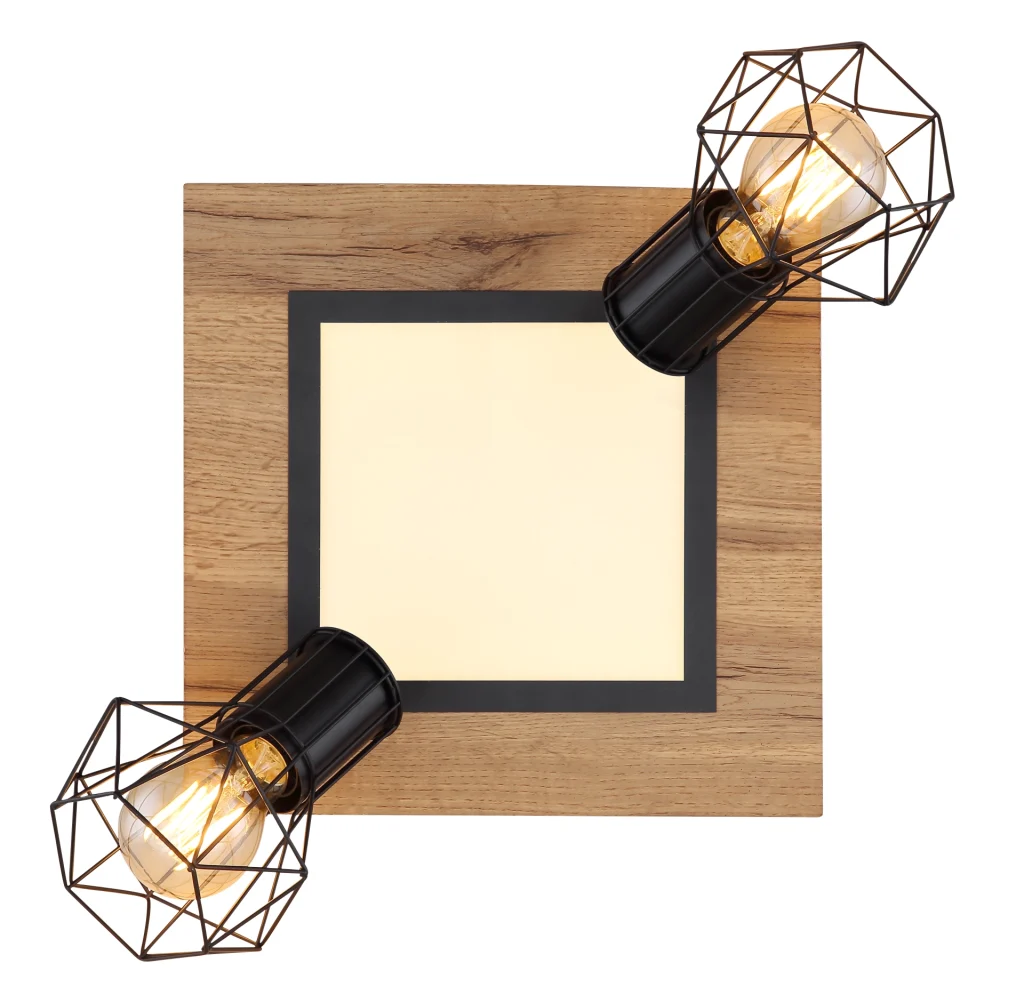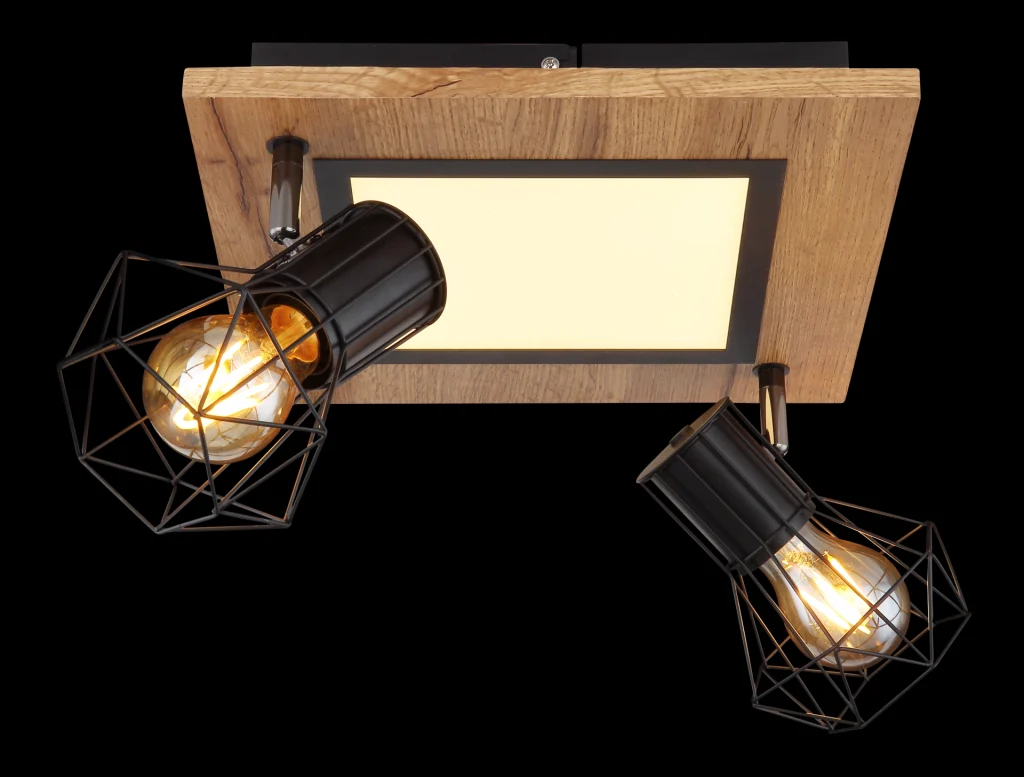 Ova kvadratna plafonska lampa inspiriše svojim sjajnim izgledom. LED panel se nalazi u sredini drvenog panela (30×30 cm) sa dva dodatna E27 grla sa oblikovanim metalnim rešetkastim abažurima. Panel pruža toplo belo svetlo od 3000 Kelvina i ima snagu od 12 W. Funkcija memorije vam omogućava da sačuvate poslednje korišćena podešavanja.
