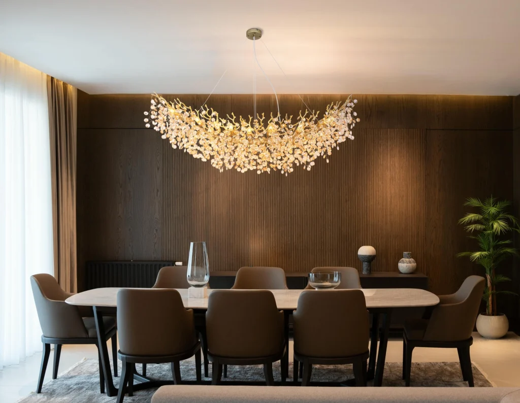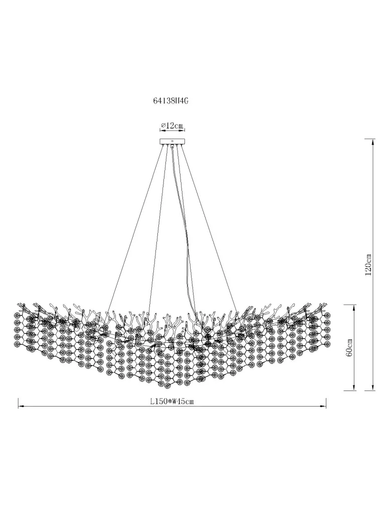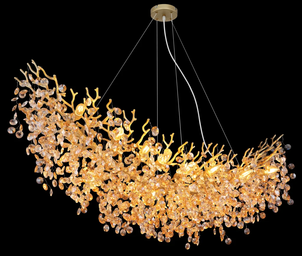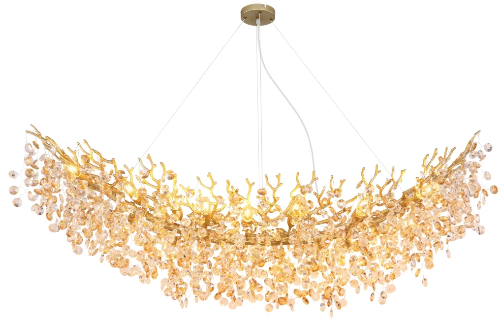 QUEENA – Ovalni luster sa 16 kristalnih privesaka. Ovalni luster QUEENA impresionira svojim elegantnim dizajnom i impresivnom izradom. Njegovo vešto razgranato telo, napravljeno od metala mat zlatne boje, podseća na nežne grane i daje svetlosti prirodnu, luksuznu auru. Ukrašen blistavim staklenim kristalima u ćilibarnoj i providnoj boji, luster stvara fascinantnu interakciju svetlosti i senke, dajući svakoj prostoriji toplu, privlačnu atmosferu. Sa svojih 16 E14 grla, QUEENA pruža obilje svetlosti i idealna je za prostrane dnevne i trpezarijske boravke, kao i za formalne prostore. Integrisani flekso elementi na grlima omogućavaju fleksibilno podešavanje izvora svetlosti, omogućavajući vam da individualno prilagodite svetlost svojim potrebama. QUEENA kombinuje klasični glamur sa modernom funkcionalnošću i postaje blistavi centralni deo svakog enterijera. E14 sijalice nisu uključene.