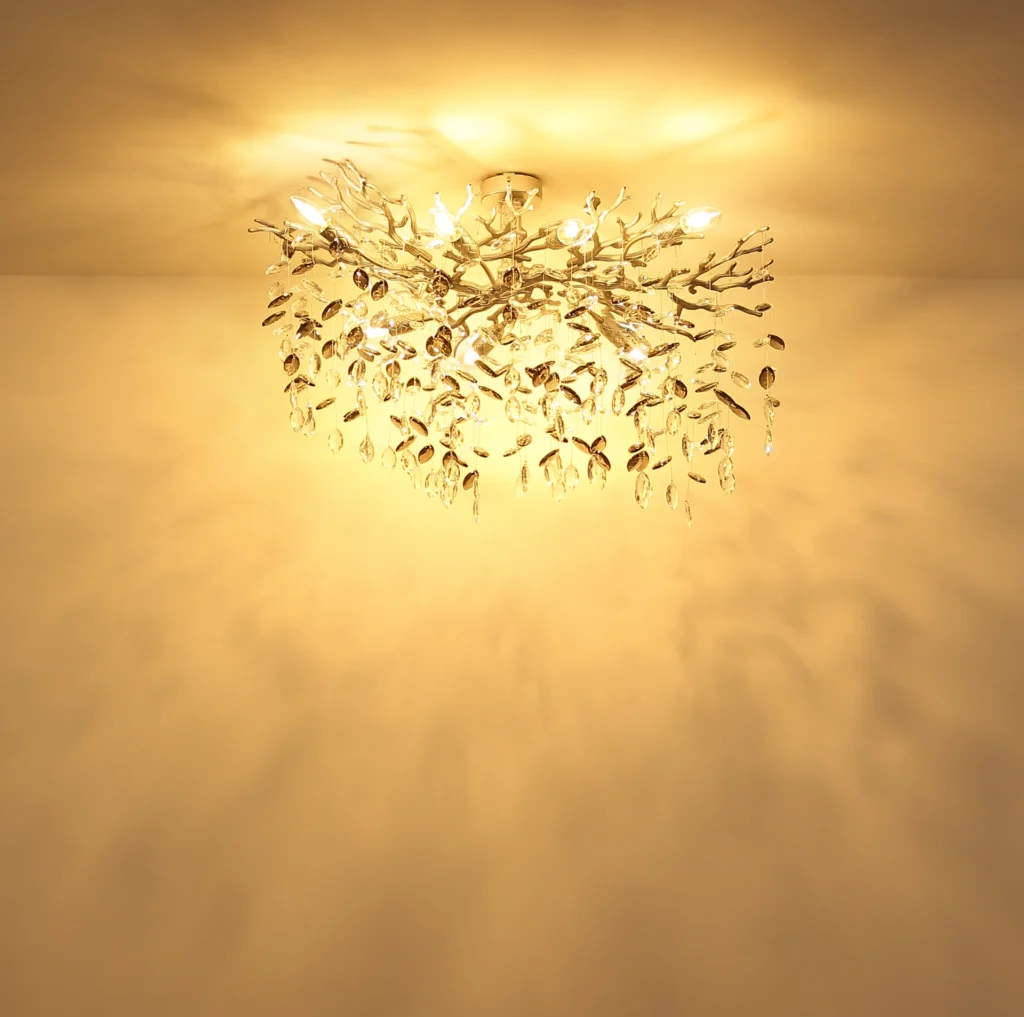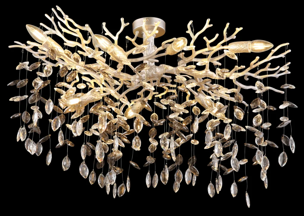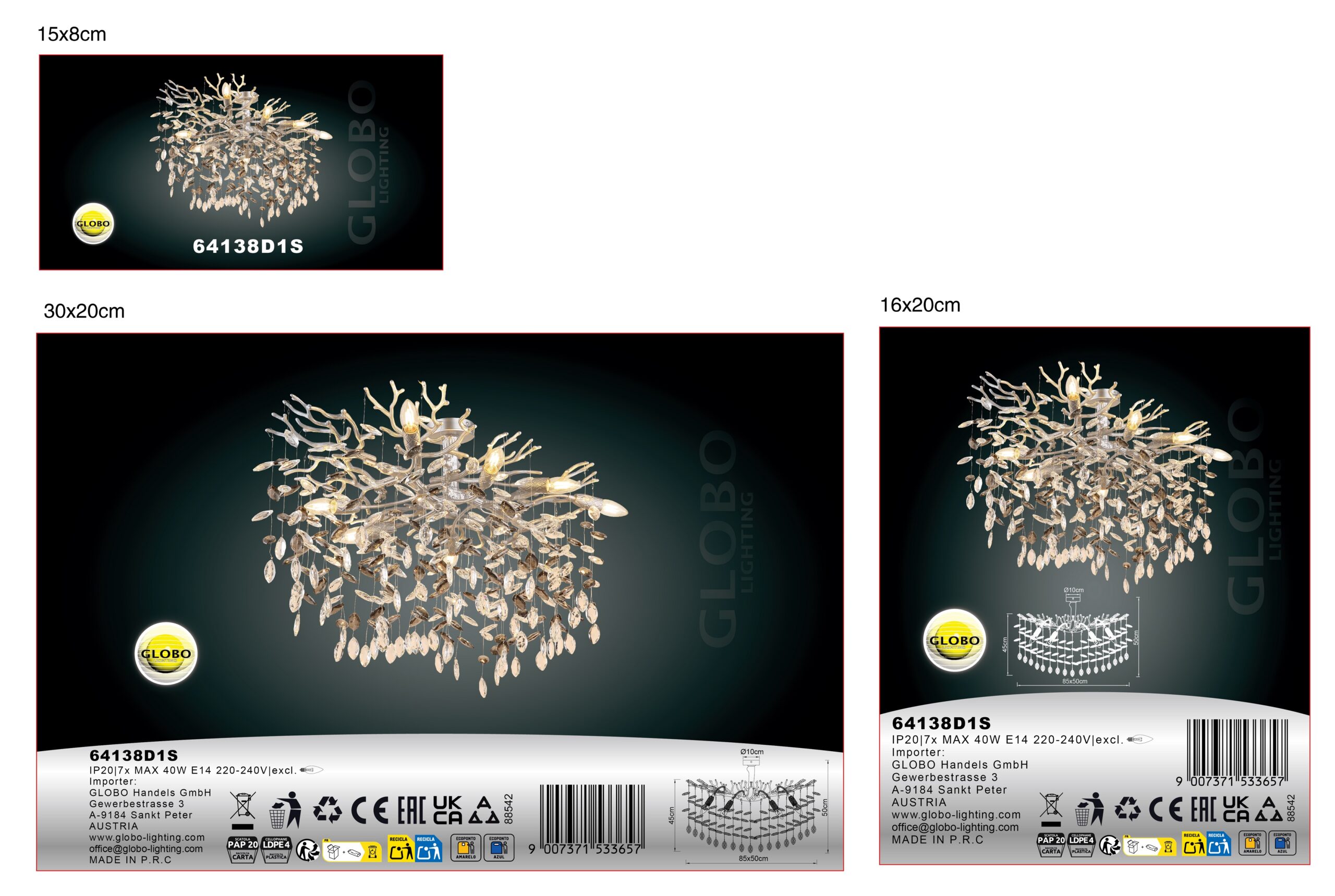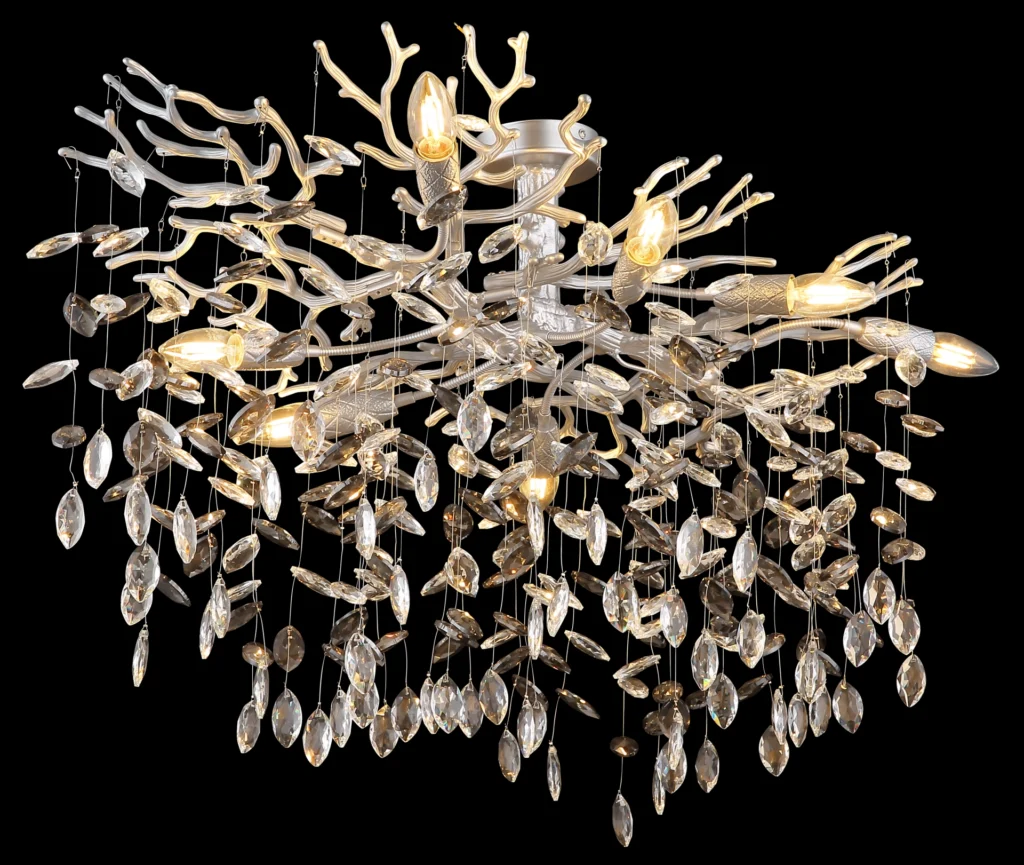 QUEENA – Stilska plafonska lampa sa kristalnim šarmom. Ovalna plafonska lampa QUEENA kombinuje sofisticirani dizajn sa blistavim detaljima, dodajući stilske akcente svakoj prostoriji. Umetnički razgranato telo napravljeno od mat srebrnog metala podseća na nežne grane i upotpunjeno je visokokvalitetnim kristalnim privescima od dimljenog i providnog stakla – fascinantna interakcija oblika i svetlosti. Opremljena sa sedam E14 grla, QUEENA nudi fleksibilna rešenja za osvetljenje dnevne sobe, trpezarije ili ulaze. Flekso elementi na grlima omogućavaju individualno podešavanje izvora svetlosti – za ciljane akcente osvetljenja i atmosferski ambijent. Kombinacija moderne srebrne završne obrade i blistavih staklenih kristala daje svetlu elegantan, pomalo ekstravagantan izgled. E14 sijalice nisu uključene.