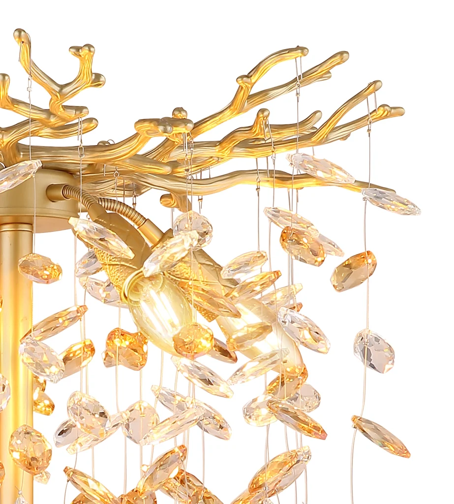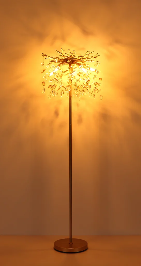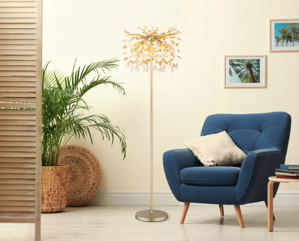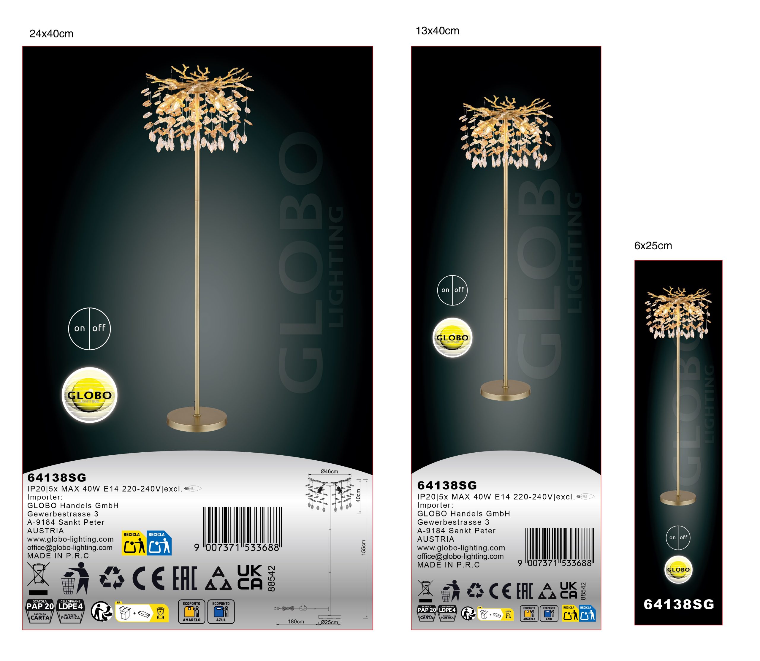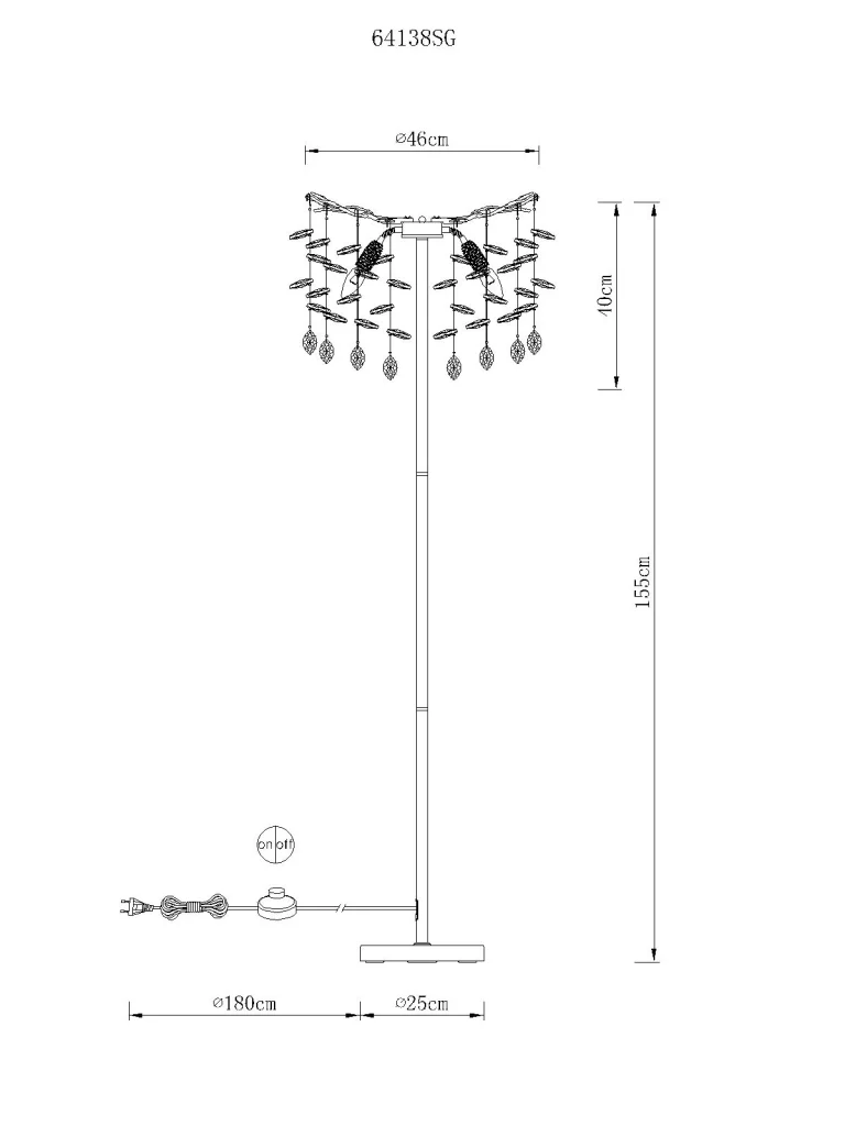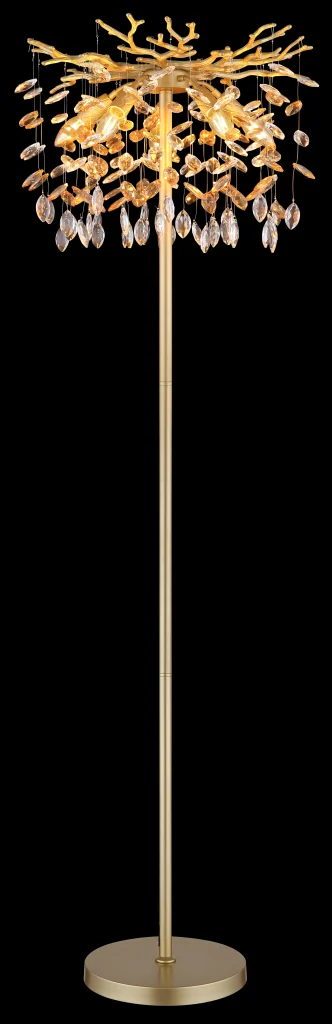 QUEENA – Okrugla podna lampa sa kristalnim visećim lampama i elegantnim dizajnom. Okrugla podna lampa QUEENA unosi glamurozni šarm i stilske akcente osvetljenja u vaš dom. Umetnički razgranato telo napravljeno od mat zlatnog metala podseća na nežne grane i poboljšano je elegantnim ćilibarnim i providnim staklenim kristalima. Oni impresivno prelamaju svetlost i stvaraju topao, privlačan ambijent. Opremljena sa pet E14 grla, QUEENA pruža dovoljno svetlosti za dnevni boravak ili prostor za spavanje. Integrisani flekso elementi na grlima omogućavaju individualno podešavanje izvora svetlosti, stvarajući ciljano osvetljenje ili atmosferske akcente. Praktično se upravlja pomoću nožnog prekidača na kablu, što je diskretan i jednostavan za korišćenje. Sa svojom harmoničnom kombinacijom prirodnog dizajna i luksuznih detalja, QUEENA postaje stilski ukras u svakom enterijeru. E14 sijalice nisu uključene.