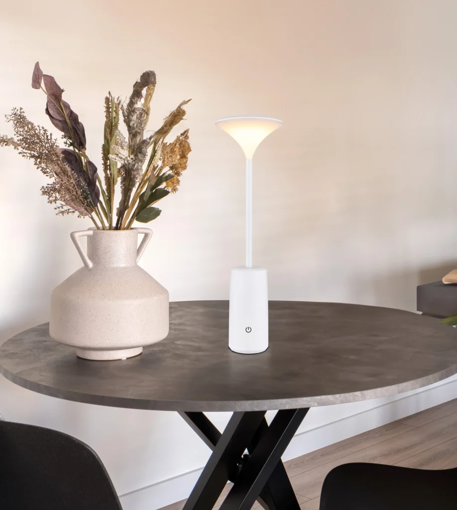 Stona lampa QUIRIN u mat beloj boji je stilski i praktičan dodatak za vaš dom. Kućište od plastike i metala daje lampi moderan izgled, dok opalni polikarbonatni abažur pruža meko i prijatno svetlo. Sa sistemom za uključivanje/isključivanje na dodir i besstepenim dodirnim dimerom, možete lako podesiti osvetljenost lampe prema vašim potrebama. Moćna baterija (CR18650 1500mAh 3.7V) omogućava vreme rada do 6 sati i može se puniti za oko 4 sata. Svetlo se ne može koristiti tokom punjenja. Stona lampa je opremljena energetski efikasnom LED lampom snage 1,2W i svetlosnog toka od 100lm, koja proizvodi prijatnu temperaturu svetlosti od 3000K. USB kabl je uključen, adapter se mora kupiti zasebno.