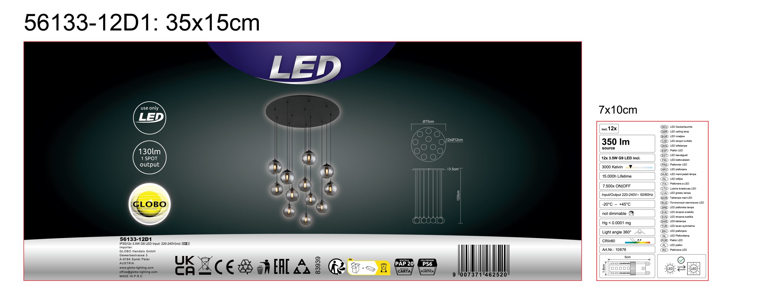 Plafonska lampa RIHA predstavlja se u okruglom dizajnu, koji je oslonjen na 12 vešalica sa staklenim kuglicama boje dima. Telo lampe je napravljeno od crnog lakiranog metala, koji ima mat površinu. Dimenzije plafonske lampe RIHA su ø 750 mm, što je čini idealnim rešenjem za velike prostorije. Svetiljka ima efektivni svetlosni izlaz od 130 lumena na temperaturi boje od 3000 K. Sa svojim staklenim sferama boje dima i mat površinom tela, plafonska lampa RIHA stvara jedinstvenu atmosferu. Sa svojim minimalističkim dizajnom i elegantnim abažurom od staklenih kuglica, plafonska lampa RIHA postaje stilski dodatak za uređenje enterijera.